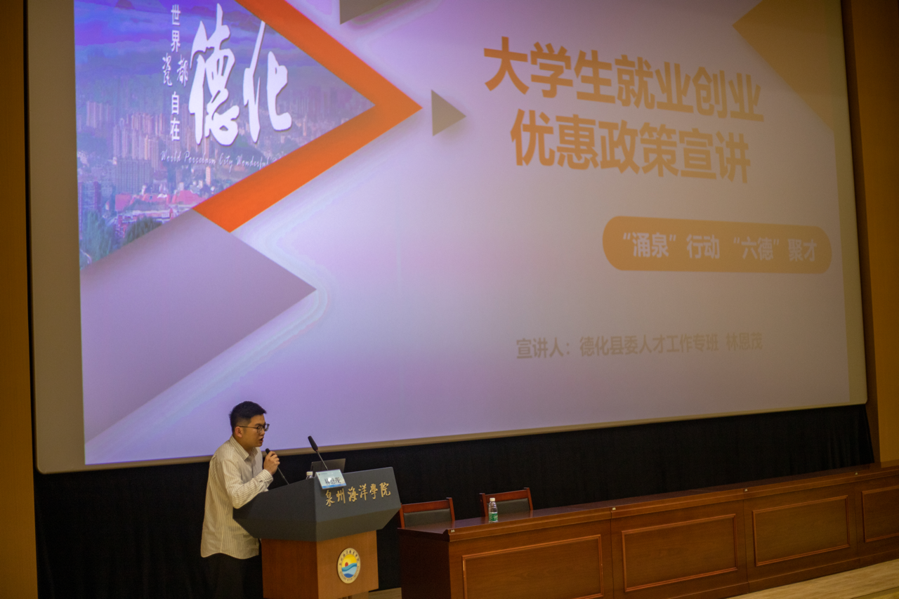 为进一步我校拓宽毕业生就业渠道和资源,全力促进我校毕业生高质量就业,3月23日,信息工程学院承办了德化引才校园行•泉州海洋职业学院专场政策座谈会,会议在我校图书馆二层会议室举行。德化县人力资源和社会保障局局长黄永怀携相关部门负责人就高校毕业生在德化就业创业优惠政策等进行宣讲。活动由我校信息工程学院党支部副书记温馨主持。
