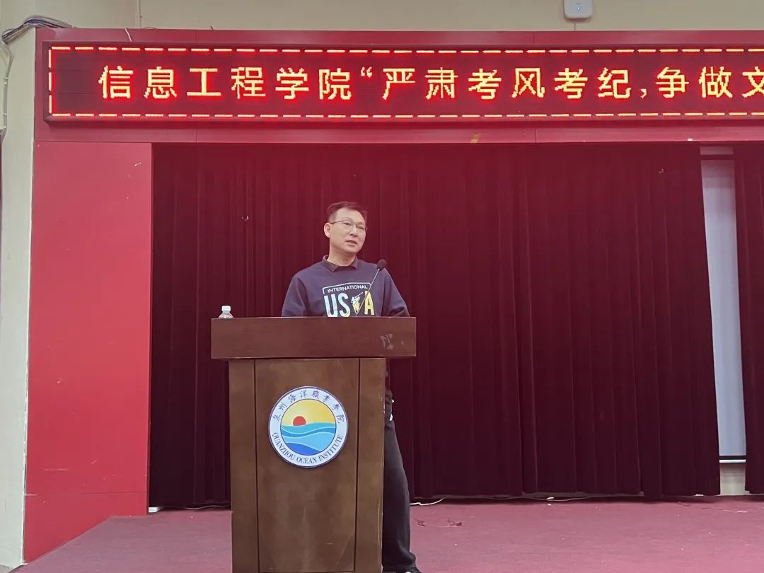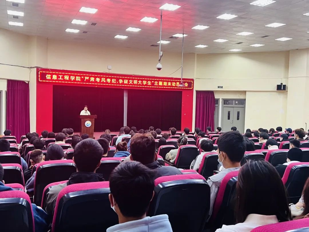 2022-2023学年度第一学期即将过去,按照信息工程学院领导班子统一要求,为了顺利迎接期末考试及完成本学期期末相关工作部署,信息工程学院于2022年12月12日下午在2204召开“严肃考风考纪,争做文明大学生”主题期末动员大会。信息工程学院院长贾超、党支部副书记温馨、全体辅导员及各班级班长、学习委员、军体委员参与了本次活动。