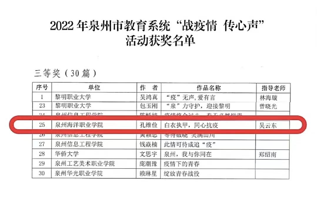 我院孔维俭同学踊跃参与,以声战疫,以笔传情,他的作品《白衣执甲,同心抗疫》荣获2022年泉州市教育系统“战疫情,传心声”活动大学生征文项目三等奖。(指导老师:吴云东)