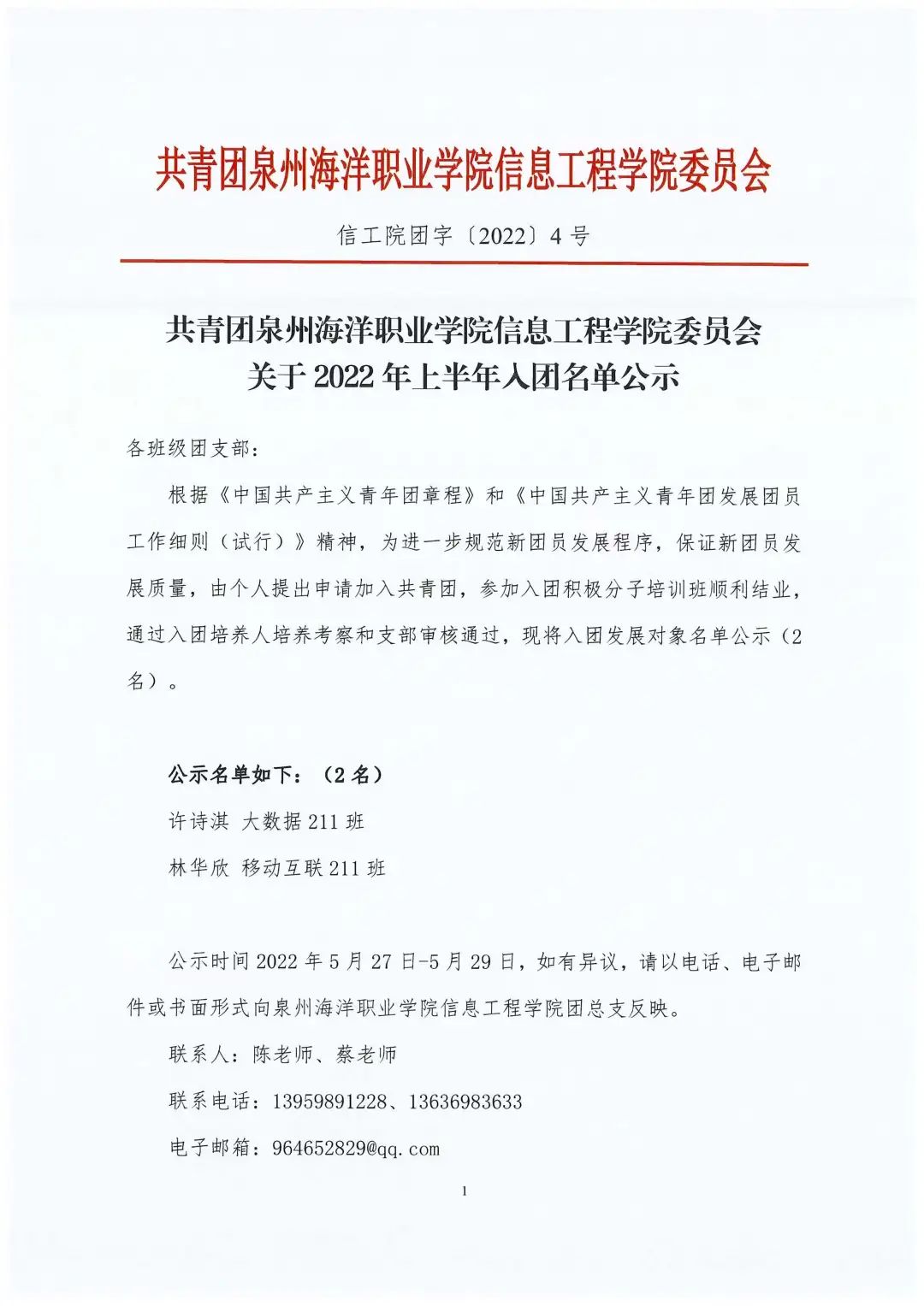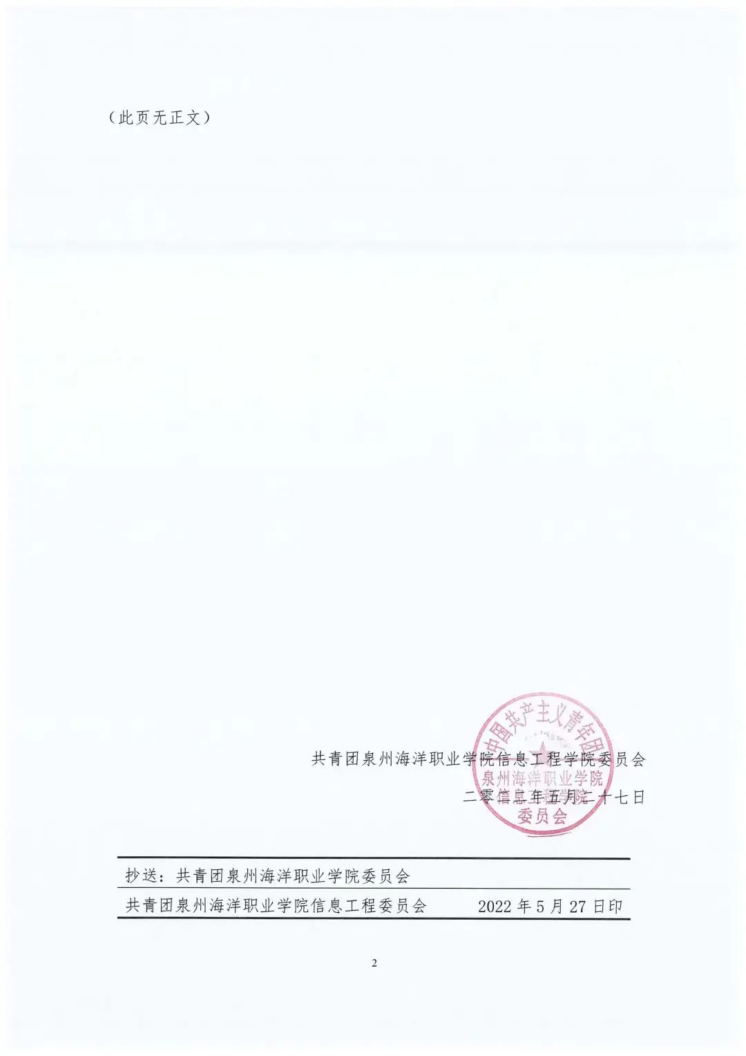 公示时间2022年5月27日-5月29日,如有异议,请以电话、电子邮件或书面形式向泉州海洋职业学院信息工程学院团总支反映。