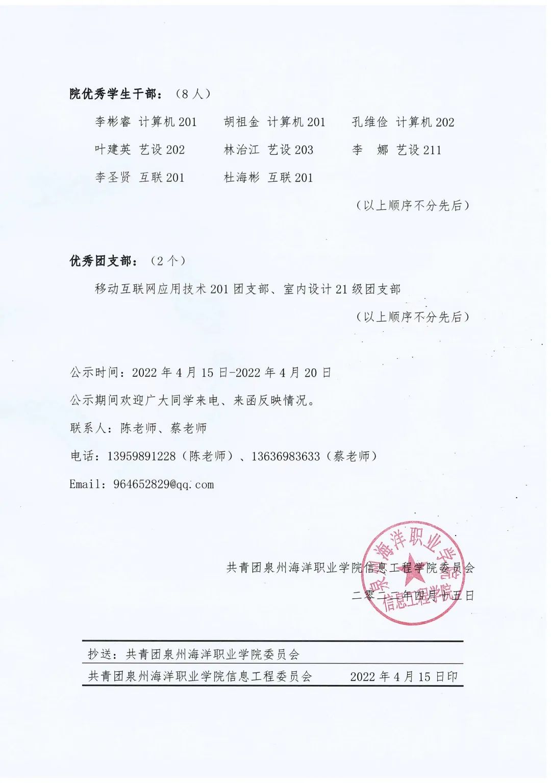 根据泉州海洋职业学院《关于开展2021-2022学年五·四评优工作的通知》经过评议小组评议,现将拟推荐2021-2022年信息工程学院根据共青团泉州海洋职业学院委员会《关于开展 2021-2022 学年 五·四评优工作的通知》文件要求,经评议小组评议,现将拟推荐 2021-2022 学年优秀共青团员、院级优秀共青团干部、优秀团支部的名单公示如下:
