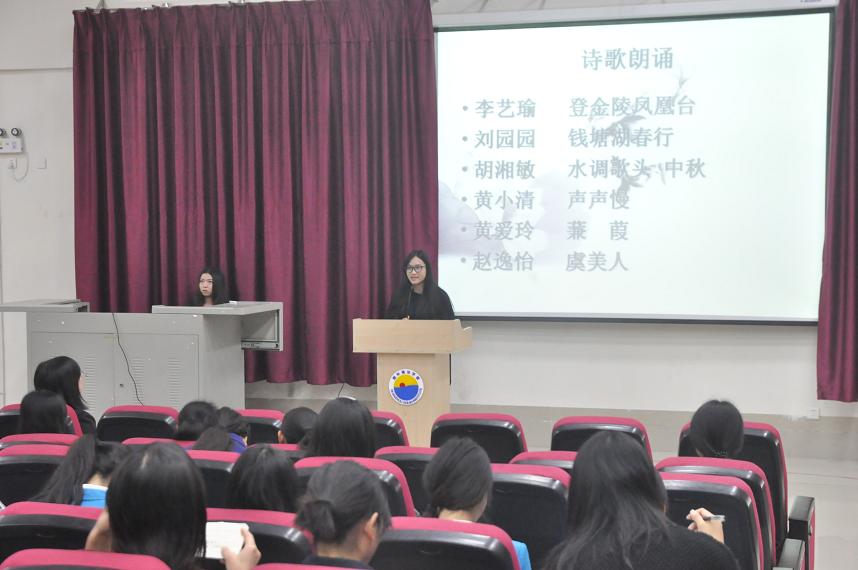 演出开始了。同学们依次上场,节目有序地进行着。或配乐朗诵或吟唱,或个人吟唱或集体朗诵,表现形式多样。根据古典诗词内容及情感特点,同学们的朗诵吟唱风格各异,或气势雄浑悲壮,或情感婉约缠绵,真可谓“八仙过海,各显神通”,把古典诗歌艺术境界之美演绎得十分充分。董灿荣朗诵李白的《将近酒》,陈天扬、方泽波朗诵苏轼的《念奴娇@赤壁怀古》,李泽斌朗诵岳飞的《满江红》,席仕林朗诵曹操的《短歌行》,林郁坤、侯依侗朗诵毛泽东的《沁园春@雪》,他们时而气势飞扬,慷慨豪迈,时而沉郁顿挫,黯然神伤;使现场不断爆发出阵阵喝彩和掌声。李艺瑜朗诵李白《登金陵凤凰台》、杨瀚冰朗诵黄巢《不第后赋菊》、黄丽丽朗诵温庭筠《商山早行》,他们或以谈谈的语调,或故作豁达,倾诉着内心淡淡的忧伤。而另一类诗词内容的朗诵又表现出别样的风格。如林梅金朗诵李商隐的《无题》(相见时难别亦难)、王晓敏朗诵苏轼的《江城子》(十年生死两茫茫),廖利平、蔡丽玲朗诵李煜的《虞美人》,陈凯旋、张秋雨、黄小清朗诵李清照的《一剪梅》《醉花阴》《声声慢》等,感情细腻婉转,如泣如诉,如怨如慕。而一批写景诗的朗诵,则在人们的眼前描绘出了一幅幅优美的山水画卷,如张若虚《春江花月夜》、杜牧《江南春》、王湾《次北固山下》、李白《静夜思》、刘禹锡《秋词》、白居易《钱塘湖春行》等等。陈燕红《春江花月夜》的朗诵,既以篇幅长、难度大取胜,更以优美的意境感人;而李白《蜀道难》长篇巨制的诵读难度,则被杨剑辉滚瓜烂熟的朗诵所征服,并引来了同学们阵阵的掌声。特别值得一提的是,在现场气氛的感染下,五年专的学弟学妹们终于沉不住气了,他们当仁不让,现场推选出两位代表,送出两个节目,一个散文朗诵,一个诗歌《沁园春@雪》的朗诵。两位小学弟小学妹上台表演,大方而有气度,朗诵作品,声正腔圆,感情充沛,博得学姐学兄们的啧啧称赞。除了多种形式的朗诵外,古典诗词的吟唱使得表演形式更为丰富多彩。赵逸怡吟唱一曲《虞美人》,歌声悦耳,清脆婉转,柔情似水,令人陶醉。张薇、侯依侗、彭滇、陈凯旋等四位女生吟唱《在水一方》,把《诗经@蒹葭》的意境演绎得极为美妙。在同学们的热情邀请下,14级工商管理两位藏族同学达瓦和阿旺益西为同学们献上一支藏语歌曲《思念阿妈》,把演出现场的气氛推向了高潮。