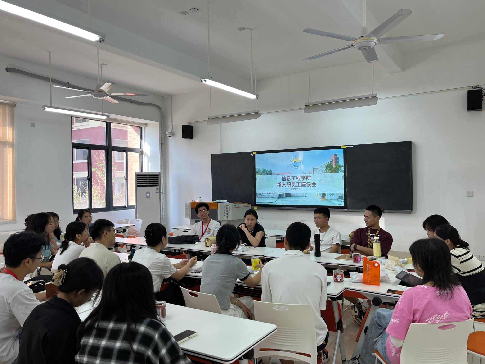 同庆中秋、共迎国庆,为了提升新入职教师的职业素养,助力新教师缩短角色转换期,尽快适应工作岗位,融入学校各项工作。29月27日下午,信息工程学院于3号教学楼3203开展新入职教师座谈会。信息工程学院院长贾超、副院长王雪茹、办公室主任兼教学秘书刘燕以及全体新入职教师参加了本次座谈会。