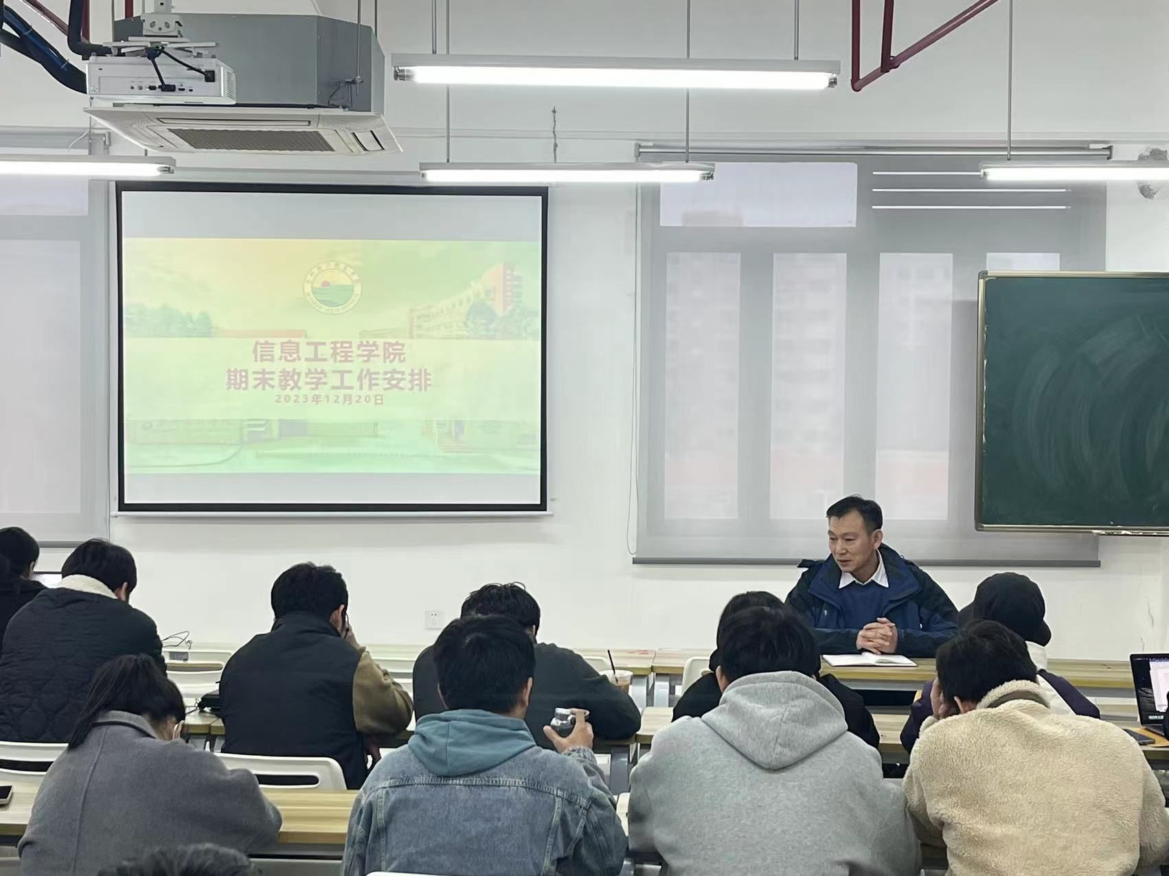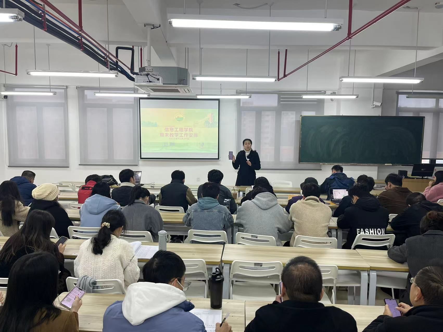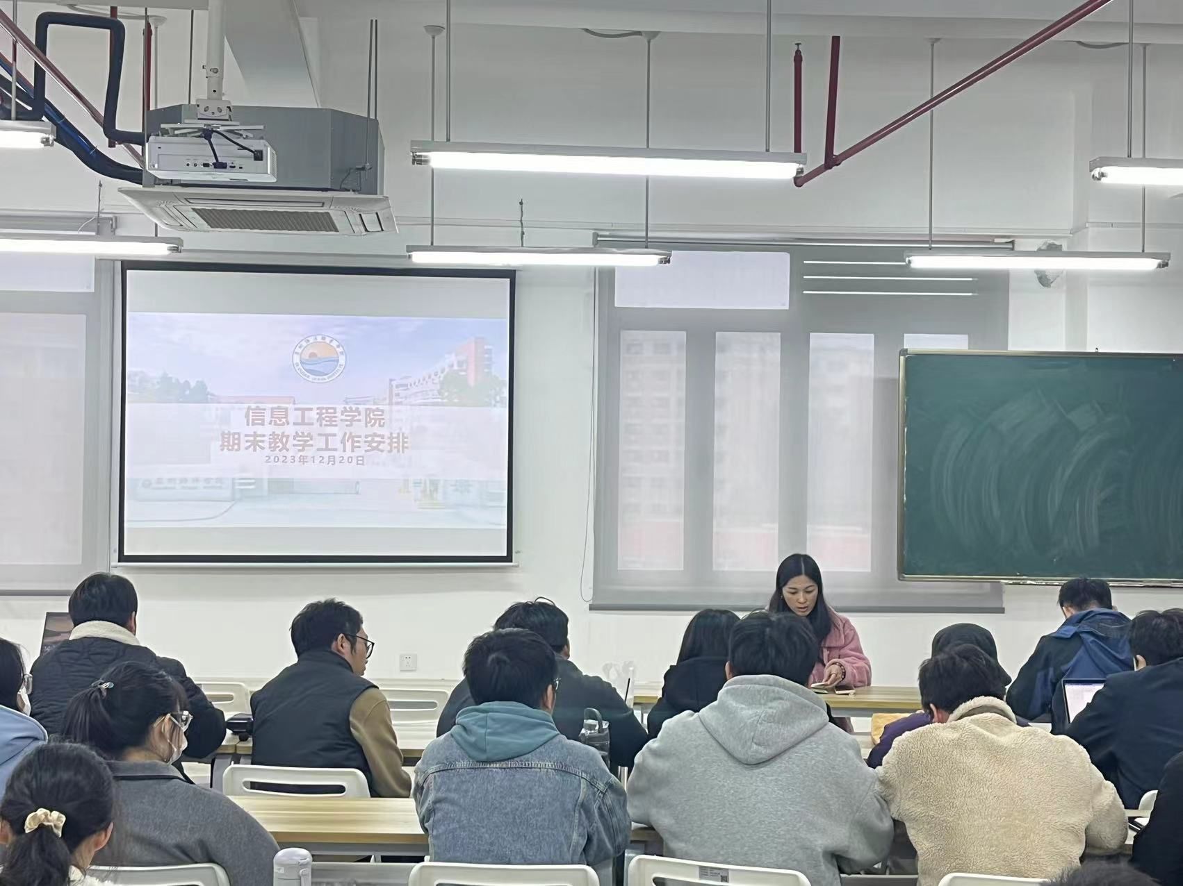 露浓渐岁寒,紧张而充实的学期又一次步入期末,为进一步夯实期末教学工作,2023年12月20日下午,信息工程学院于图书馆东侧503教室召开“期末教学工作安排”大会。信息工程学院院长贾超、副院长王雪茹、办公室兼教学秘书刘燕出席,全院教职工参加。