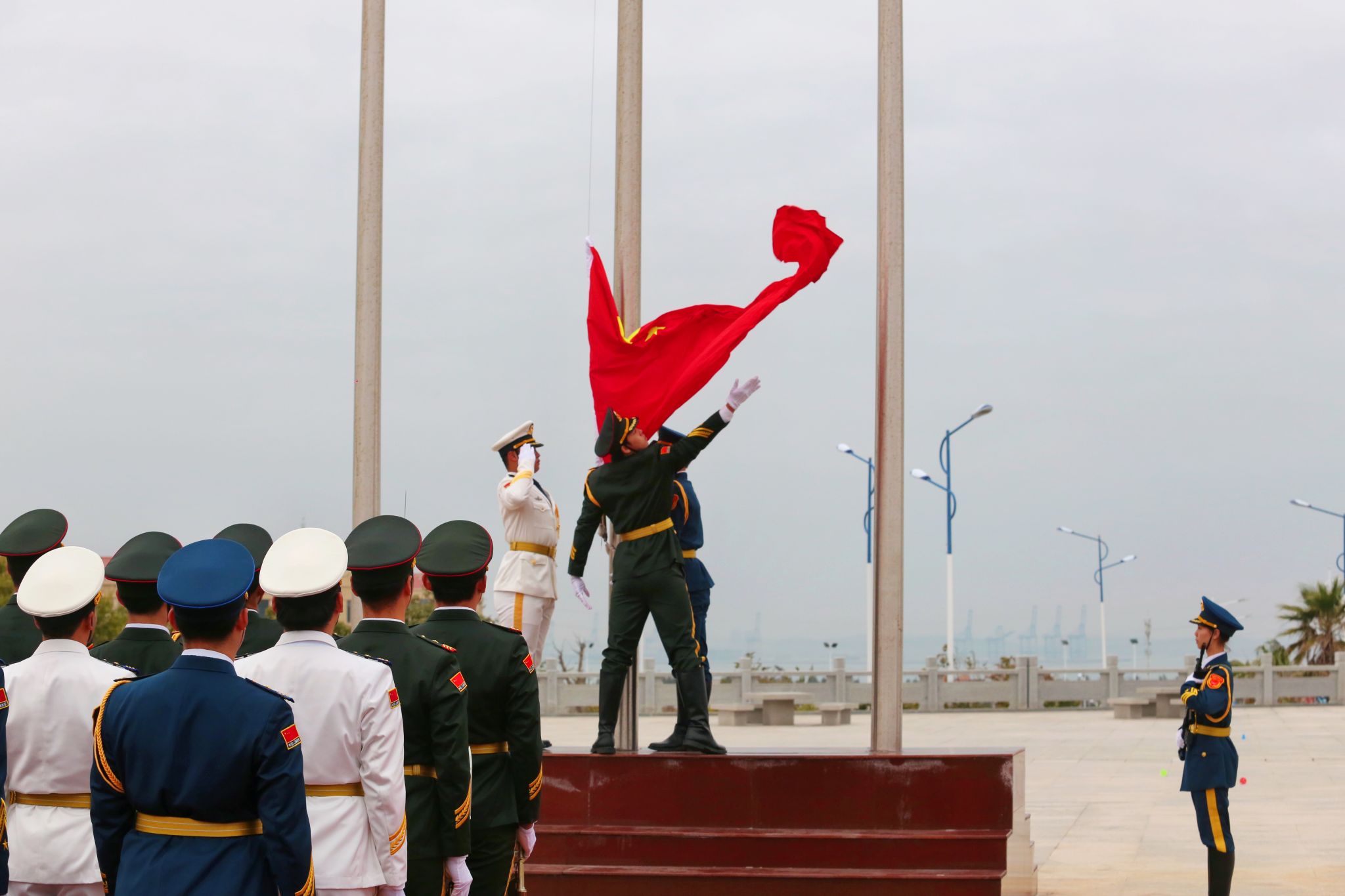 五星红旗缓缓上升,迎风飘扬