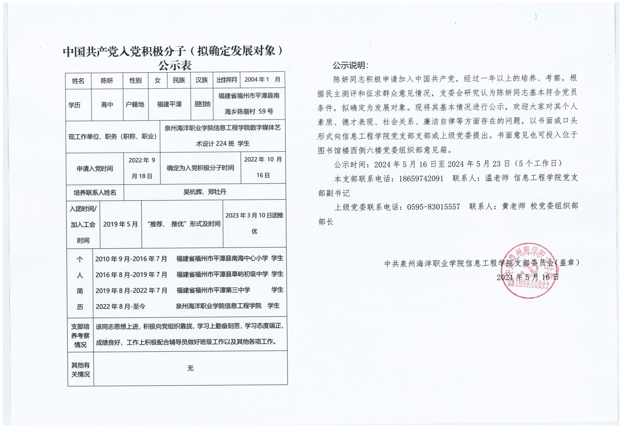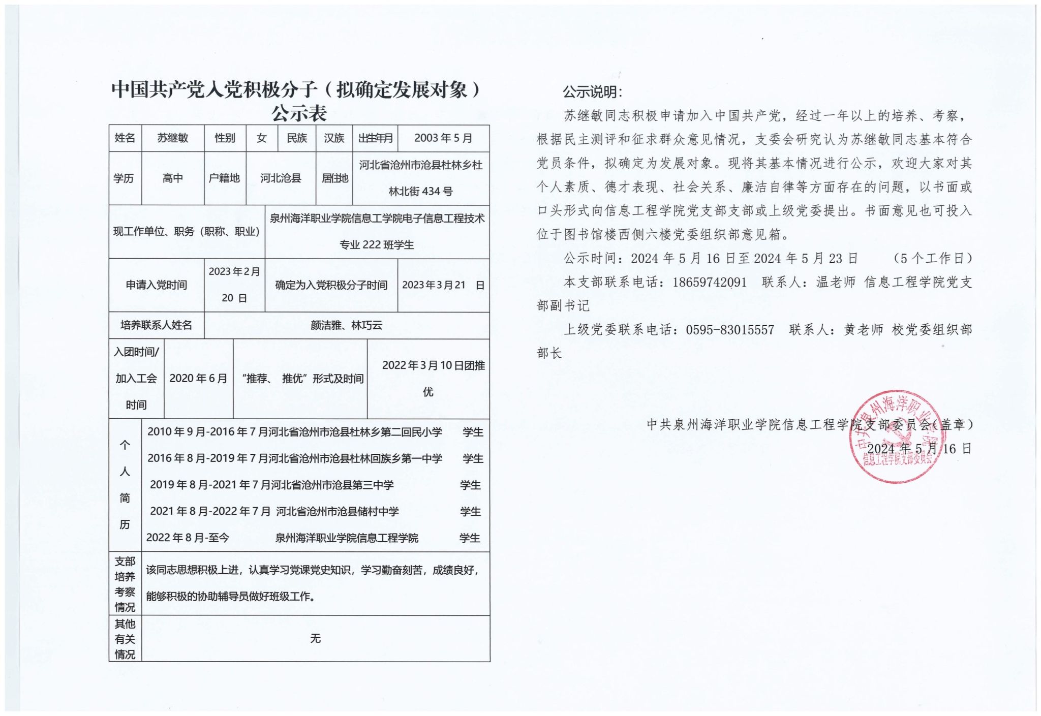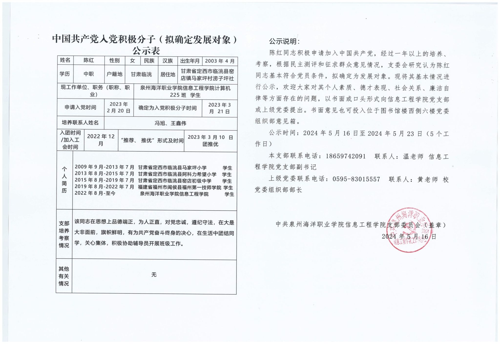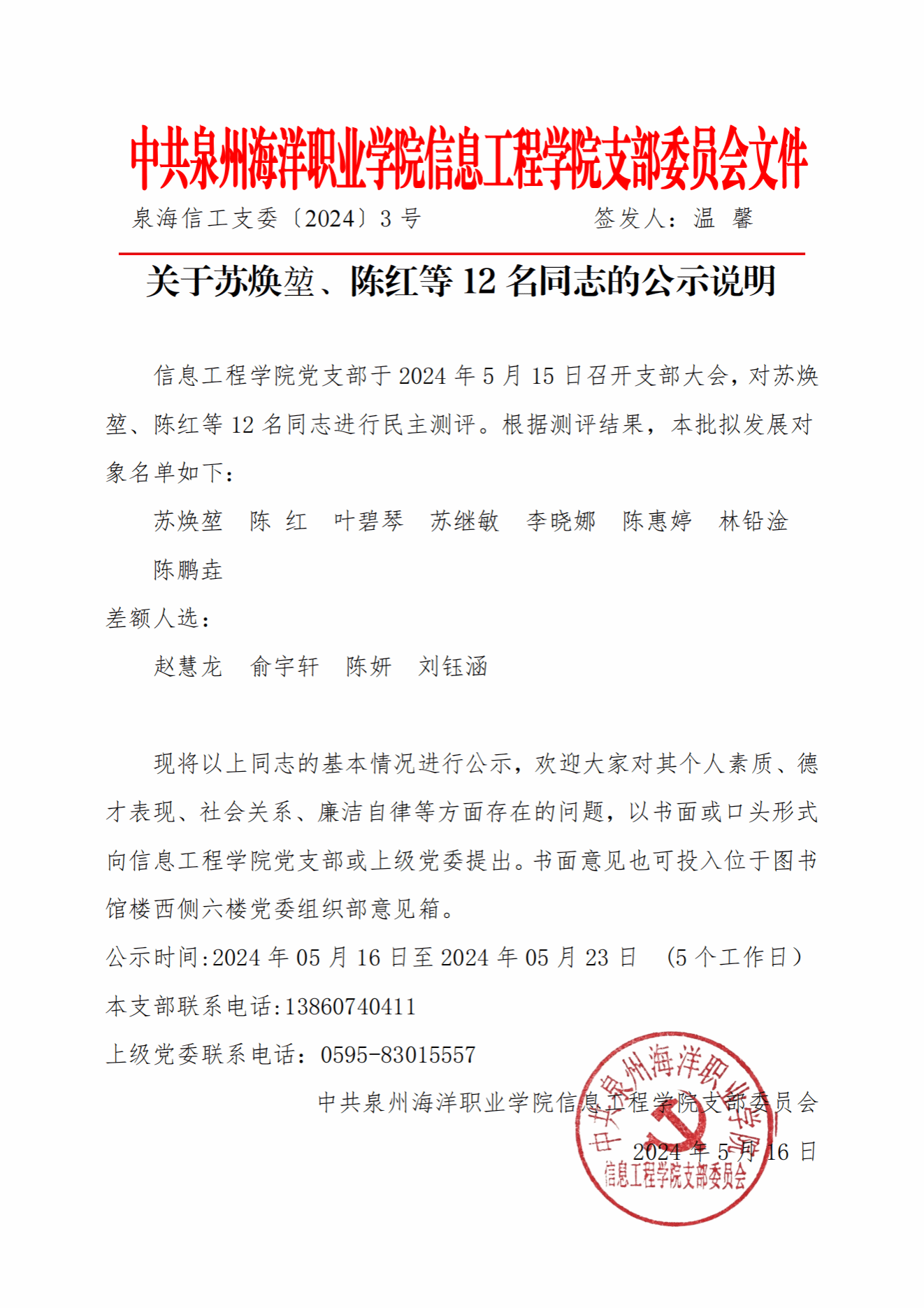 根据《中国共产党发展党员工作细则》及中共泉州海洋职业学院党委党员发展要求,经中共泉州海洋职业学院信息工程学院支部委员会综合党内外群众意见以及本人综合表现情况,拟确定苏焕堃、陈红等12名同志为发展对象。现公示情况如下: