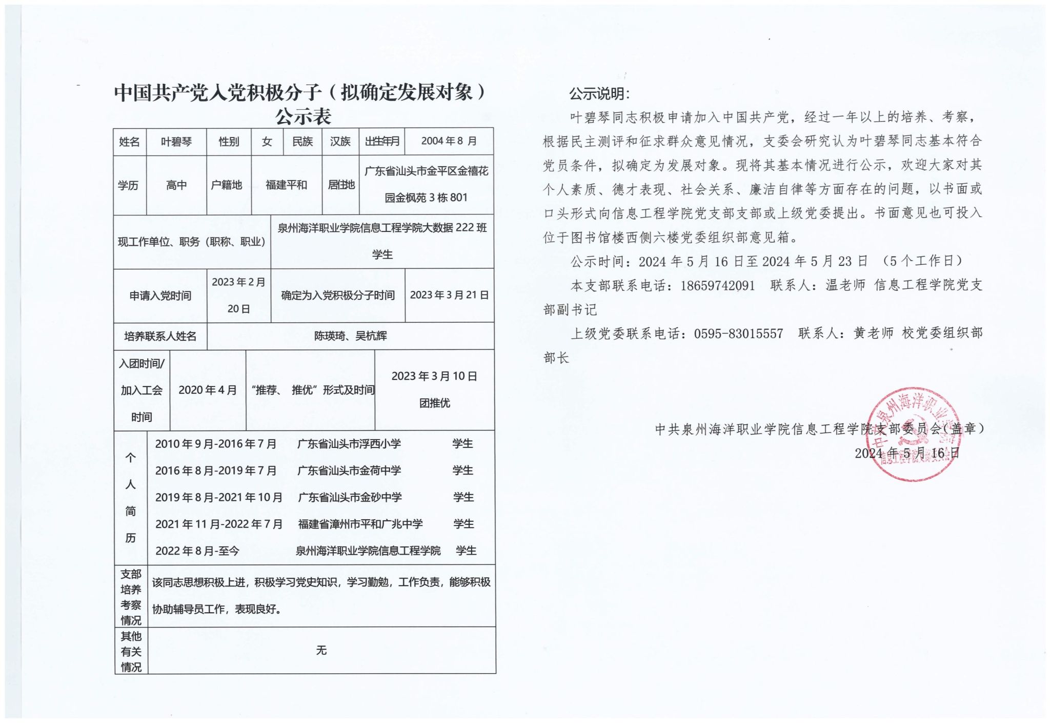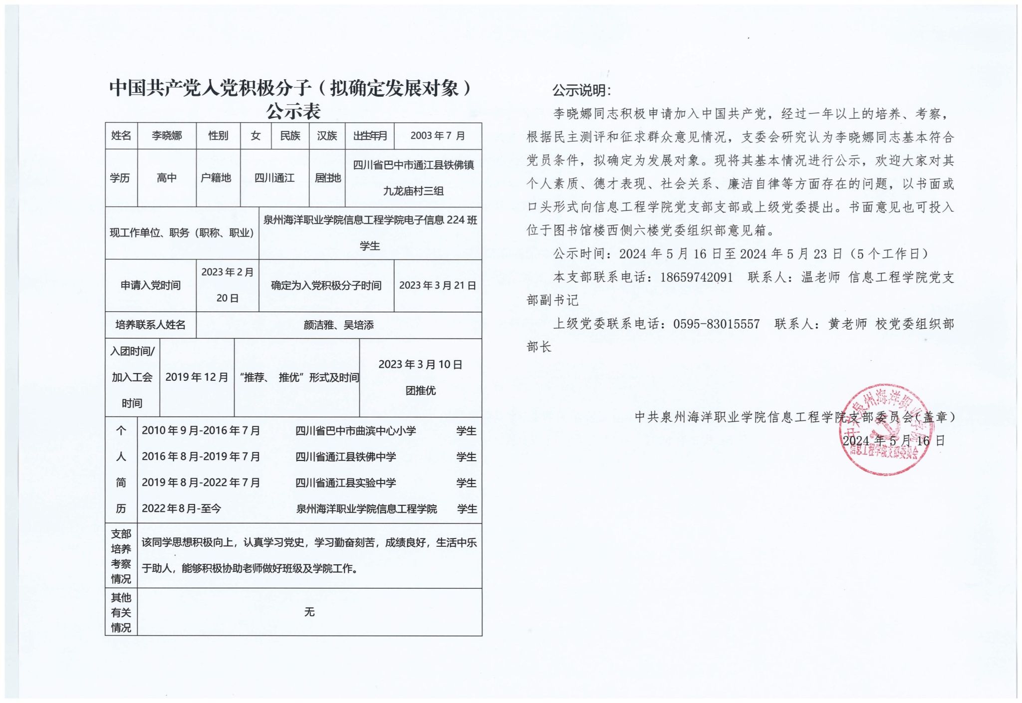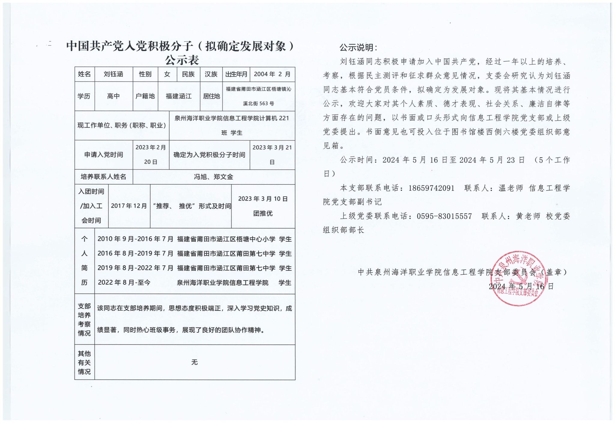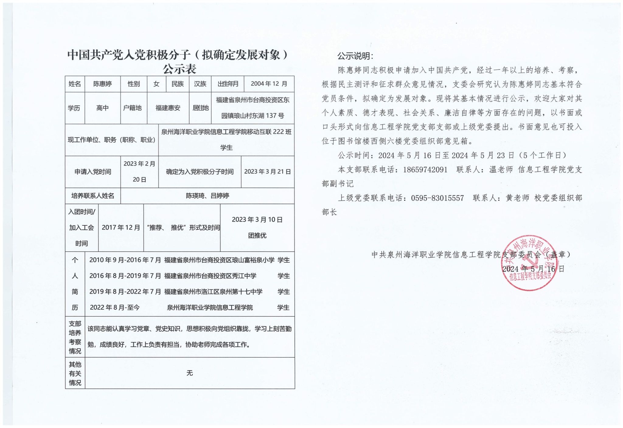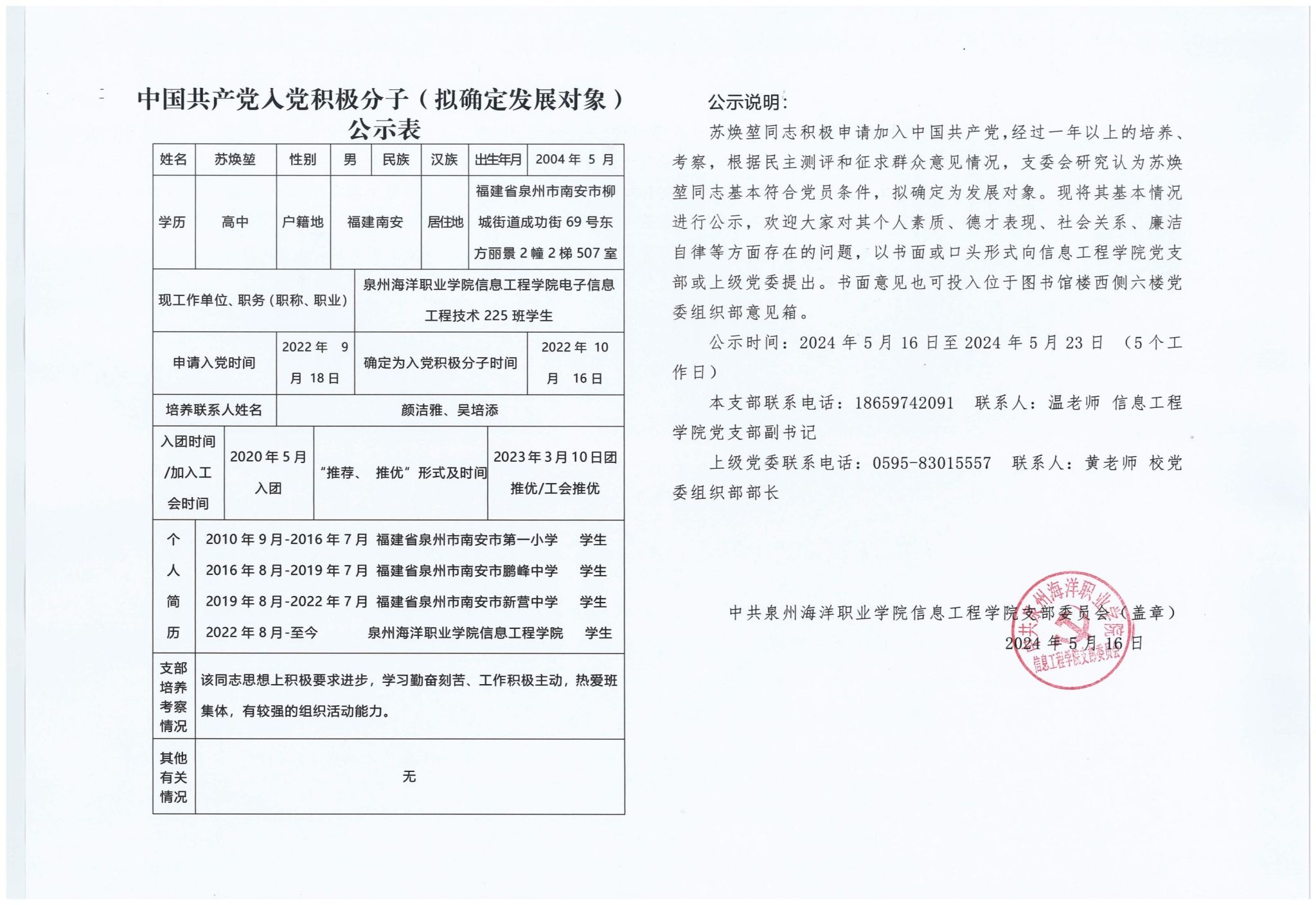 根据《中国共产党发展党员工作细则》及中共泉州海洋职业学院党委党员发展要求,经中共泉州海洋职业学院信息工程学院支部委员会综合党内外群众意见以及本人综合表现情况,拟确定苏焕堃、陈红等12名同志为发展对象。现公示情况如下: