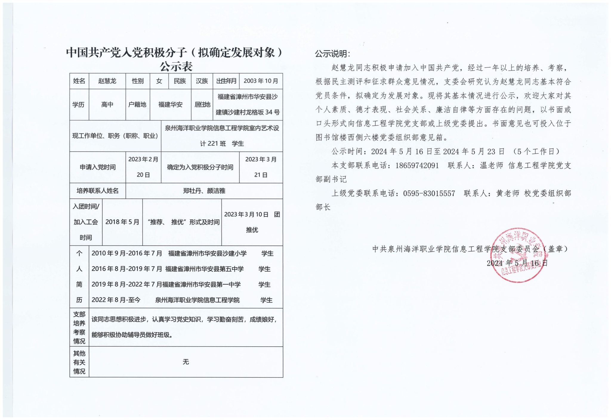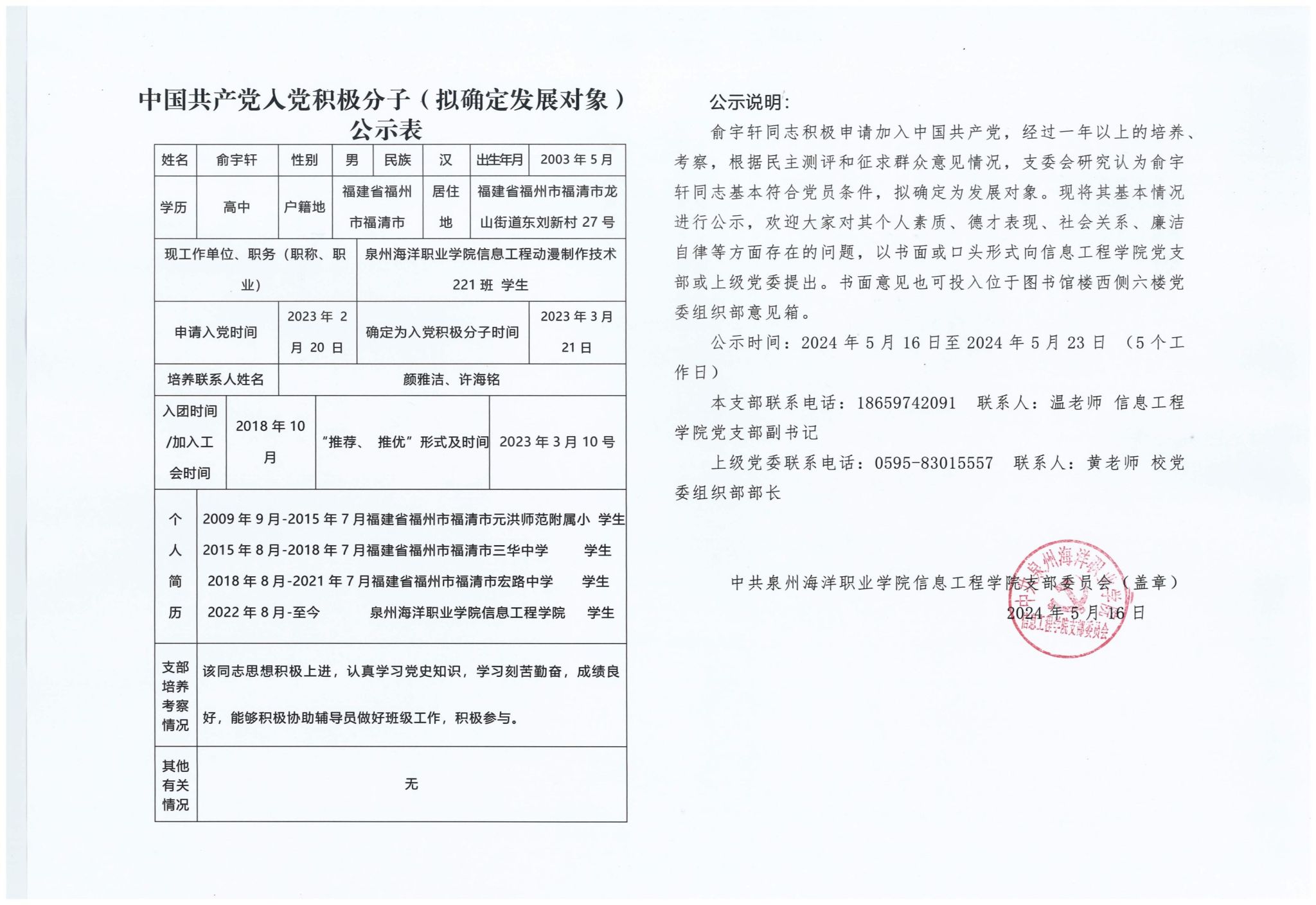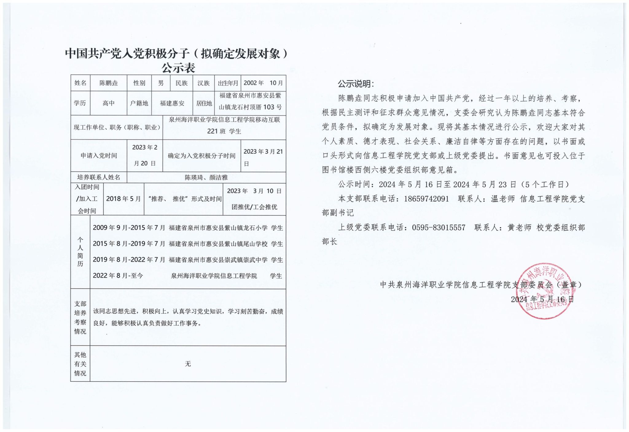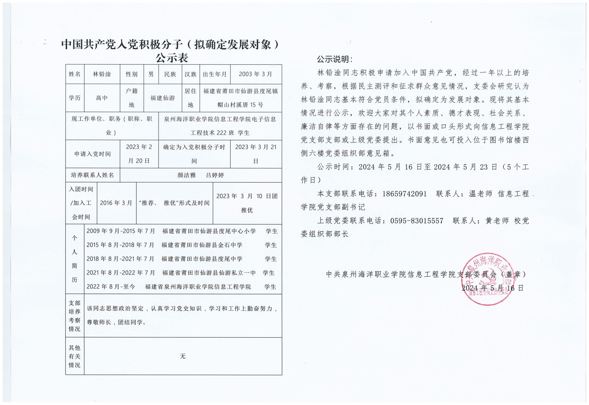 根据《中国共产党发展党员工作细则》及中共泉州海洋职业学院党委党员发展要求,经中共泉州海洋职业学院信息工程学院支部委员会综合党内外群众意见以及本人综合表现情况,拟确定苏焕堃、陈红等12名同志为发展对象。现公示情况如下: