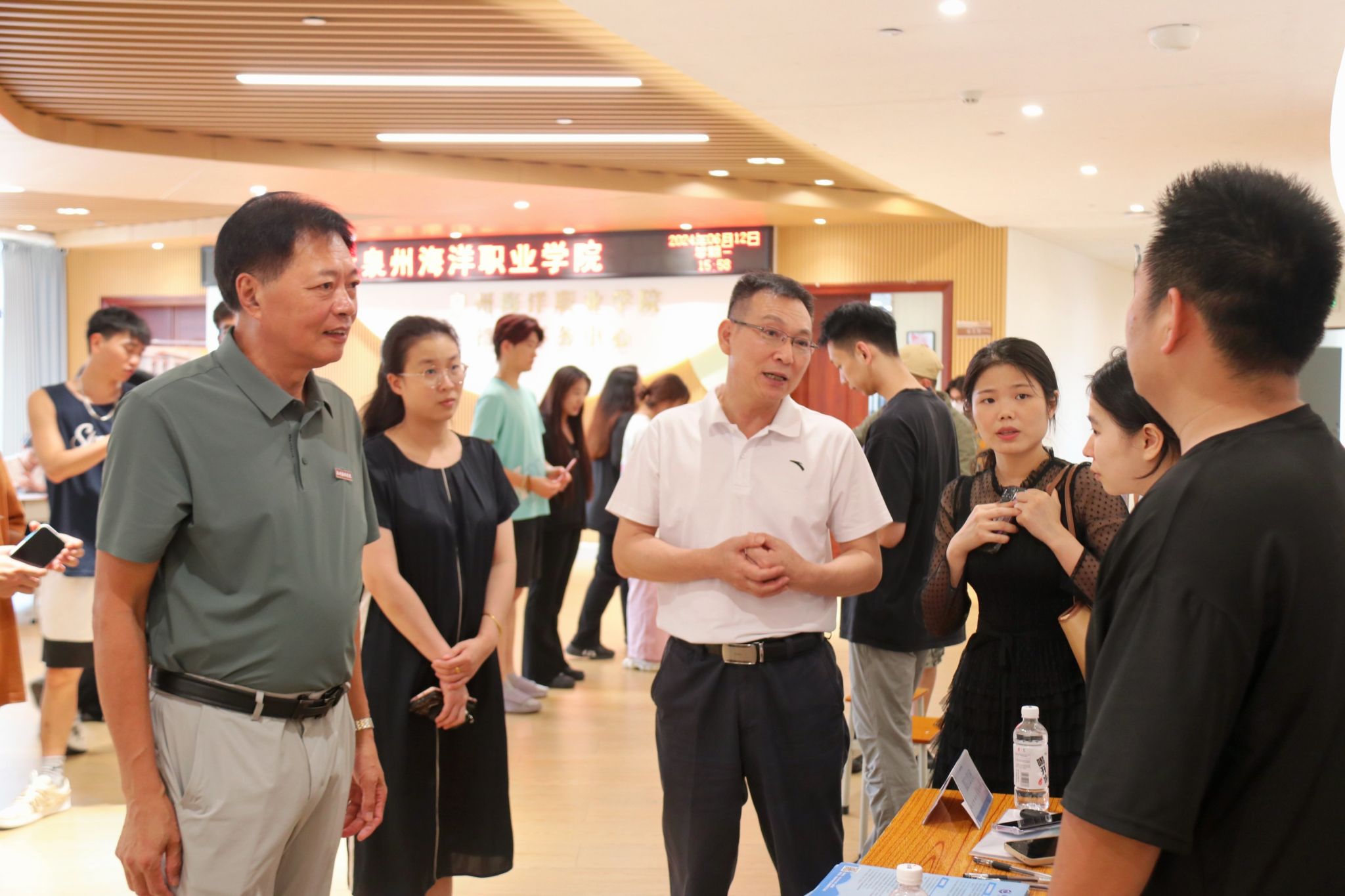 学校领导高度重视我院本次招聘会活动的开展,泉州海洋职业学院校长庄伟濂、党委书记郑艳、副校长钱学东、副校长、党委副书记、纪委书记李明灿、副校长陈东水、副校长栾璋宝、董事长助理蔡永鸿等亲临招聘会现场,与在场学生沟通交流,了解不同行业、不同区域、不同类型单位的发展行势、招聘需求和毕业生职业发展路径,并向部分用人单位了解我校毕业生在入职后的岗位适配情况和职业发展情况,为学生的实习就业保驾护航。