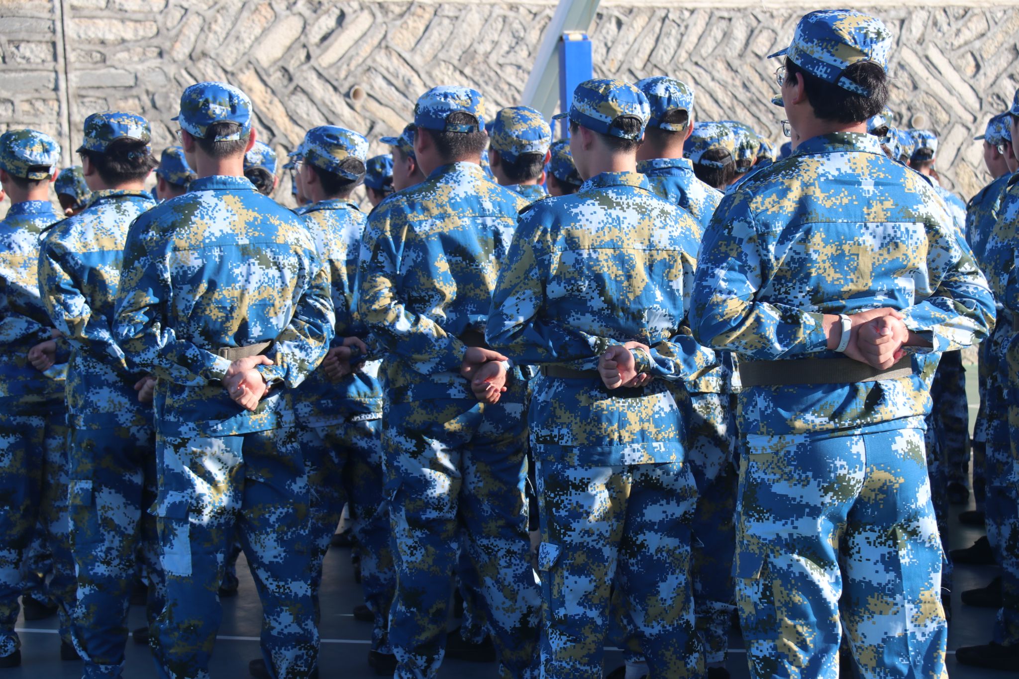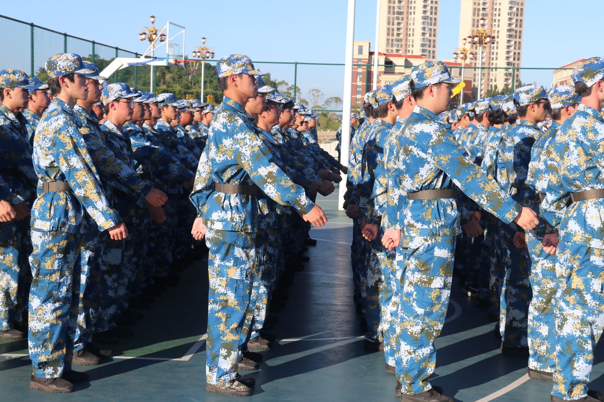 烈日下的身穿迷彩的新生们