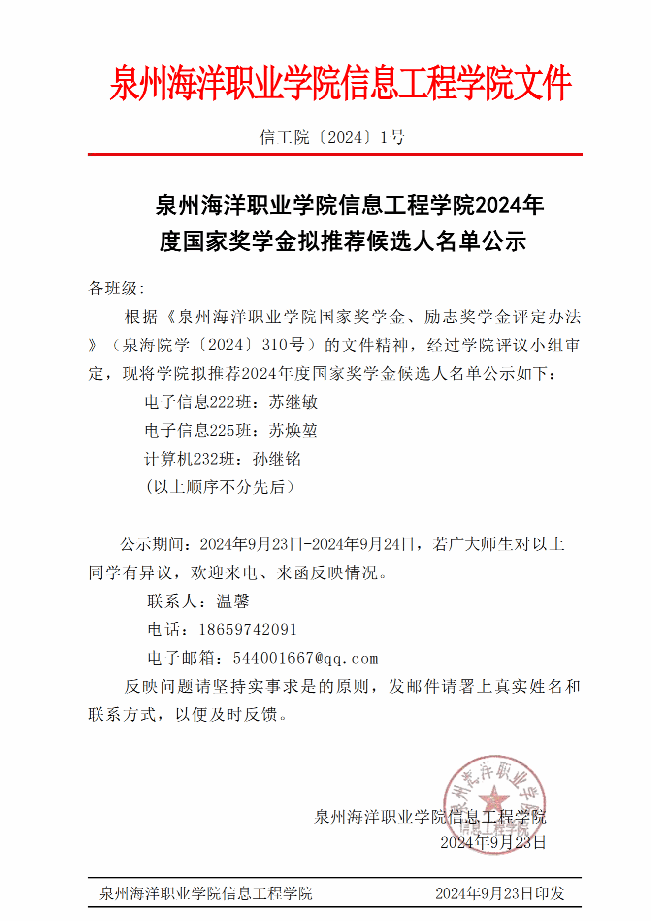 根据《泉州海洋职业学院国家奖学金、励志奖学金评定办法》(泉海院学〔2024〕310号)的文件精神,经过评议小组审定,现将学院拟推荐2023-2024学年国家奖学金候选人名单公示如下: