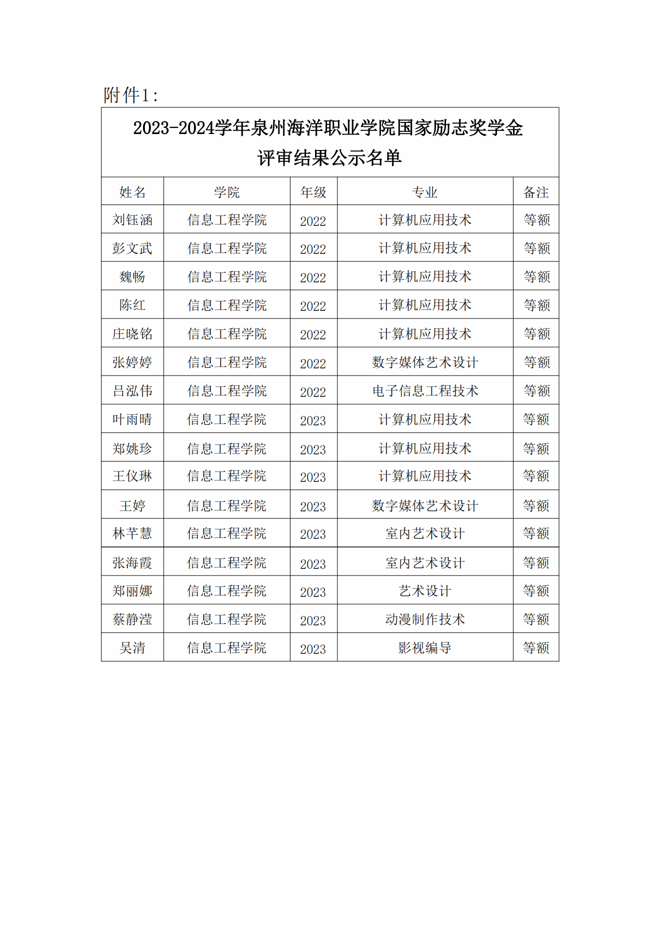 根据泉海院学〔2024〕310号《泉州海洋职业学院国家奖学金、励志奖学金评定办法》现将泉州海洋职业学院信息工程学院2023-2024学年国家励志奖学金评审结果予以公示,公示期5个工作日(2024年10月8日至2024年10月14日)。