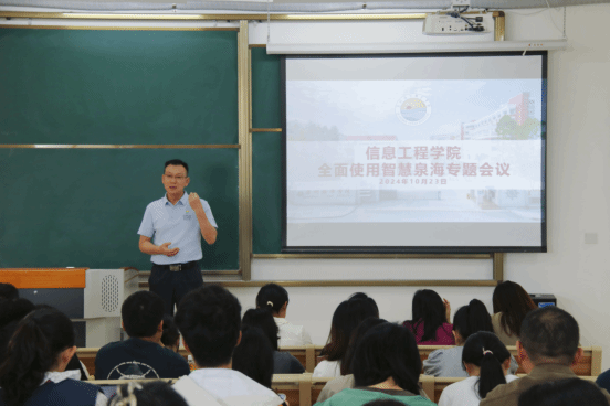 为促进智慧泉海平台的全面普及与高效运行,信息工程学院领导班子及行政人员于2024年10月21日召开紧急会议,2024年10月23日于教学楼3208召开全院教职工大会,就“如何提升智慧泉海使用率”相关事宜进行安排培训,本次会议由信息工程学院信息化专员林巧云主讲。