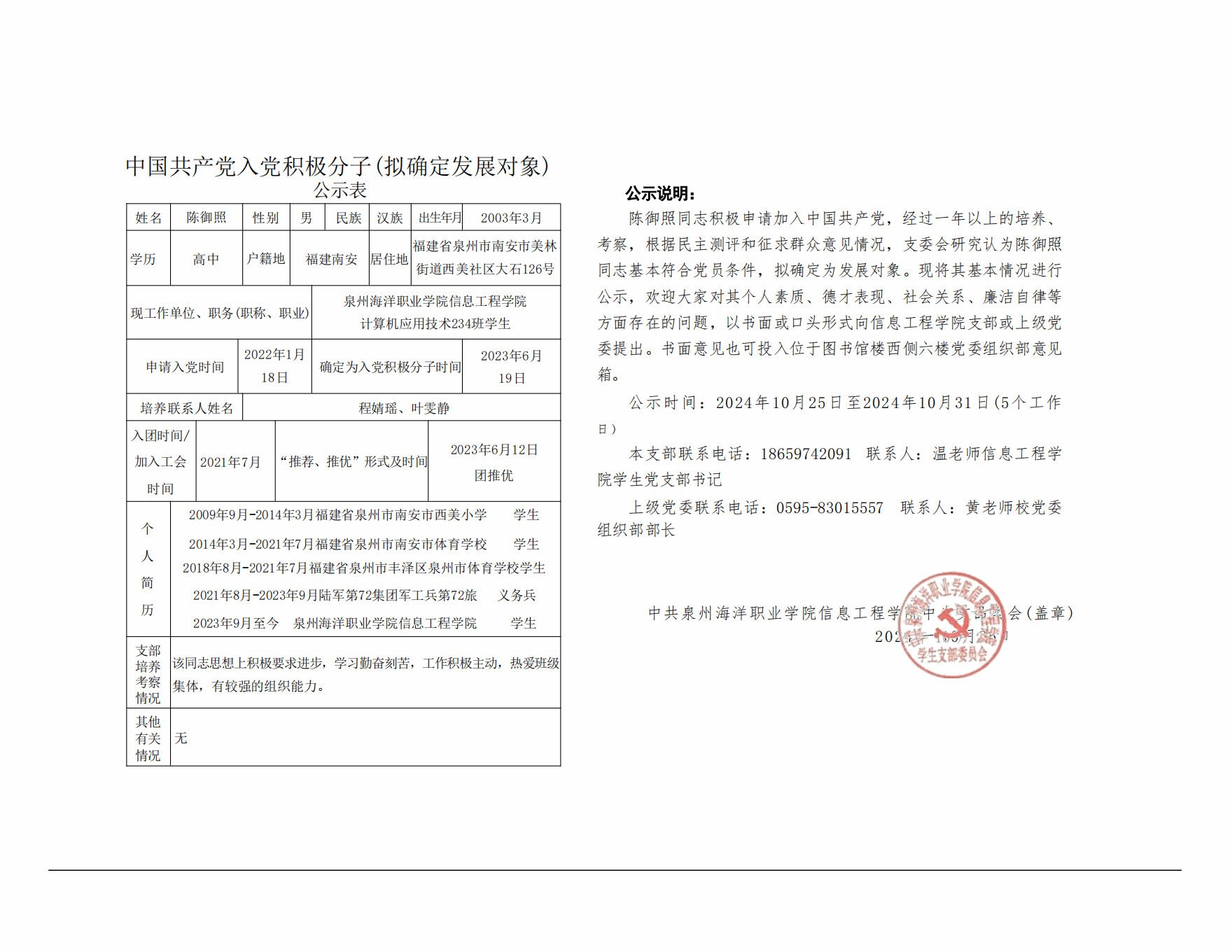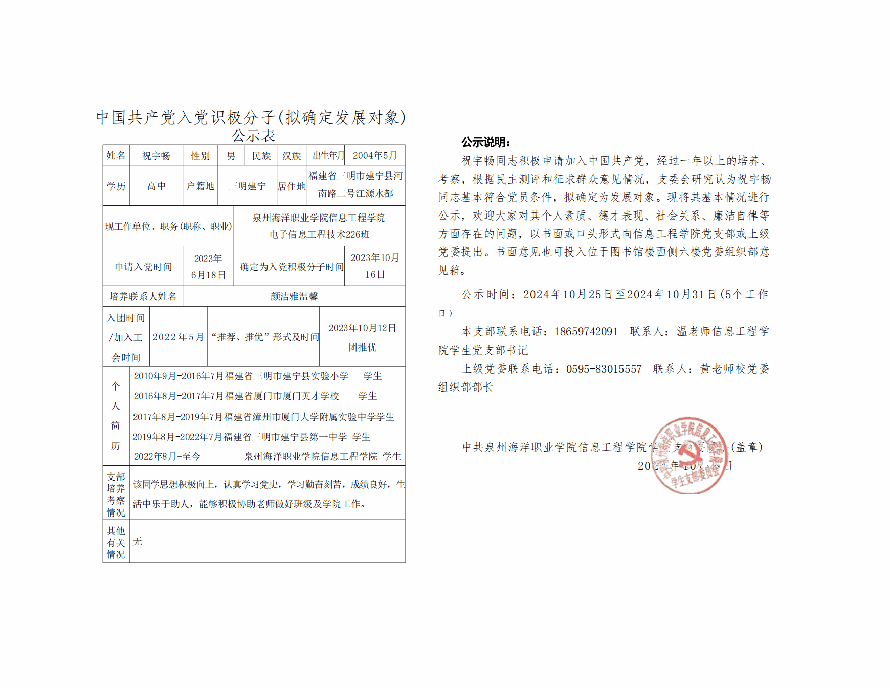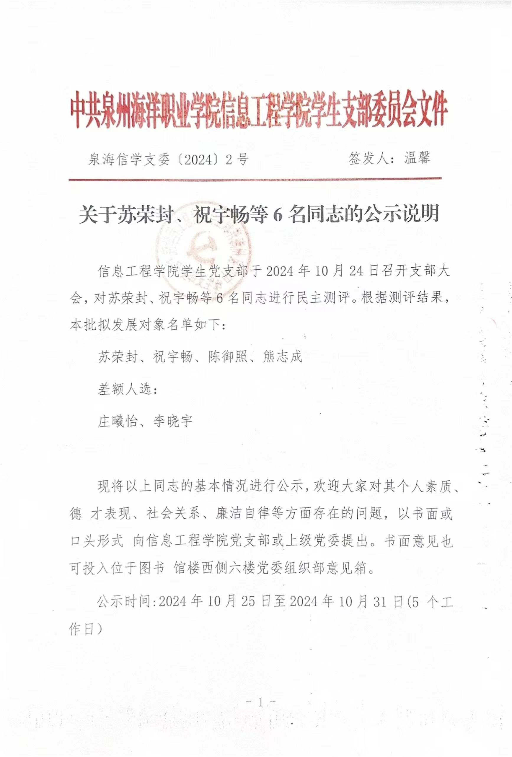 根据《中国共产党发展党员工作细则》及中共泉州海洋职业学院党委党员发展要求,经中共泉州海洋职业学院信息工程学院学生支部委员会综合党内外群众意见以及本人综合表现情况,拟确定苏荣封、祝宇畅等6名同志为发展对象。现公示情况如下: