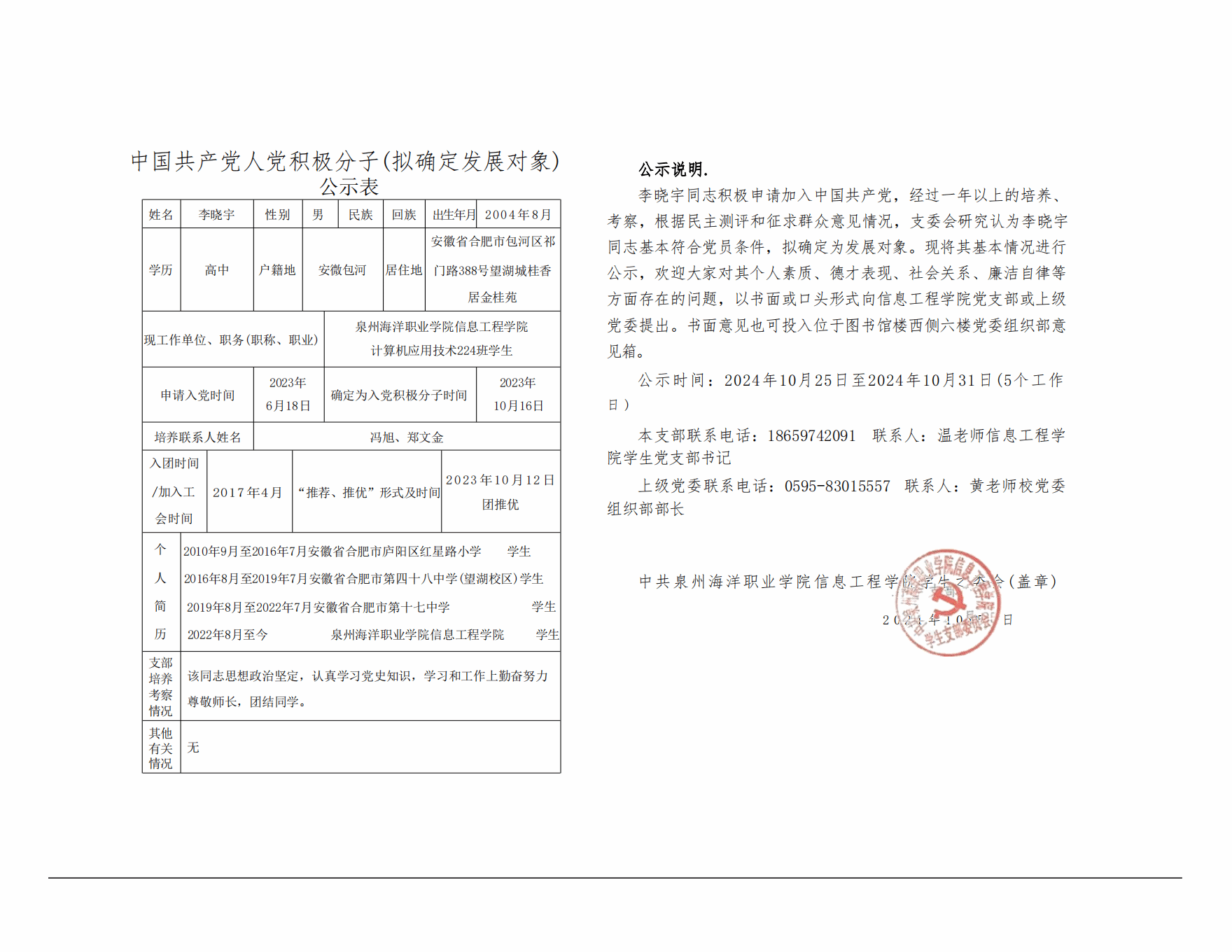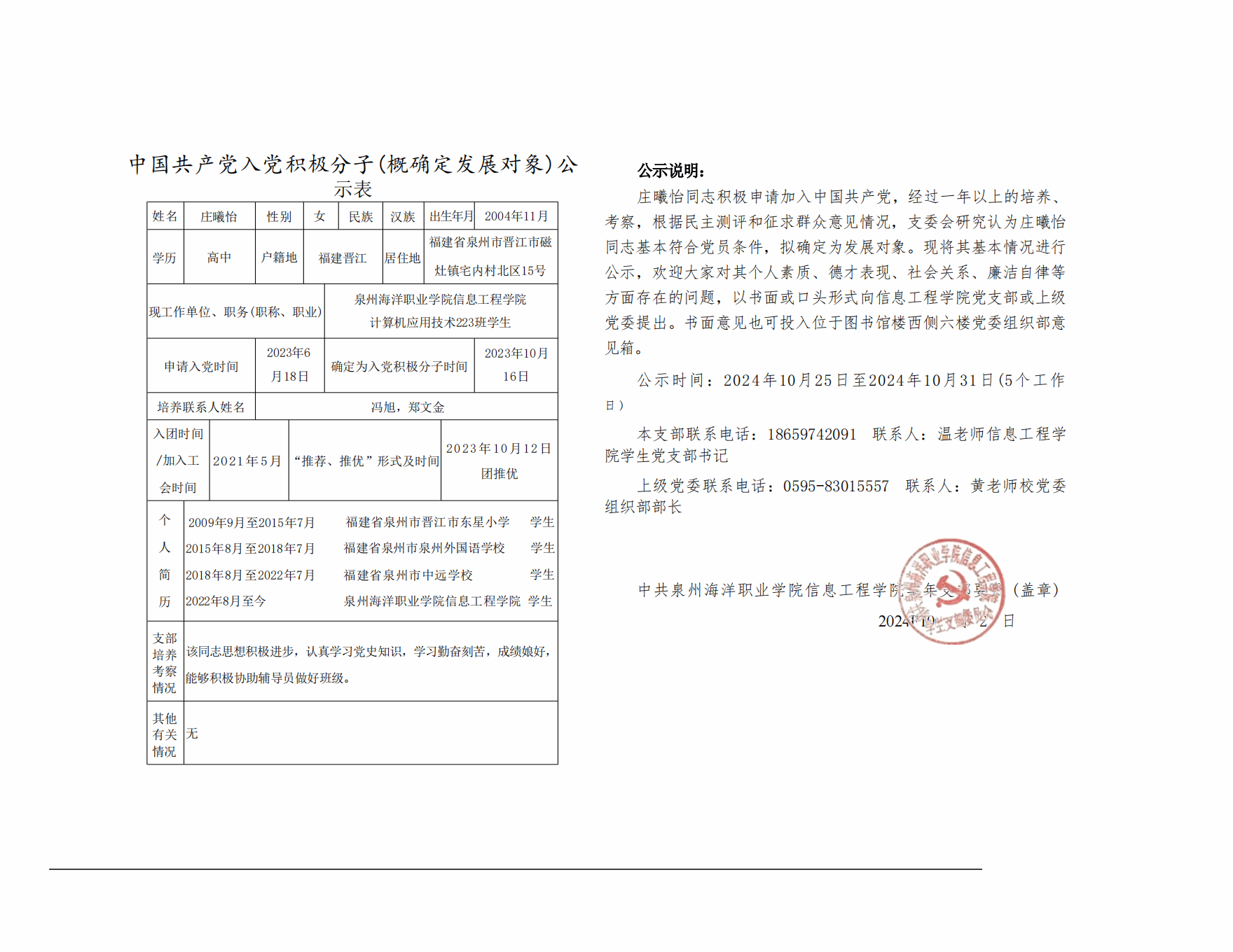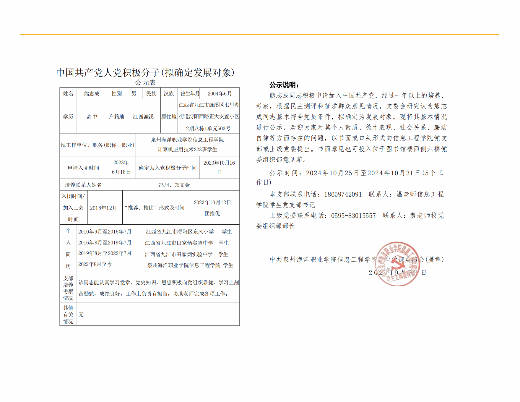 根据《中国共产党发展党员工作细则》及中共泉州海洋职业学院党委党员发展要求,经中共泉州海洋职业学院信息工程学院学生支部委员会综合党内外群众意见以及本人综合表现情况,拟确定苏荣封、祝宇畅等6名同志为发展对象。现公示情况如下: