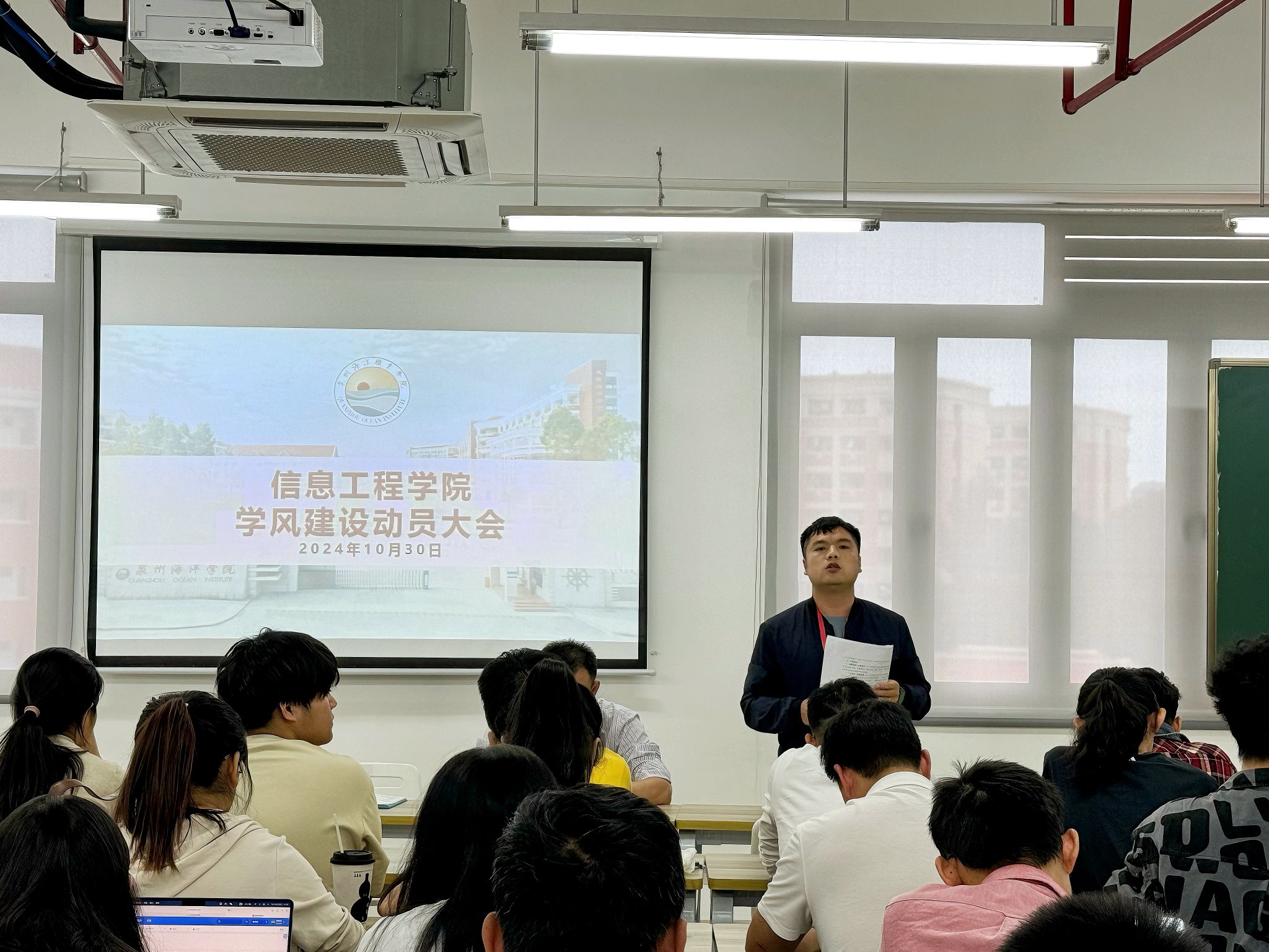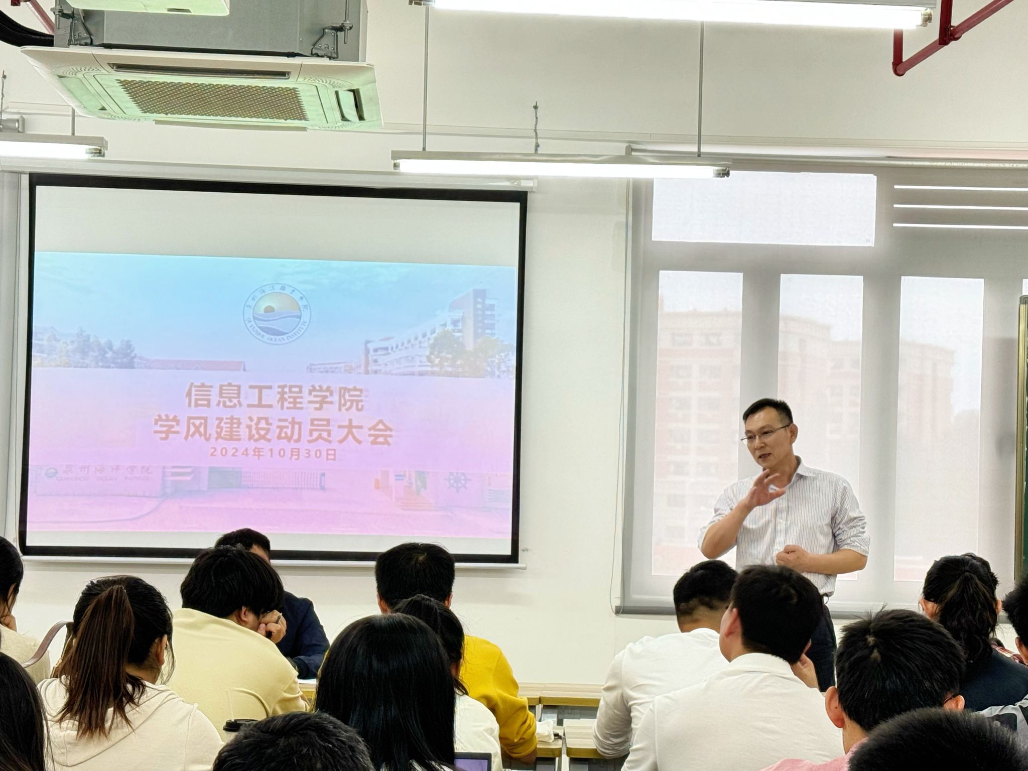 为加强学风建设,营造积极进取、奋发向上的学习氛围,2024年10月30日,信息工程学院于图书馆东侧503教室召开学风建设月动员大会,学院全体教职工参会。