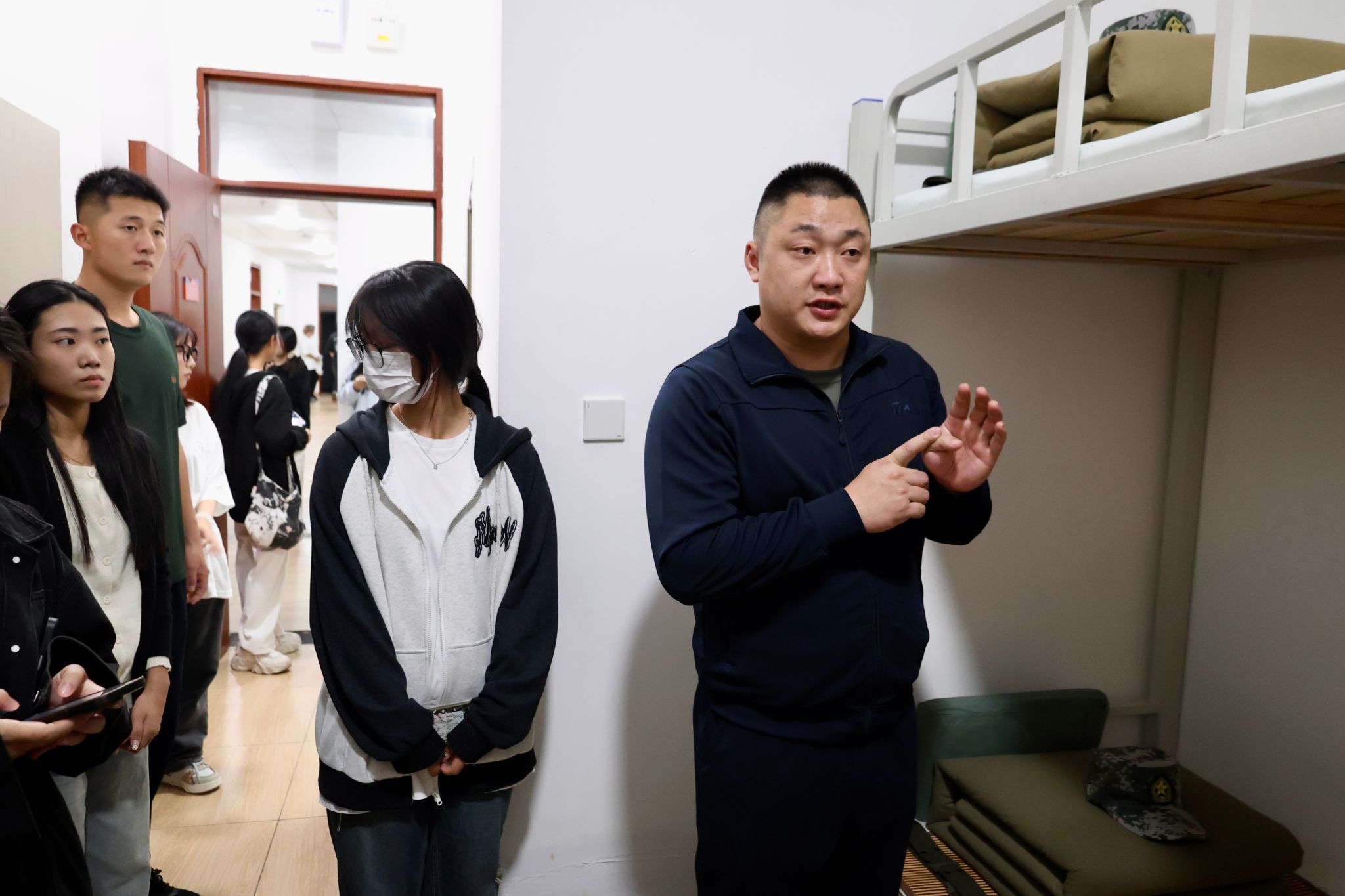 国防教育学院党支部副书记贺充为在场学生详细讲解宿舍内物品收纳与整理技巧。