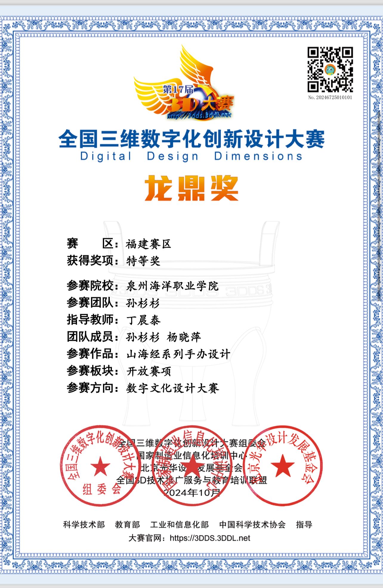 近日,第17届全国三维数字化创新设计大赛落下帷幕。信息工程学院教师丁晨泰指导学生孙杉杉、杨晓萍作品《山海经系列手办设计》荣获福建赛区“特等奖”;张鹏、丁晨泰老师指导学生黄嘉旺、郑文浩、田志伟作品《宋元泉州三维建模还原》荣获福建赛区“二等奖”。