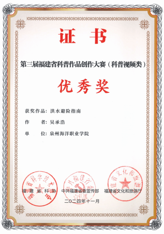 近日由福建省科协、中共福建省委宣传部、福建省文化和旅游厅共同举办的“畅想科普 倡响科技”第三届福建省科普作品创作大赛圆满结束。由信息工程学院黄婉秋、林有霖老师指导学生吴承浩作品《洪水避险指南》荣获本次大赛优秀奖。