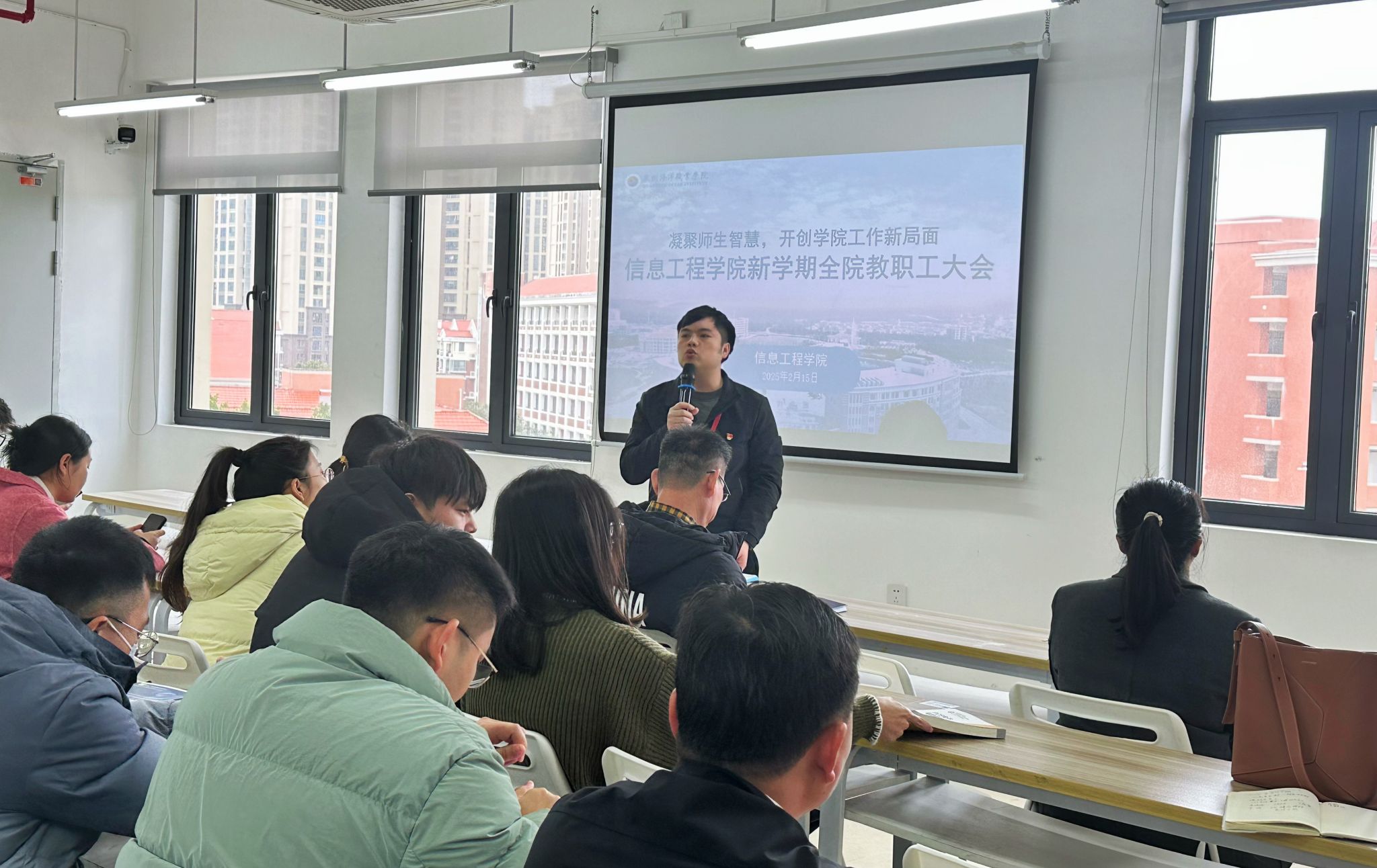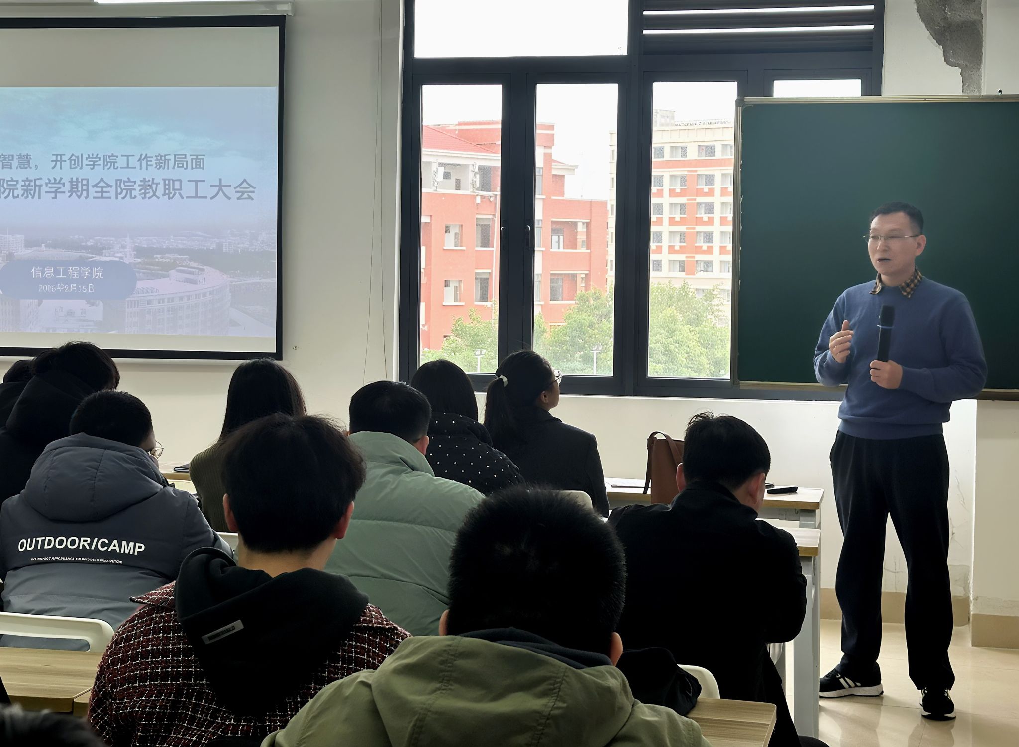 2025年2月15日,信息工程学院于图书馆东侧503召开“凝聚师生智慧,开创学院工作新局面”新学期全院教职工大会。信息工程学院院长贾超、党总支书记陈合喜、副书记温馨、副院长曹金香出席,全院教职工参加。