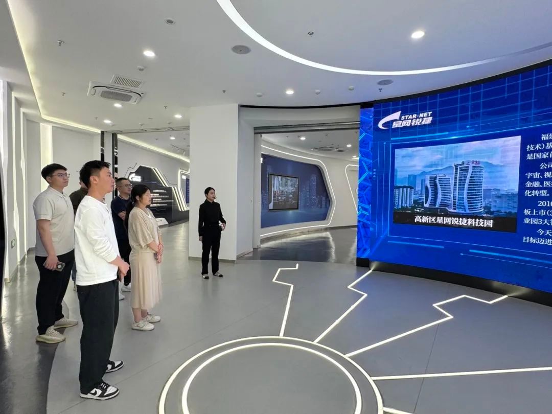 第二站前往福建星网锐捷通讯股份有限公司,福建星网锐捷负责人热情接待我校一行。在负责人的带领下,我校一行参观了星网锐捷的展示厅,详尽阐述各技术模块下产品的核心功能、性能指标、适用领域以及背后的关键技术,详细介绍了星网锐捷公司发展历程及核心业务,并观光长廊参观生产车间。
