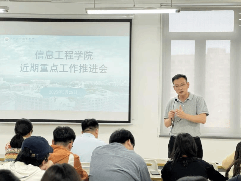2025年5月28日,信息工程学院在图书馆东侧503召开近期重点工作推进会,信息工程学院院长贾超、党总支书记陈合喜、副院长曹金香、副书记温馨出席,全院教职工参会。