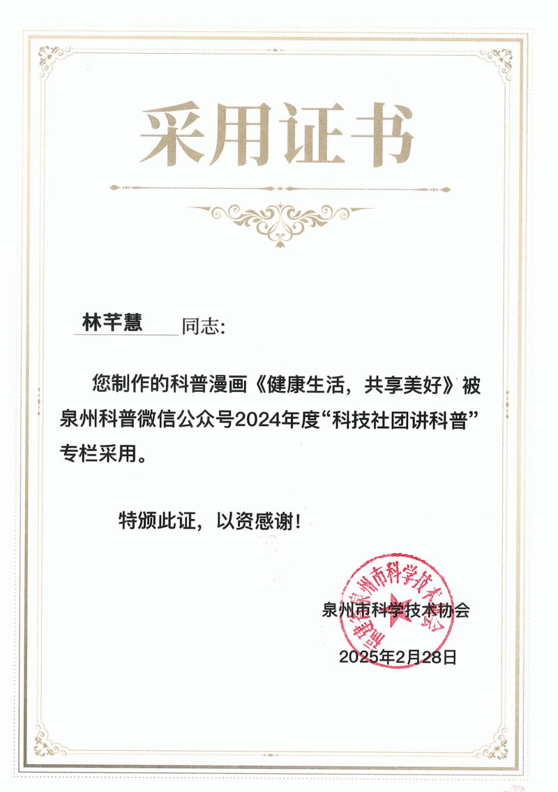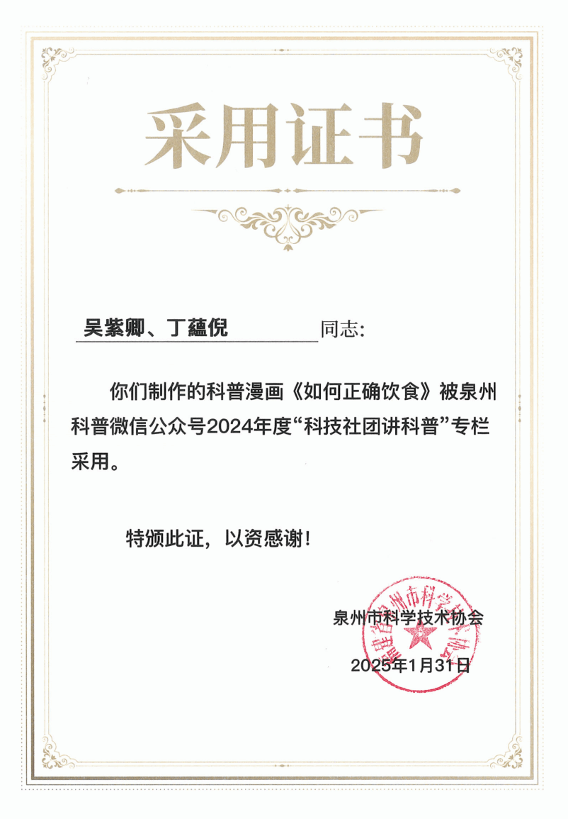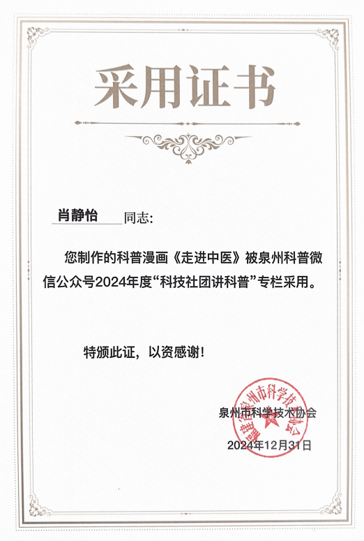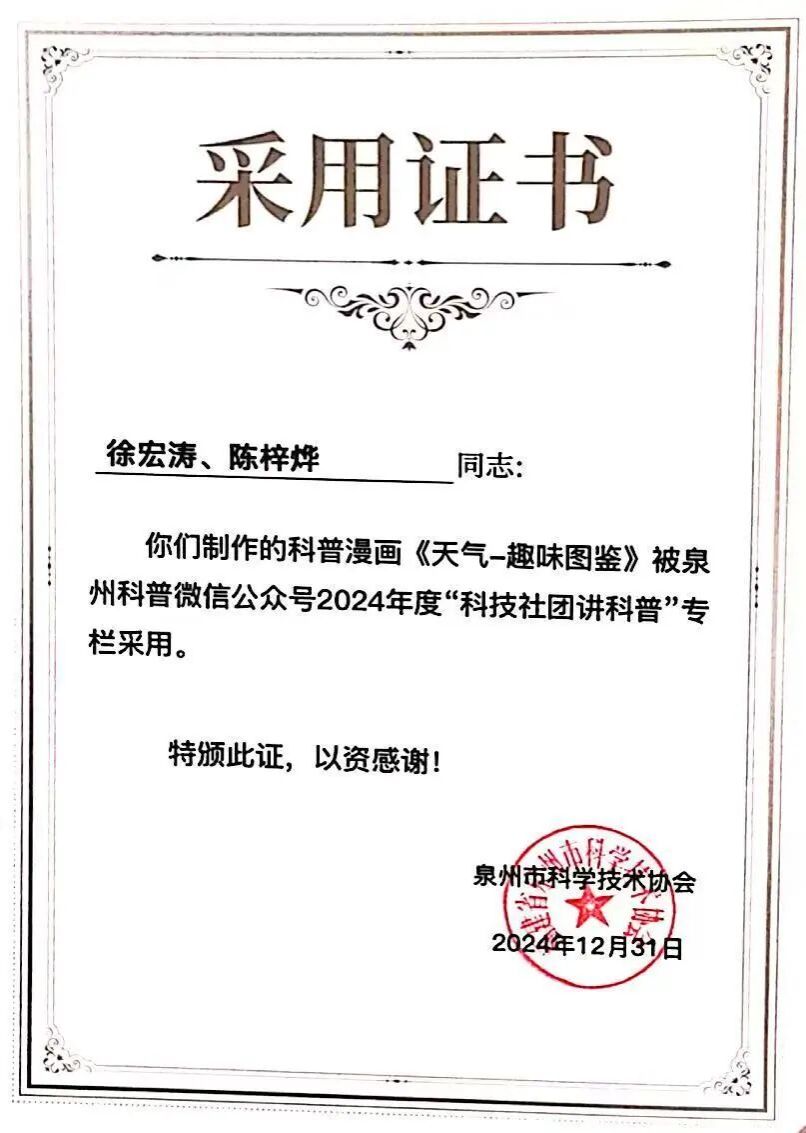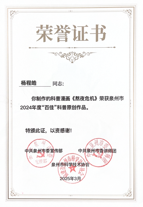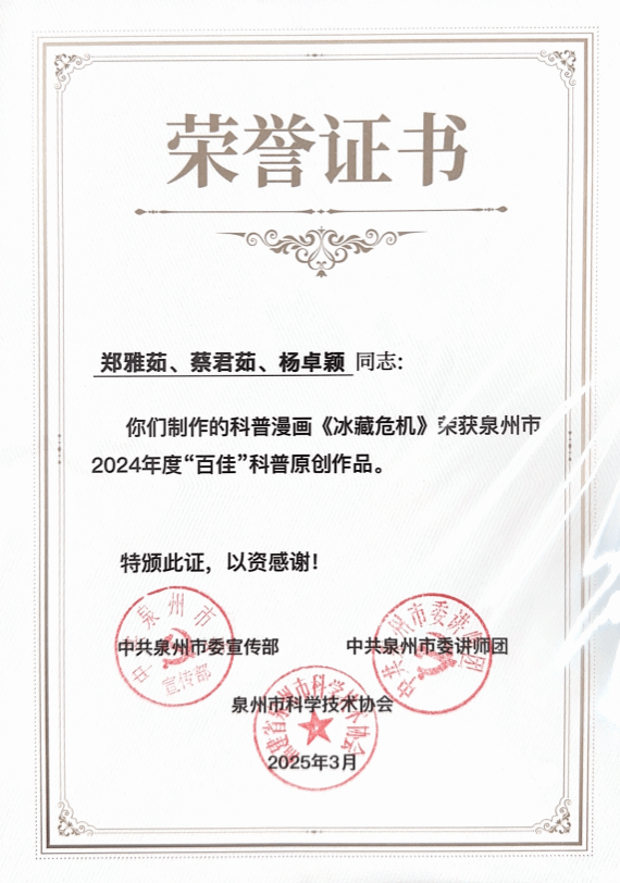 在党的二十届三中全会精神指引下,为落实《中国科协关于新时代加强学会科普工作的意见》以及《泉州市全民科学素质行动规划纲要实施方案(2021—2025年)》要求,泉州市科学技术协会联合中共泉州市委宣传部、中共泉州市委讲师团共同举办的泉州市2024年度“百佳”科普原创作品征集活动,历经数月的精心筹备与激烈角逐,终于在近日圆满落下帷幕。我院学生踊跃参与,用他们的智慧与创意,为泉州市的科普事业添砖加瓦,为全民科学素质的提升注入了新的活力。