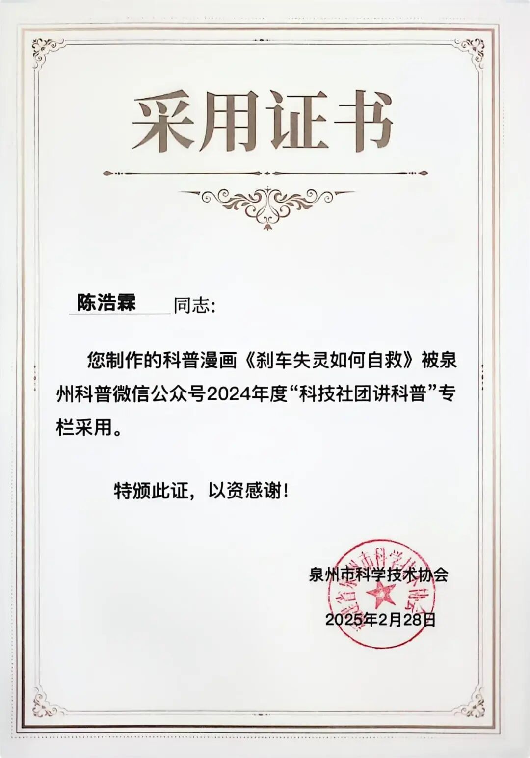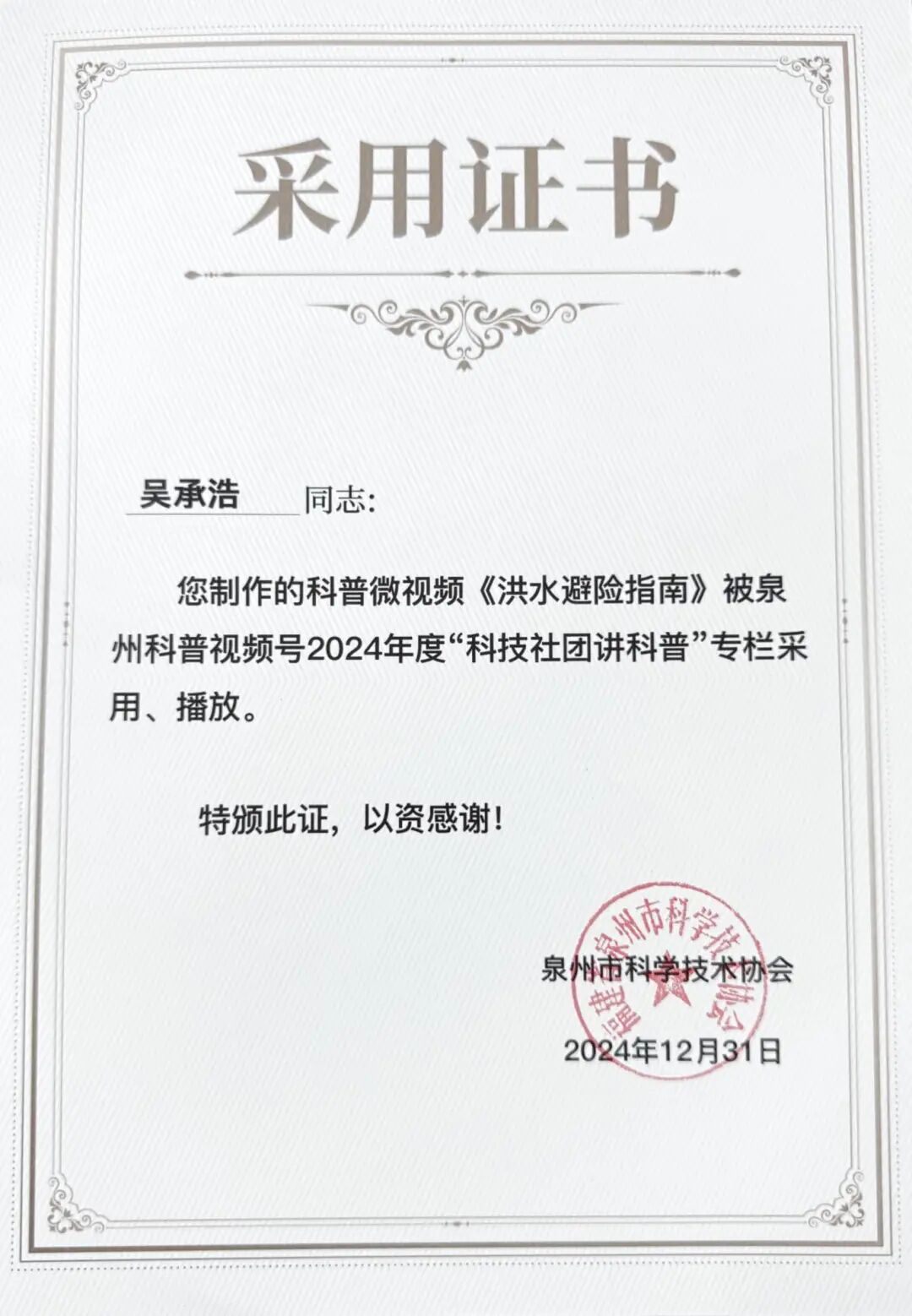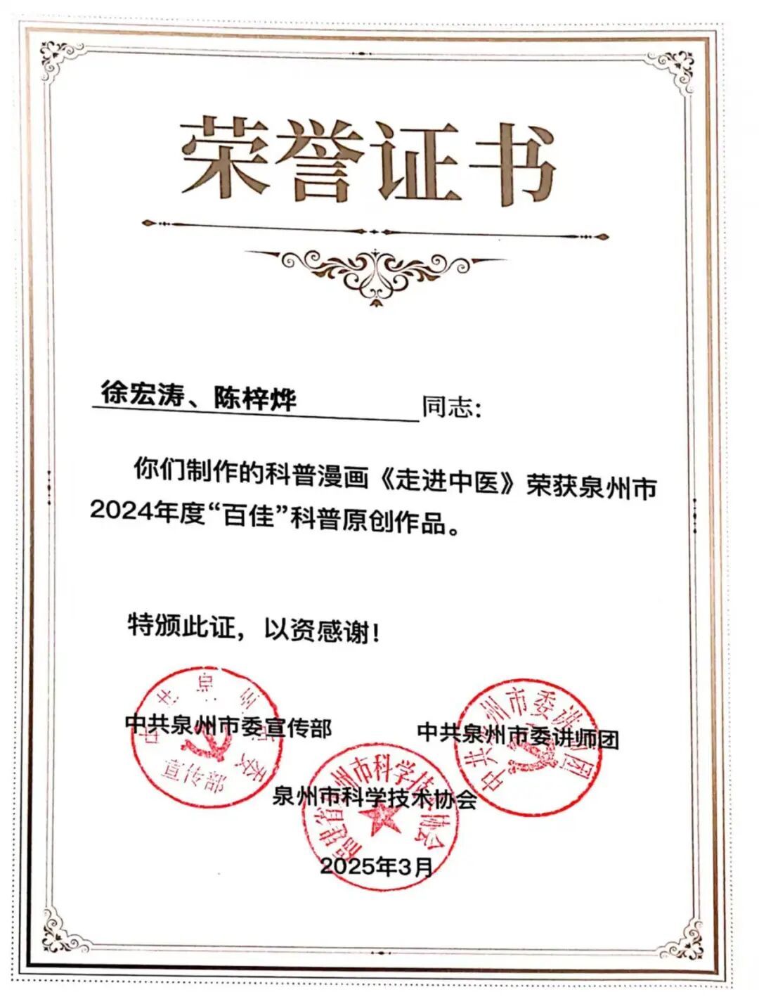 在党的二十届三中全会精神指引下,为落实《中国科协关于新时代加强学会科普工作的意见》以及《泉州市全民科学素质行动规划纲要实施方案(2021—2025年)》要求,泉州市科学技术协会联合中共泉州市委宣传部、中共泉州市委讲师团共同举办的泉州市2024年度“百佳”科普原创作品征集活动,历经数月的精心筹备与激烈角逐,终于在近日圆满落下帷幕。我院学生踊跃参与,用他们的智慧与创意,为泉州市的科普事业添砖加瓦,为全民科学素质的提升注入了新的活力。