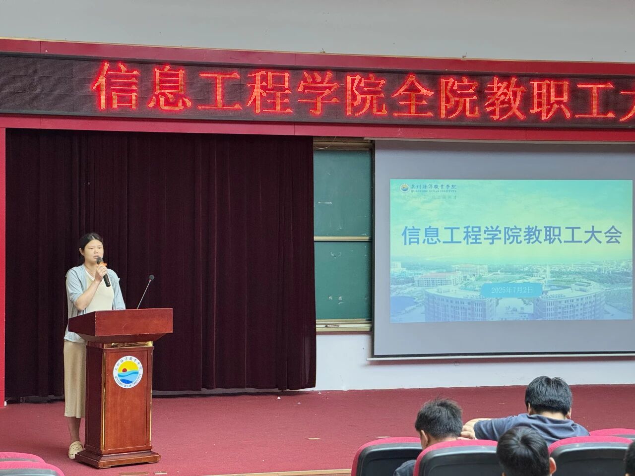 7月2日下午,信息工程学院召开2024-2025学年第二学期期末全院教职工大会。信息工程学院院长贾超、党总支书记陈合喜、副书记温馨、副院长曹金香出席,全院教职工参会。