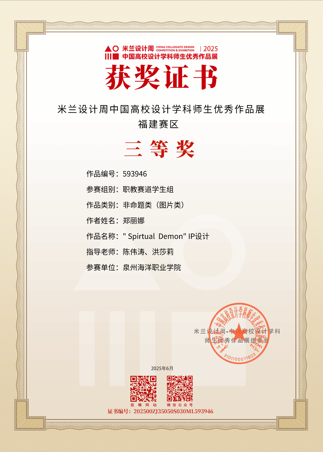 自大赛启动以来,信息工程学院高度重视、精心组织,广泛动员师生参与赛事。学院通过组建专业指导教师团队,对参赛作品进行多轮打磨,最终选出11支优秀团队参加省赛角逐。经过激烈竞争,由陈伟涛、洪莎莉老师指导学生郑丽娜作品《"Spiritual Demon"IP设计》通过视觉符号重构传统文化意象,展现独特的叙事张力,荣获省赛三等奖;由包宇祺、马惠国老师指导学生王甜、陈子瑶、杜闽鑫团队作品《可持续设计磁悬浮加湿器》,以"科技赋能生态"为核心,将磁悬浮技术与可持续理念创新融合荣获省赛一等奖,并作为省赛优秀代表晋级国赛,最终斩获国家级二等奖。