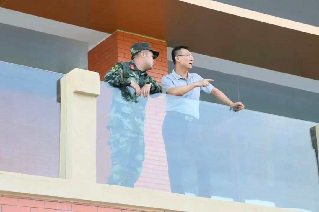 在训练场主席台上,学院领导一行驻足观看学生们的训练情况,对同学们整齐的队列、饱满的精神状态表示赞许。在详细了解训练进度后,领导们与教官、辅导员亲切交流,高度肯定了前者严谨科学的施训方法与后者细致入微的陪伴关怀,并代表学院表达了对大家辛勤付出的衷心感谢。现场气氛温馨融洽,展现了学院上下团结一致、共促军训顺利推进的良好风貌。