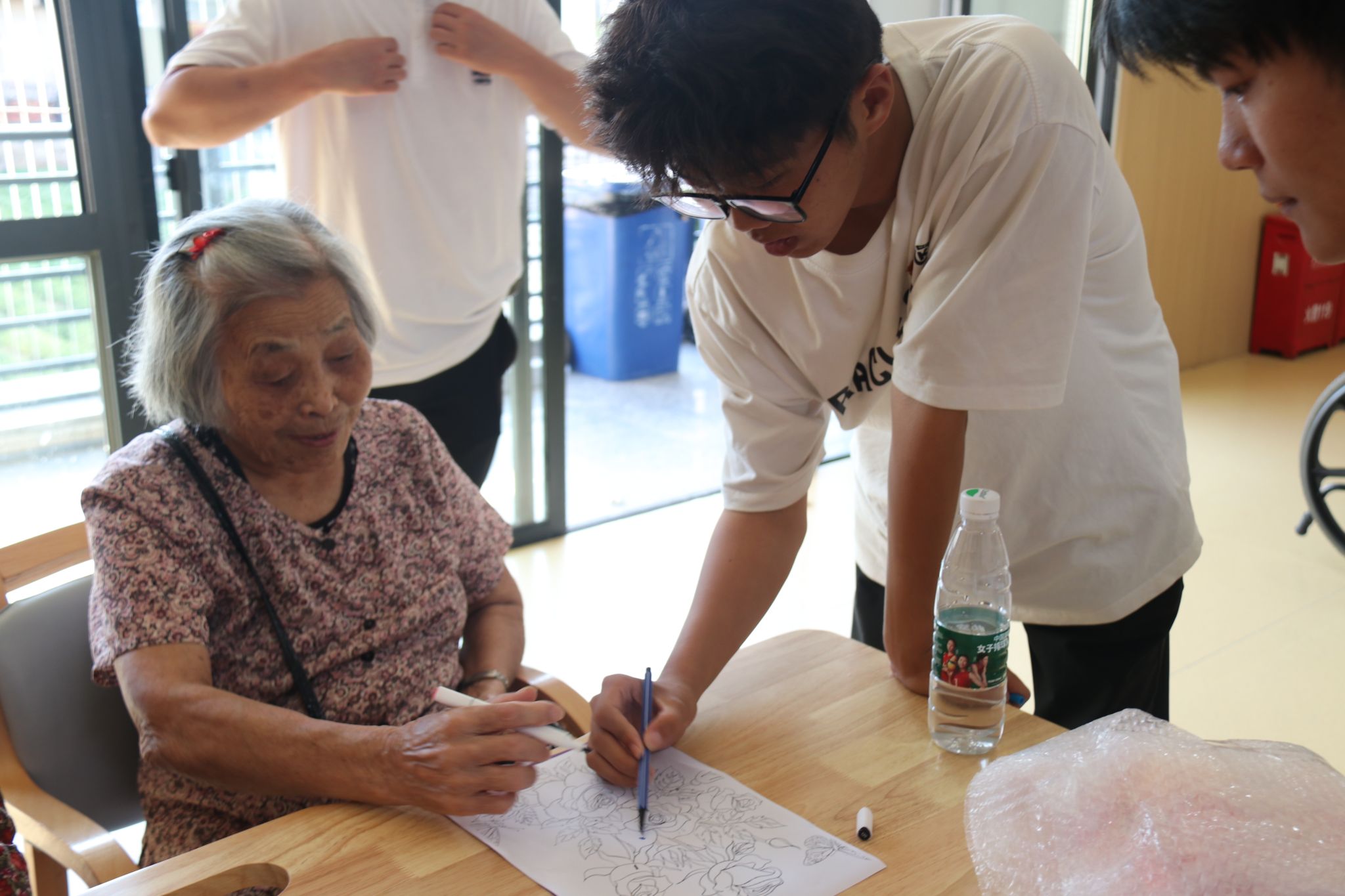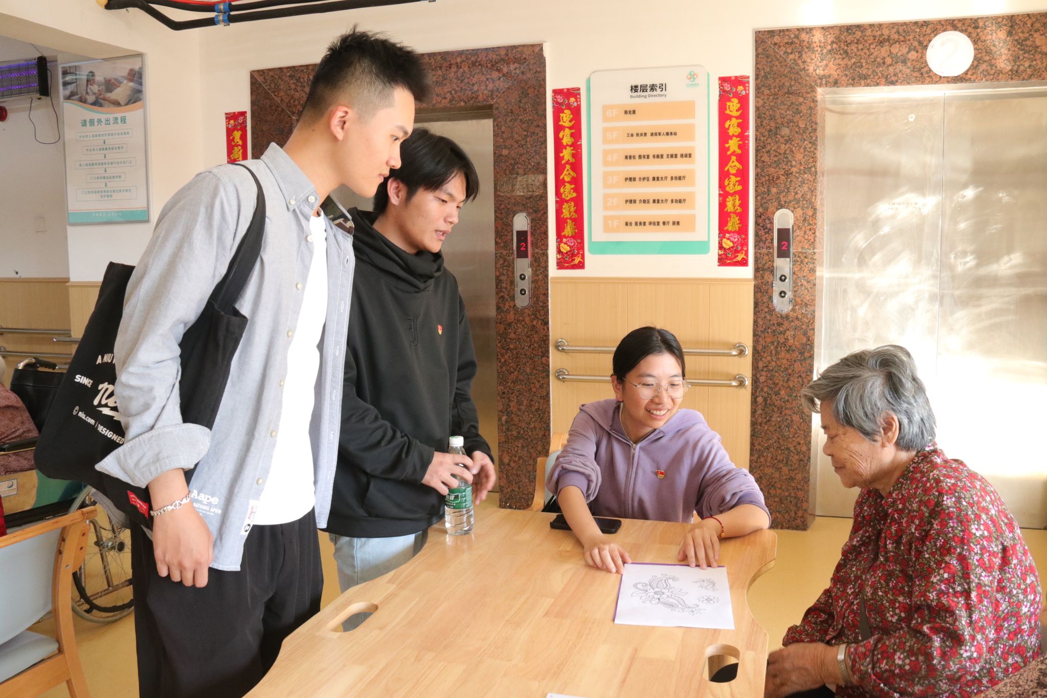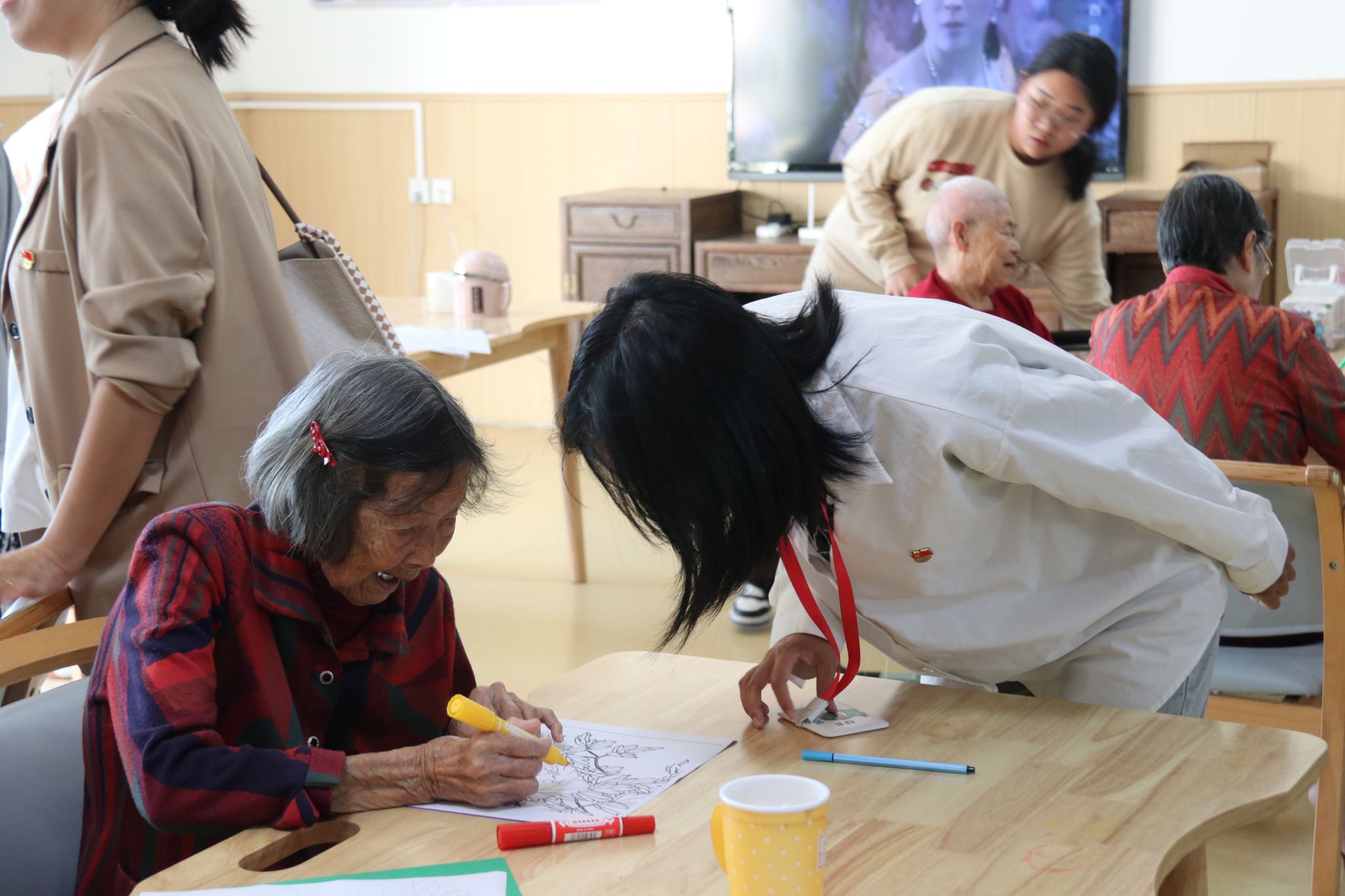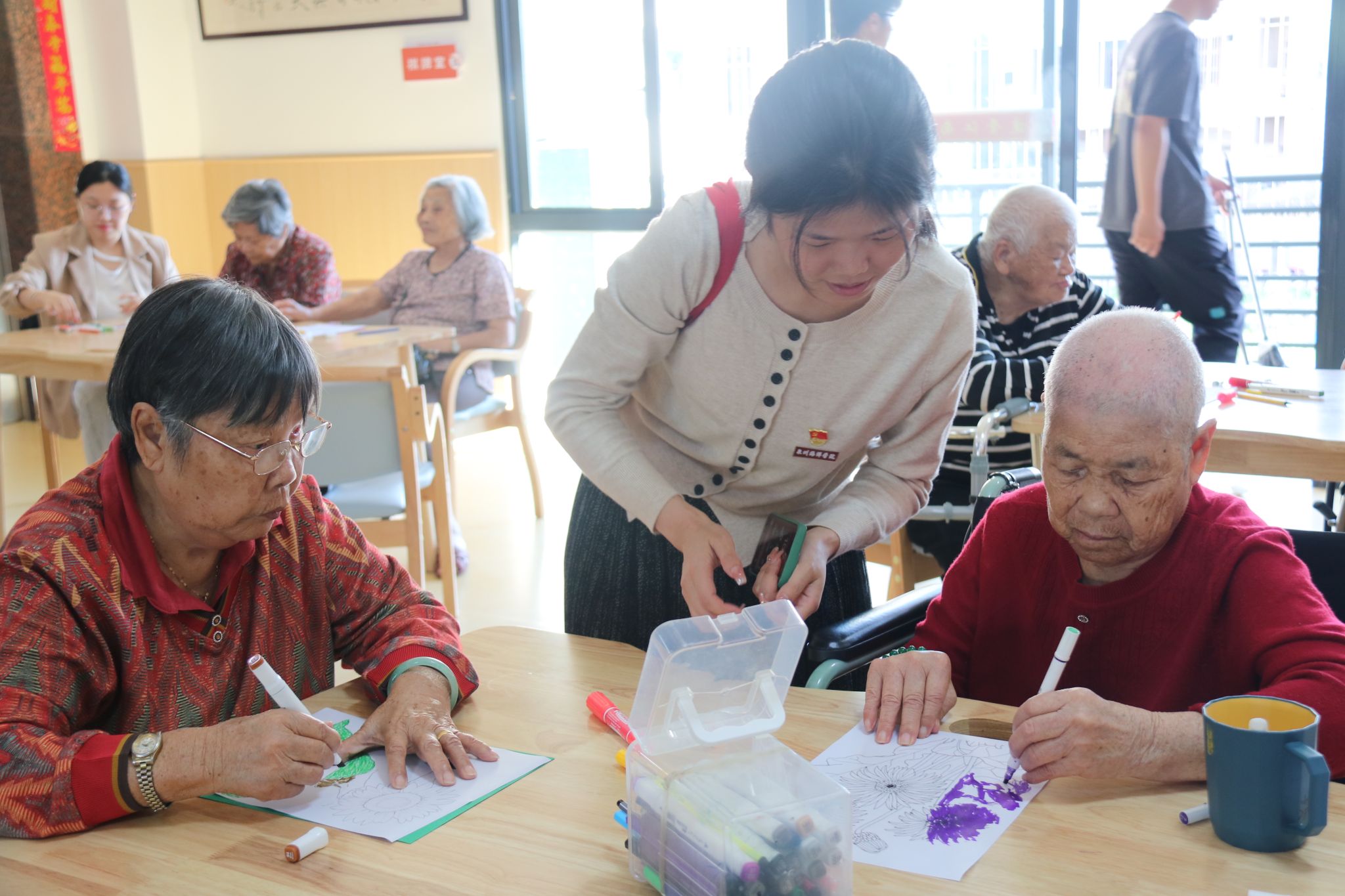 活动室里,来自不同地区的党员们用着蹩脚又可爱的闽南话和老人们你一言我一语聊着天、唱着歌,为桌面上各式各样的图画填色。此刻尽管有着不同的年龄、不同的身份,但却其乐融融地像是一家人。