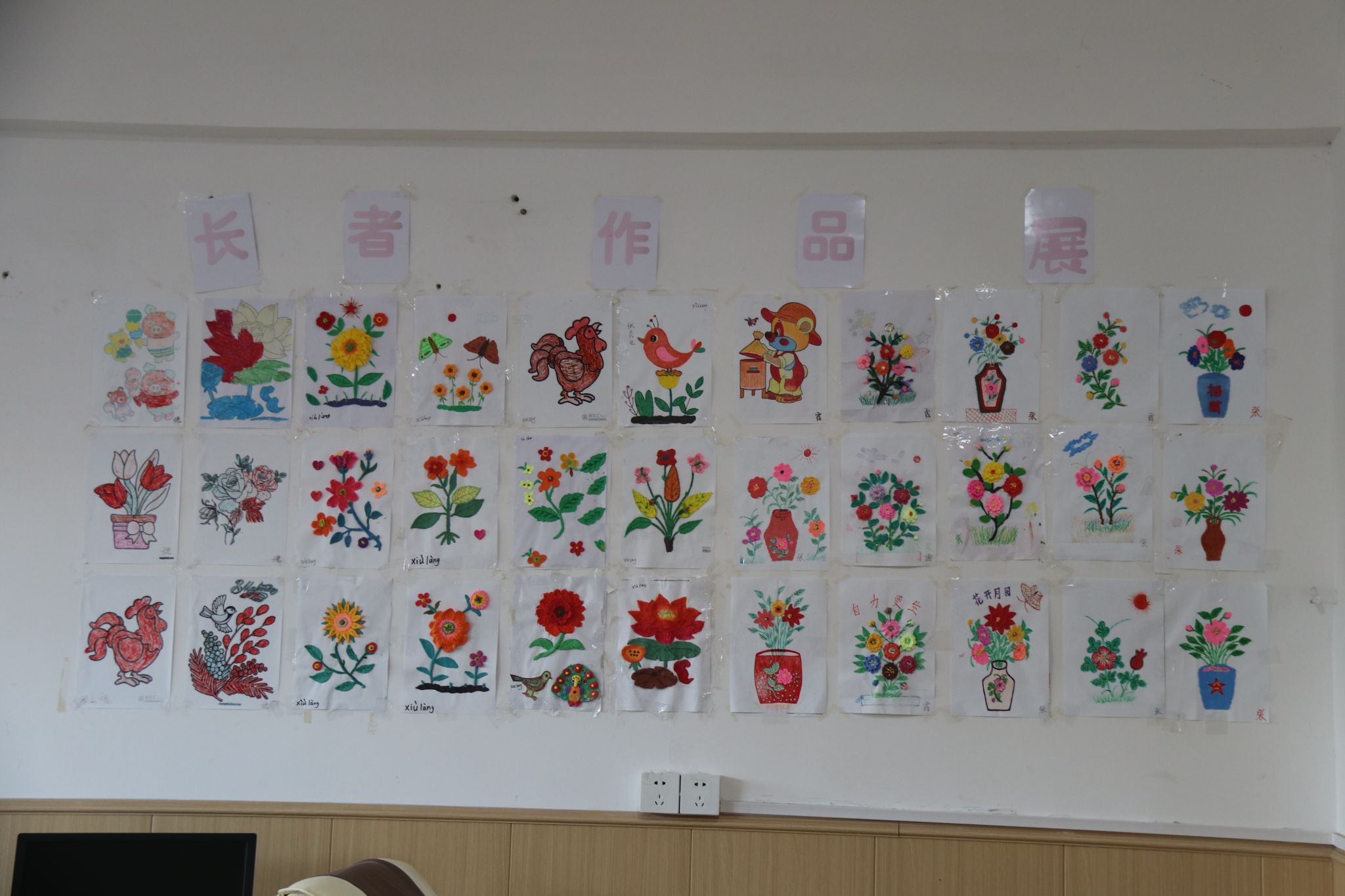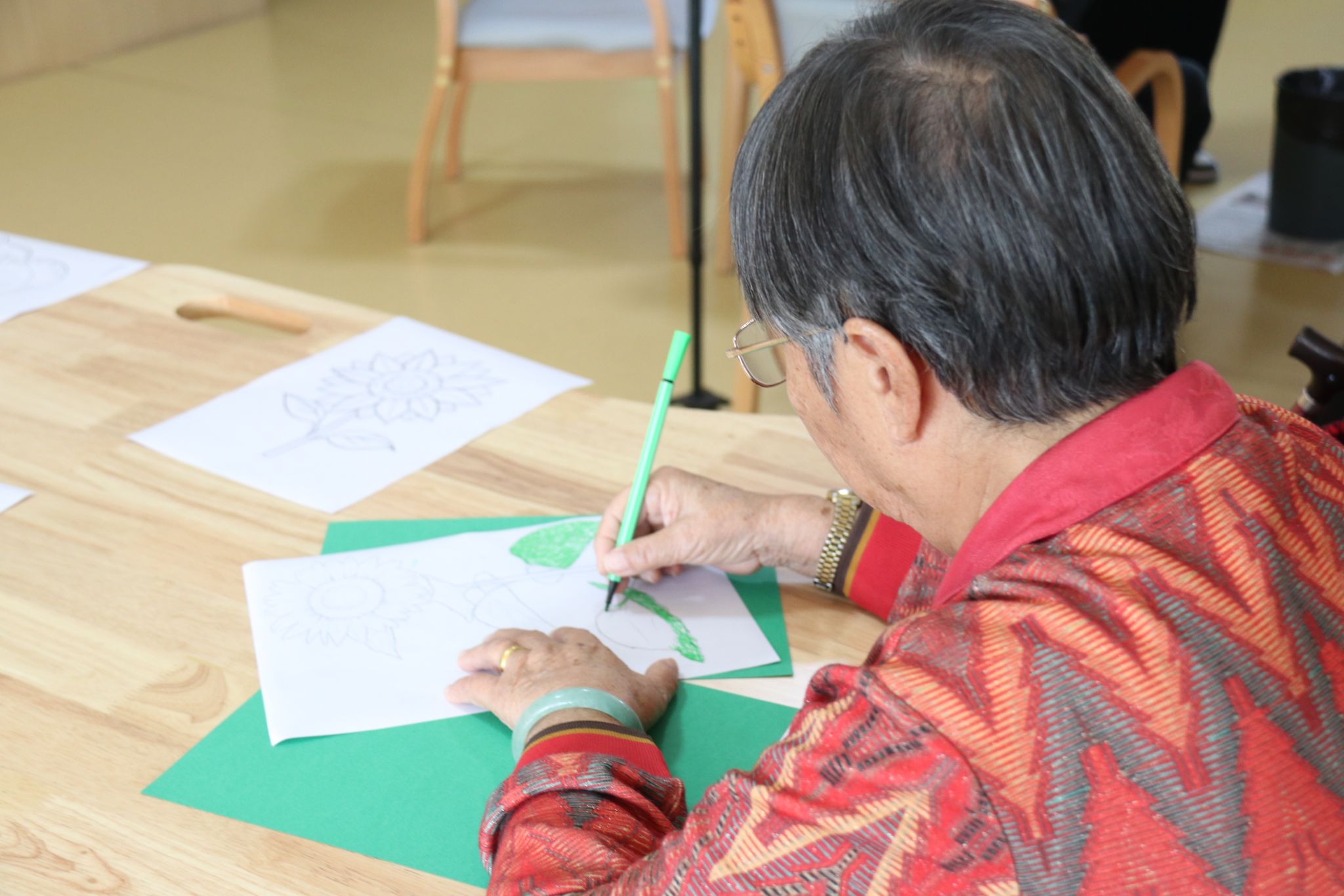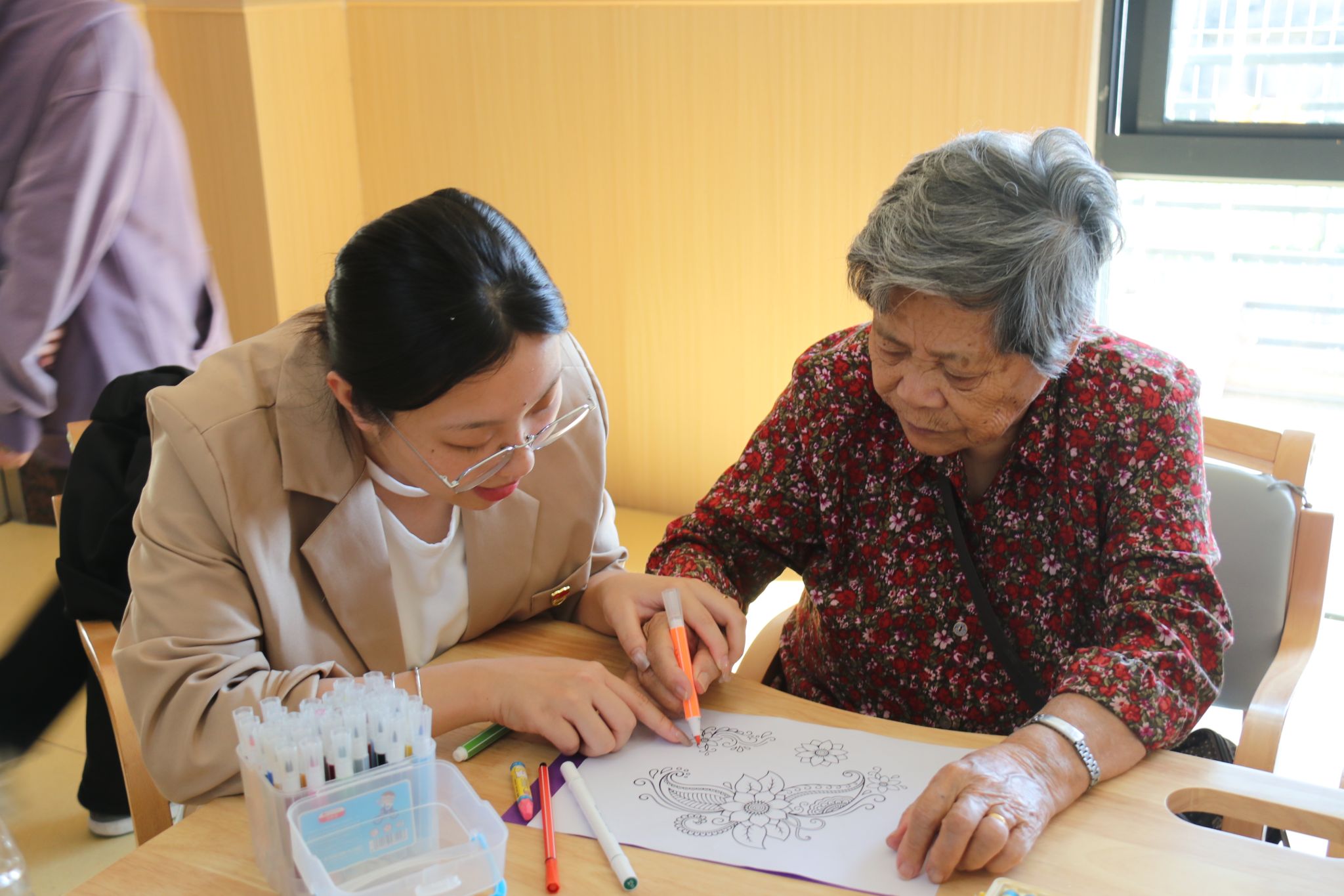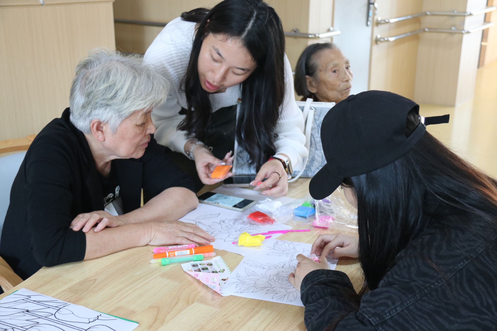 活动室里,来自不同地区的党员们用着蹩脚又可爱的闽南话和老人们你一言我一语聊着天、唱着歌,为桌面上各式各样的图画填色。此刻尽管有着不同的年龄、不同的身份,但却其乐融融地像是一家人。