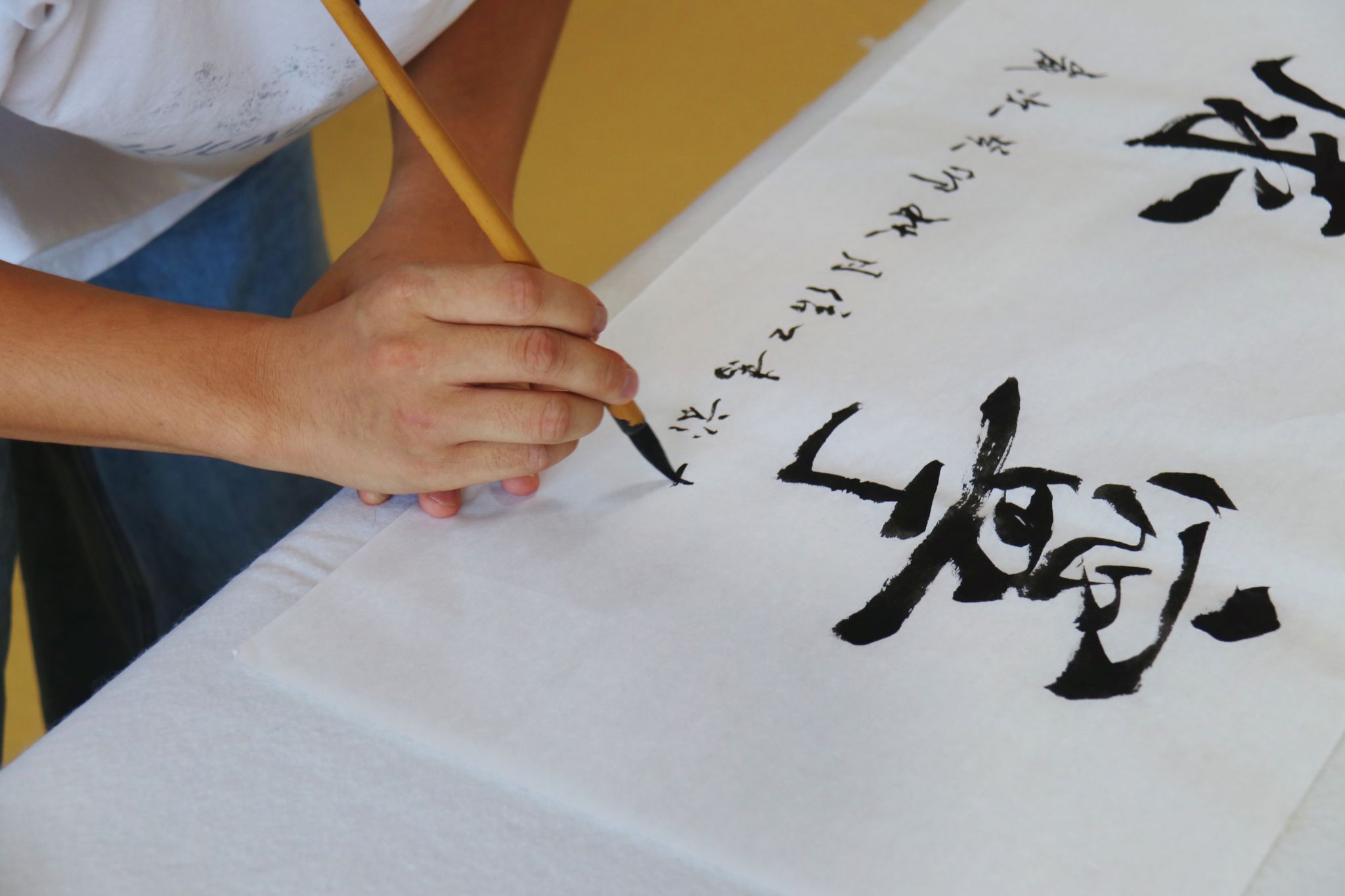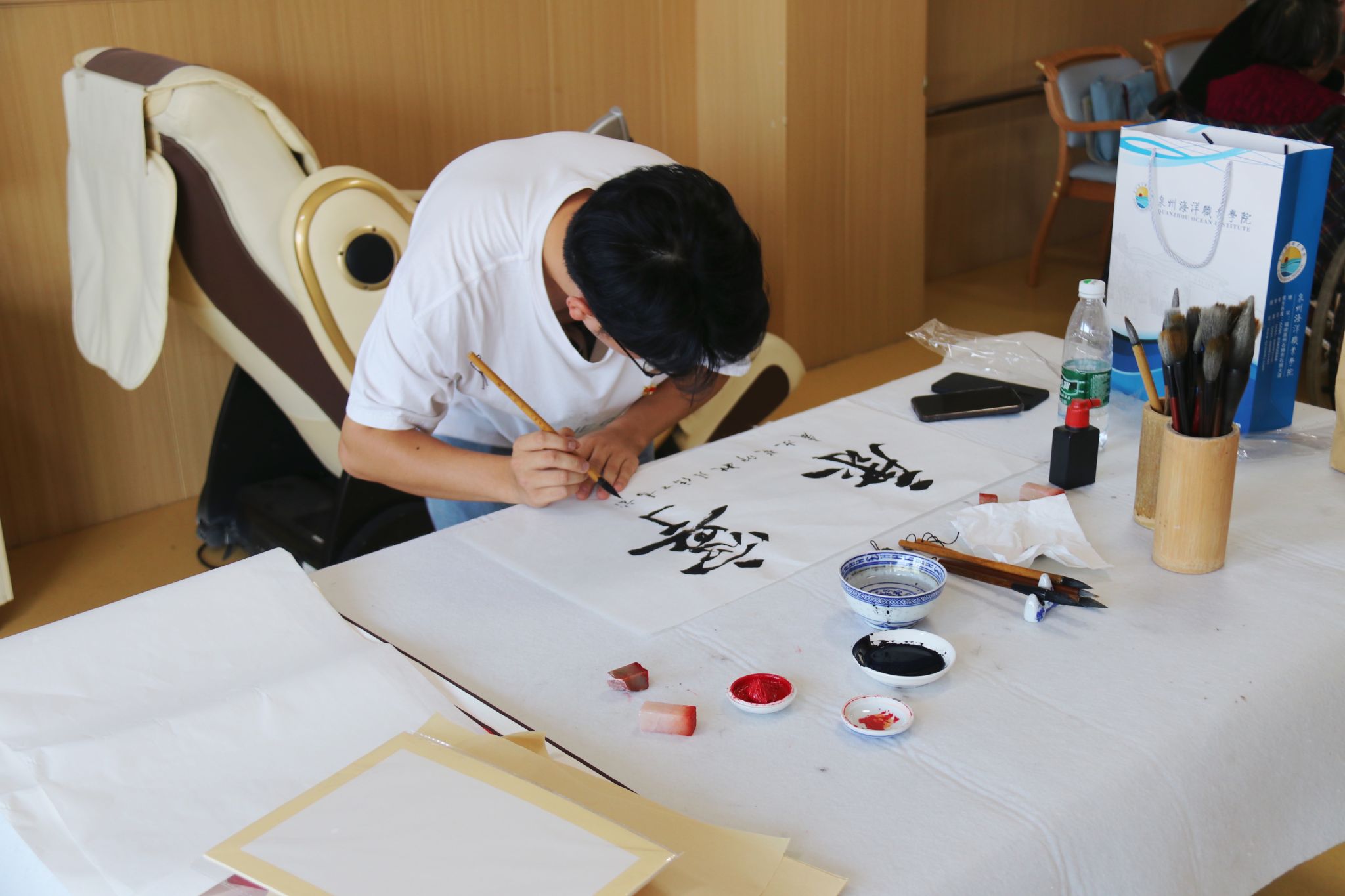 在敬老院的一角,杨佳兴老师挥洒笔墨亲手写下祝福,向敬老院的老人们赠送了毛笔自绘书法卷轴和自绘展示牌。不同的文字汇聚成共同的关爱与心愿,在一撇一捺中连接着每个人。