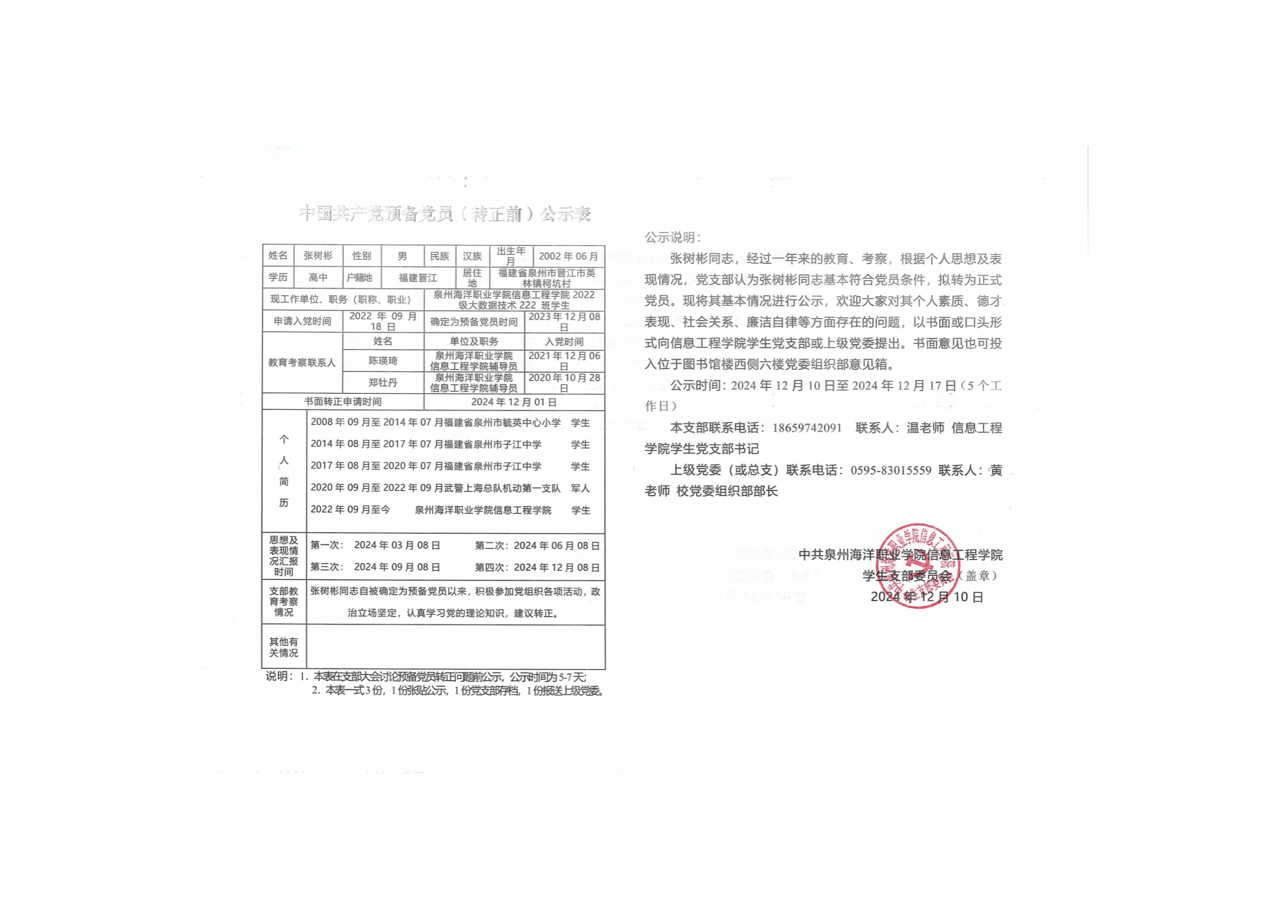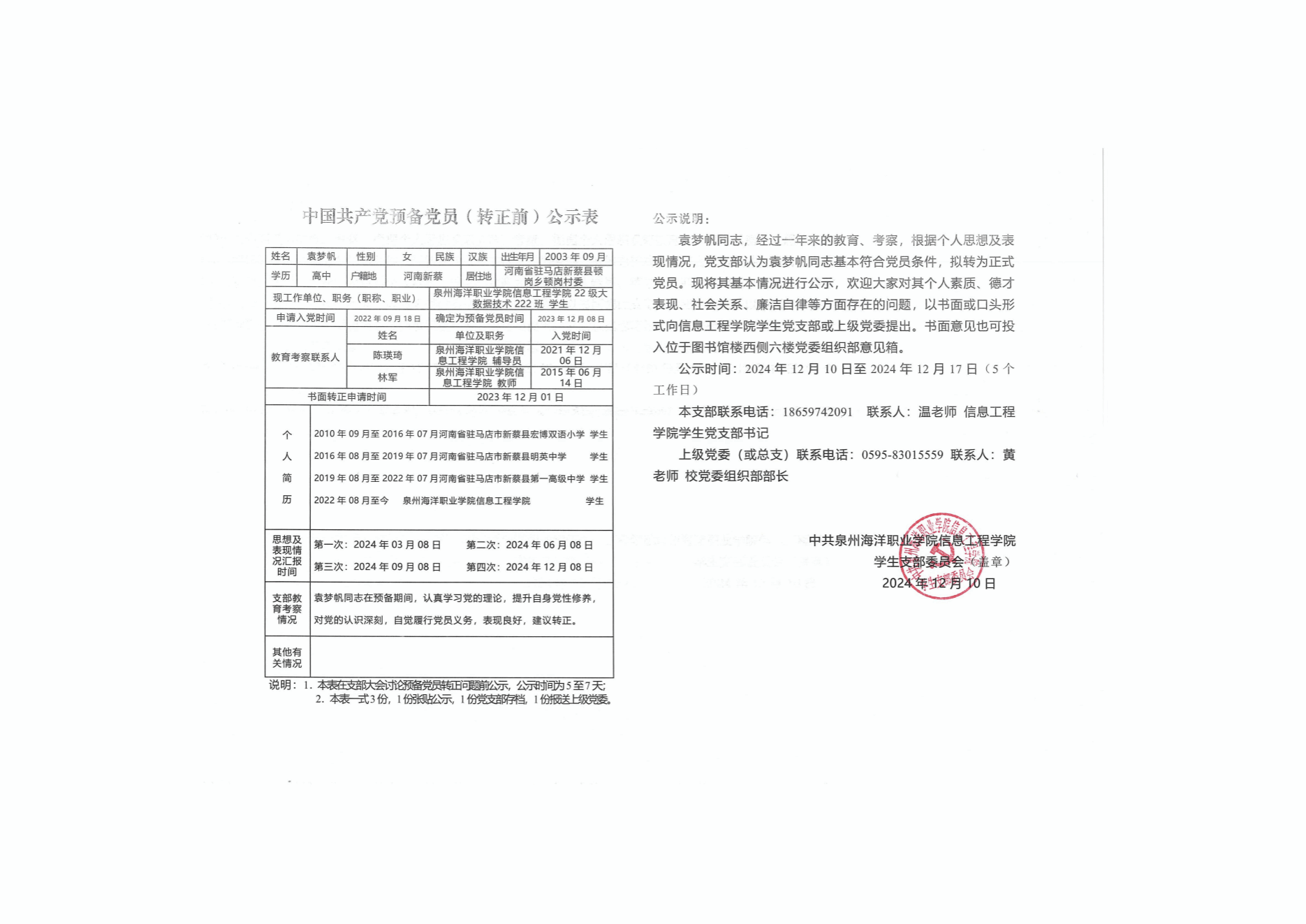 袁梦帆、张树彬、王强岭、张辉鹏、王佳昌、林梦婷、郑嘉怡、姚银娟等8名同志,经过一年来的教育、考察,根据个人思想及表现情况,党支部认为袁梦帆、张树彬、王强岭、张辉鹏、王佳昌、林梦婷、郑嘉怡、姚银娟等8名同志基本符合党员条件,拟转为正式党员。
