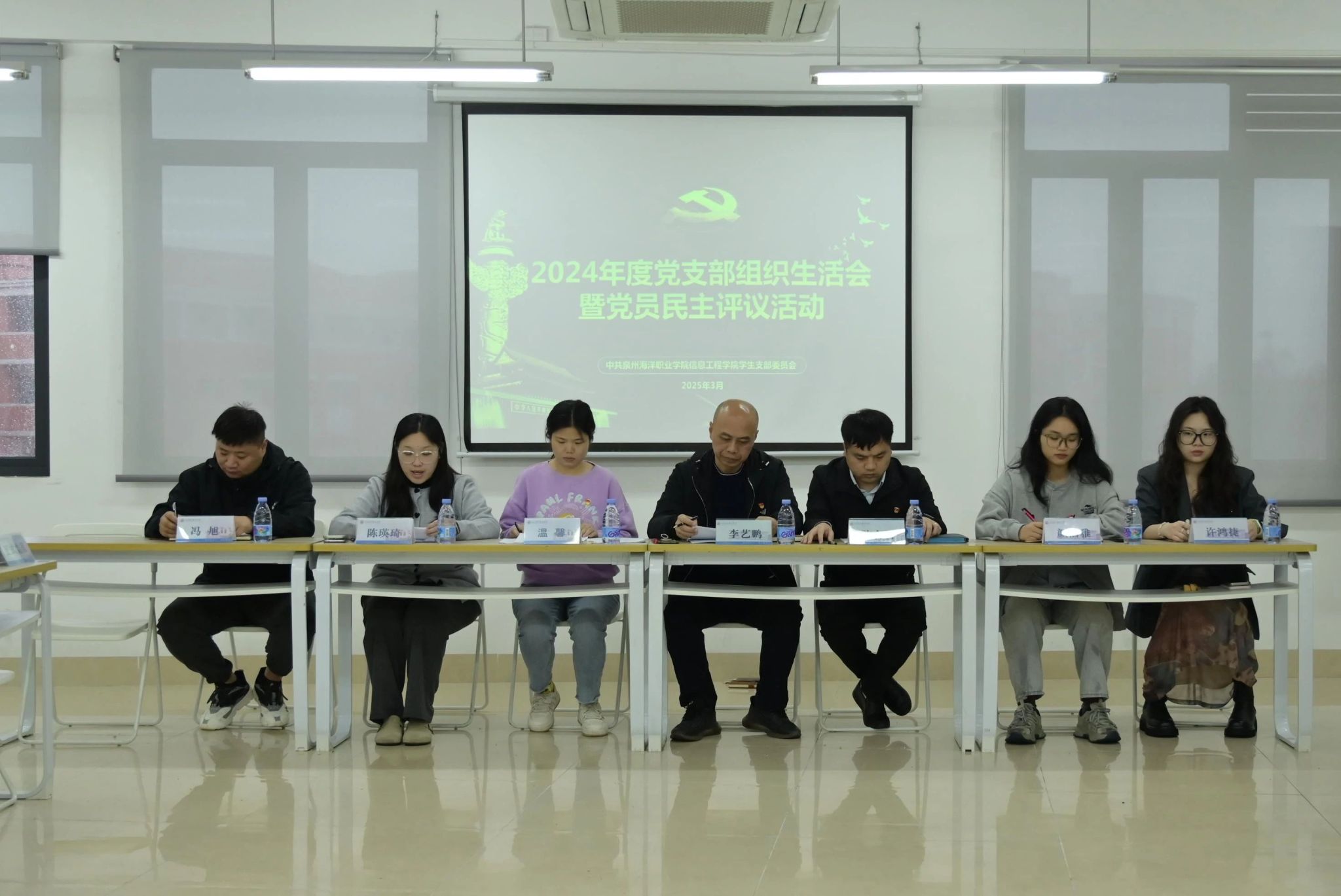为深入学习贯彻习近平新时代中国特色社会主义思想,巩固深化党纪学习教育成果,综合发挥党的纪律教育约束、保障激励作用,2025年3月4日,信息工程学院学生党支部召开组织生活会暨2024年度民主评议大会,泉州海洋职业学院校党委委员李艺鹏、信息工程学院党总支书记陈合喜参会指导,信息工程学院学生党支部全体党员参会。