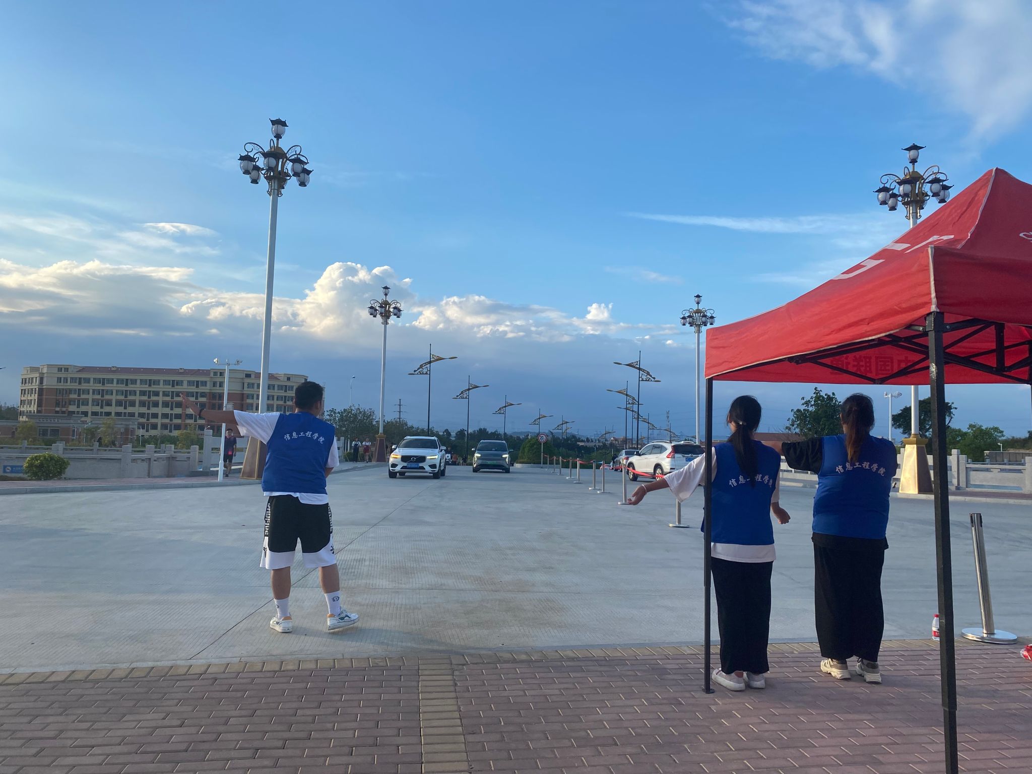 烈日炎炎,“蓝帆”志愿者们身穿马甲,按照岗位安排在校园主干道和交岔路口上有序进行指挥。志愿者们用一张张笑脸、一个个手势、一句句温馨提示确保校园交通流畅,共创文明校园!