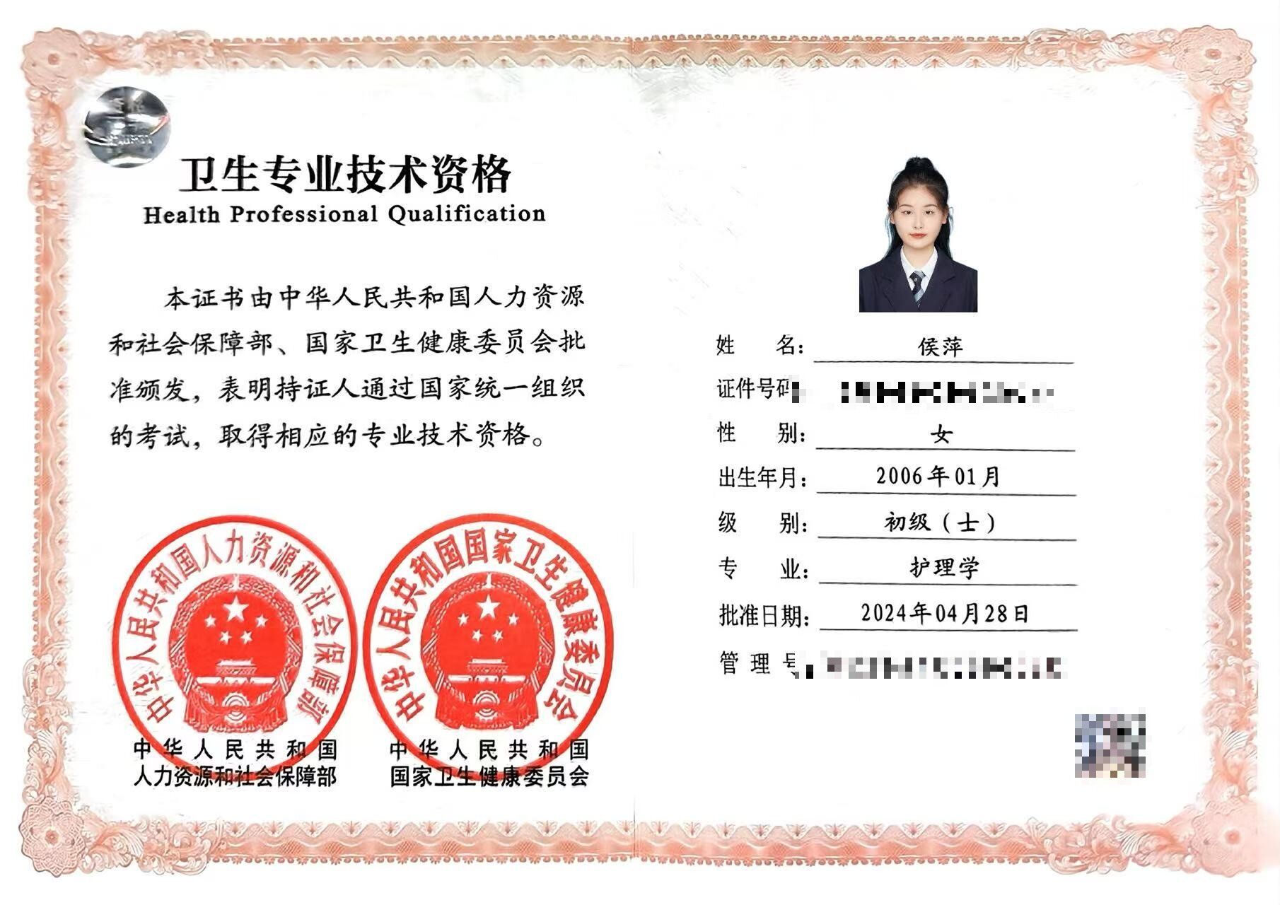 侯萍,女,共青团员,健康休闲学院护理2402班班长,兼任校红十字会副会长。2024—2025学年专业成绩排名1/590,综合测评成绩排名1/590,曾获泉州海洋职业学院“三好学生”、福建省高职高专院校“理论引航 强国有我”大学生理论知识竞赛一等奖、石狮市第七届校园心理情景剧大赛三等奖、泉州海洋职业学院学习贯彻党的二十届三中全会精神文化作品展一等奖等荣誉奖项。持有护士执业资格证、高级育婴师证、中级养老护理员、计算机一级等级等证书。志愿服务时长769小时。