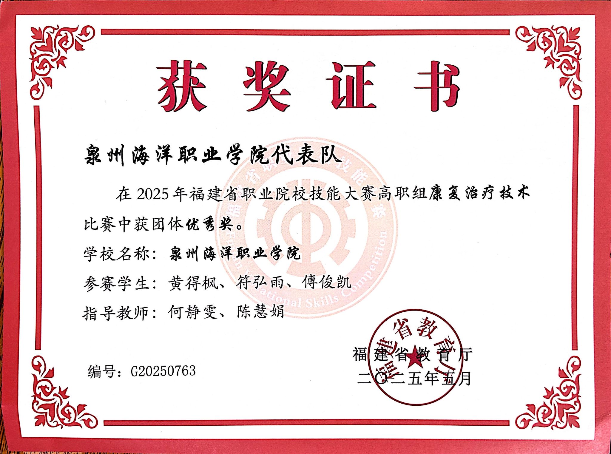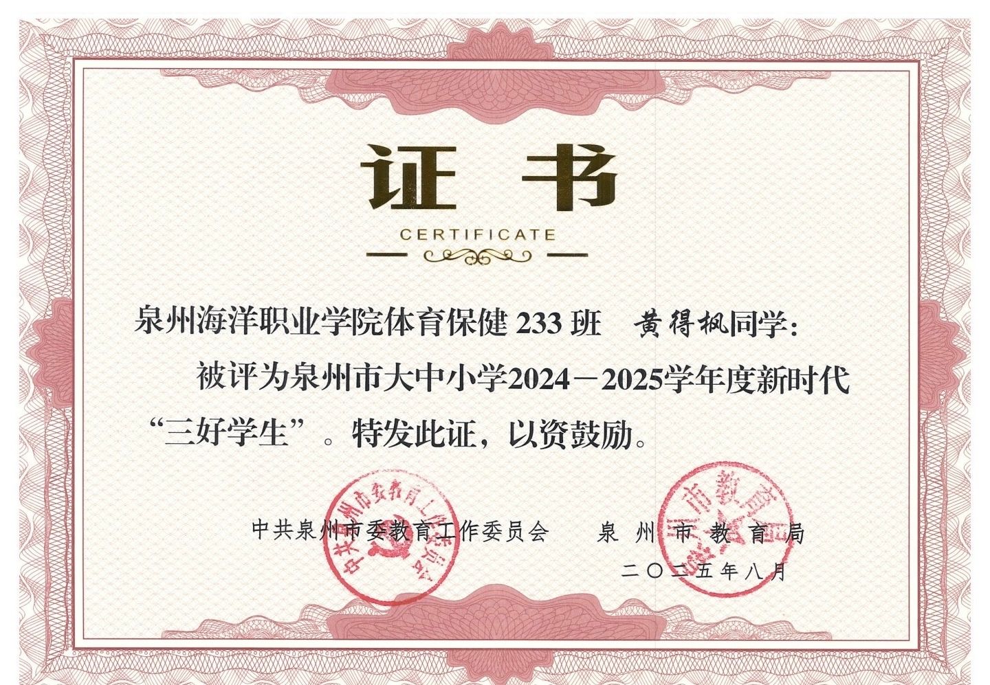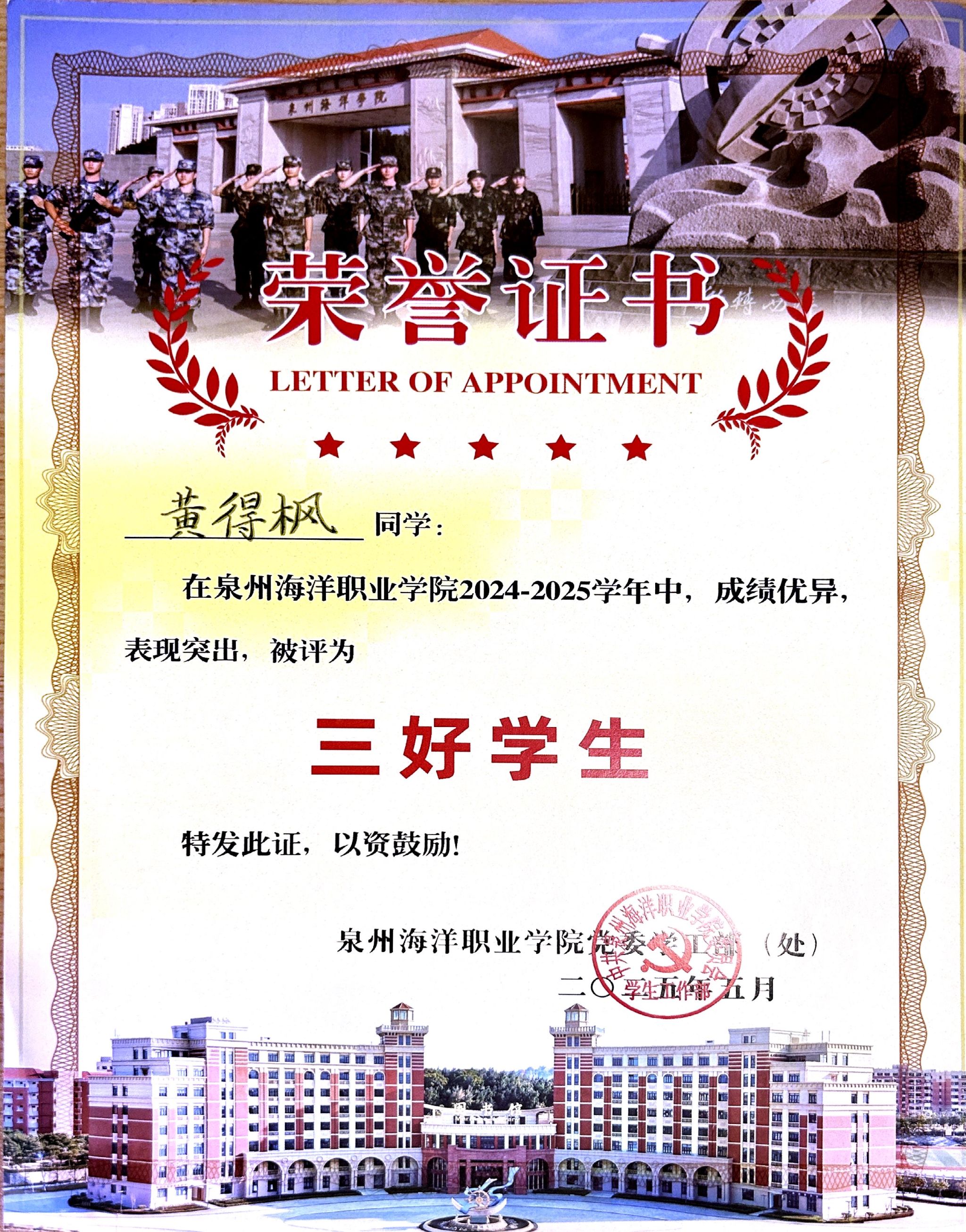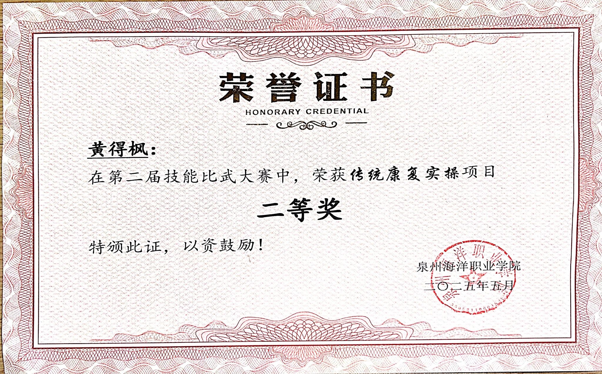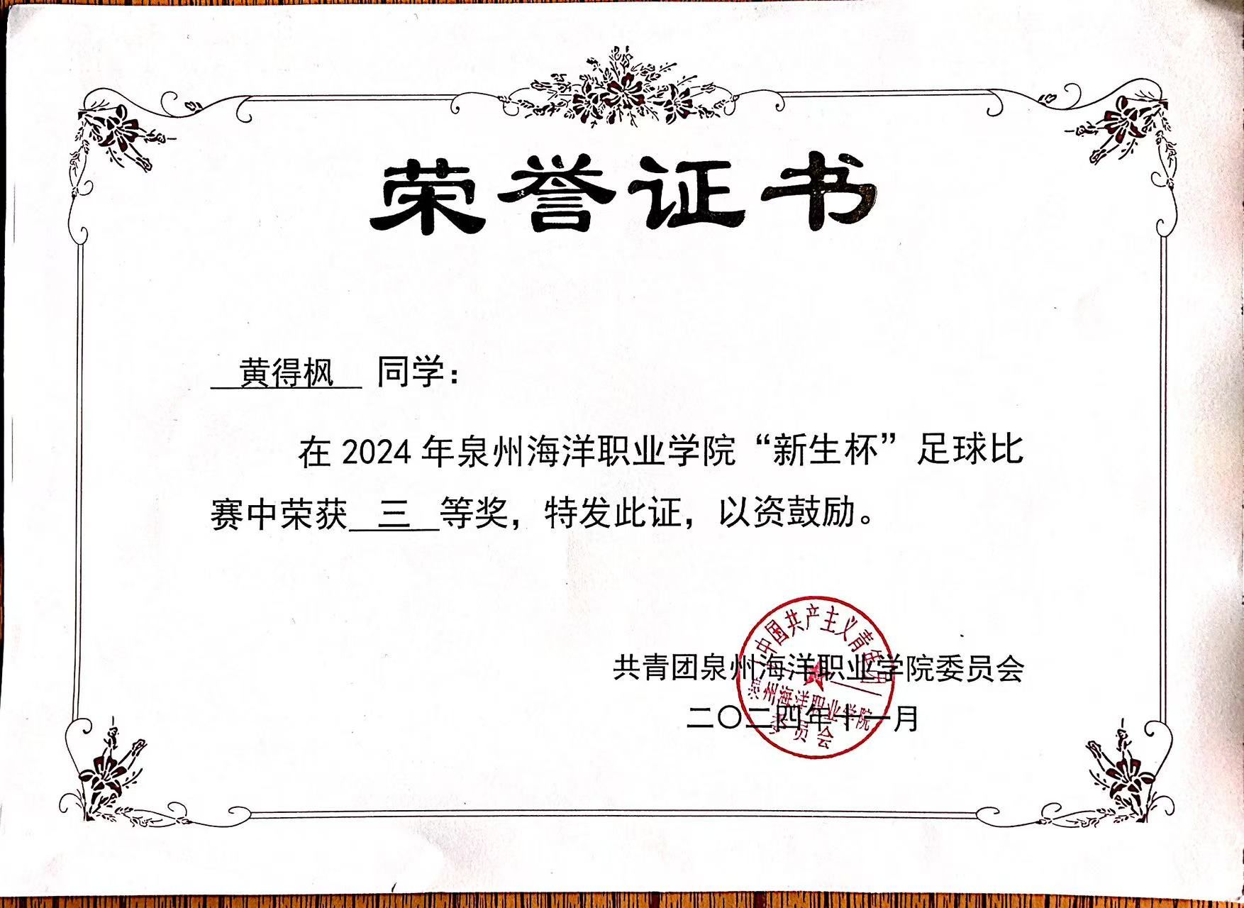 黄得枫,男,共青团员,健康休闲学院体育保健与康复233班学习委员,2024—2025学年专业成绩排名1/156,综合测评成绩排名1/156,曾获福建省职业院校技能大赛高职组康复治疗技术比赛团体优秀奖、泉州市“三好学生”、泉州海洋职业学院“三好学生”、泉州海洋职业学院第二届技能比式大赛传统康复实操项目二等奖、泉州海洋职业学院“新生杯”足球比赛三等奖。曾获国家二级运动员,福建足协E级教练员,红十字救护员,保健推拿等证书。志愿服务时长106.43小时。