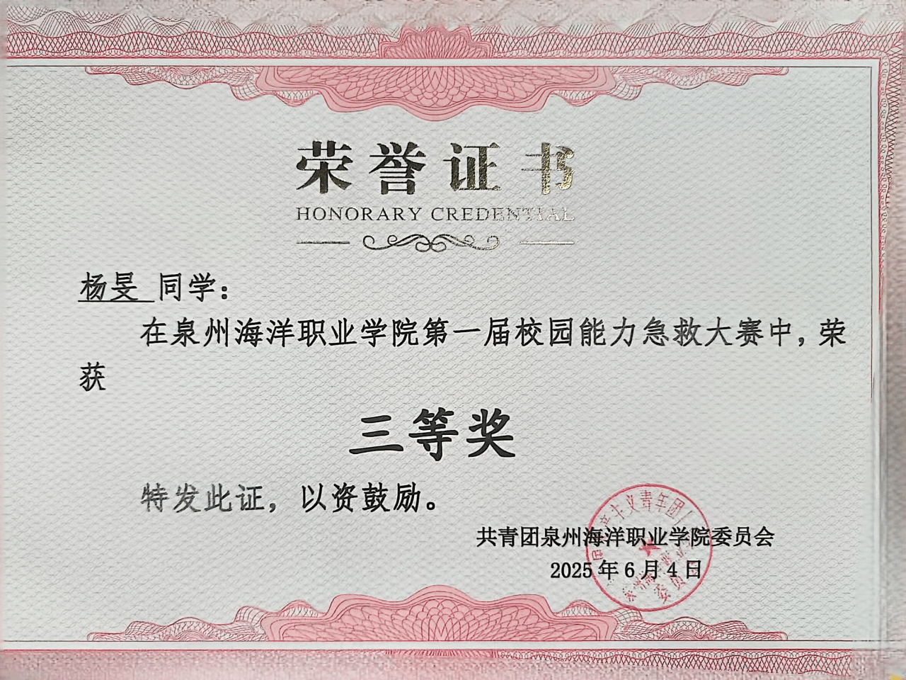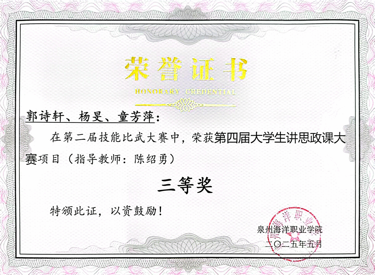 杨旻,女,共青团员,健康休闲学院体保2401班学习委员,兼任院团委小螺号青年志愿者协会第一负责人和学生资助志愿服务协会宣传部第一负责人。2024—2025学年专业成绩排名2/172,综合测评成绩排名1/172,曾获泉州海洋职业学院“优秀学生标兵”、“优秀学生干部”、2025年廉洁文化作品征集活动二等奖”、第四届大学生讲思政课大赛三等奖、第一届校园能力急救大赛三等奖。志愿服务时长556小时。