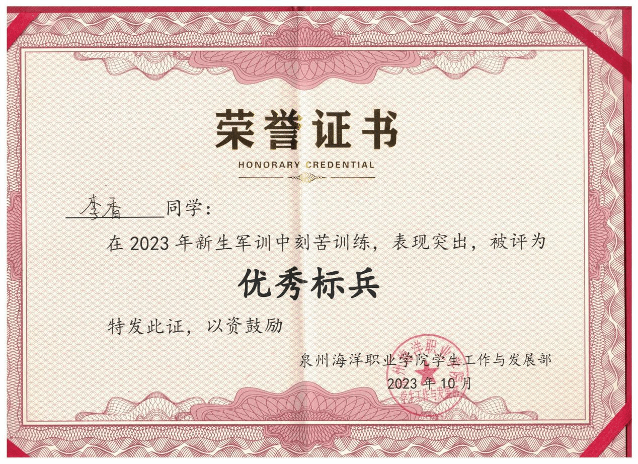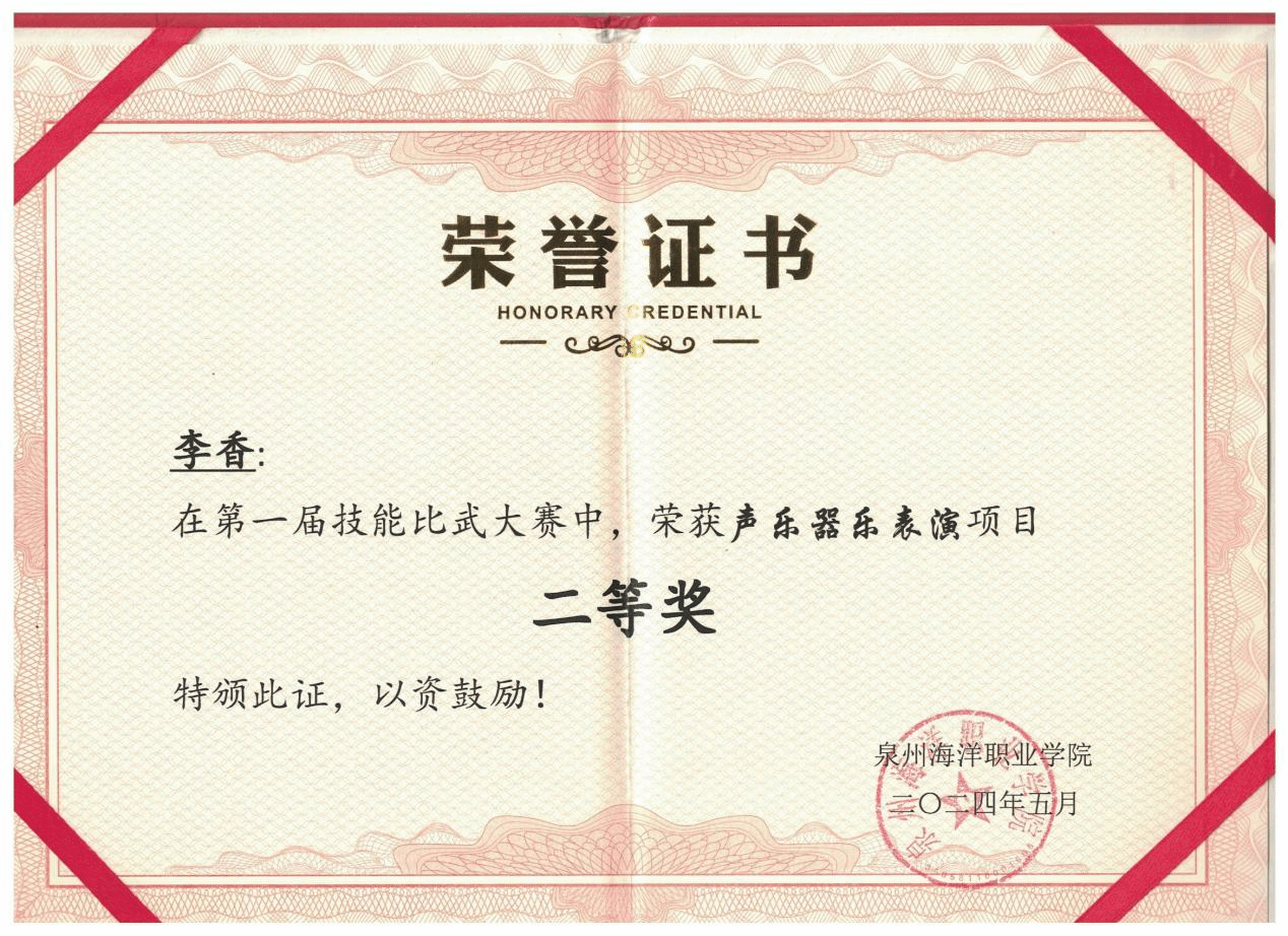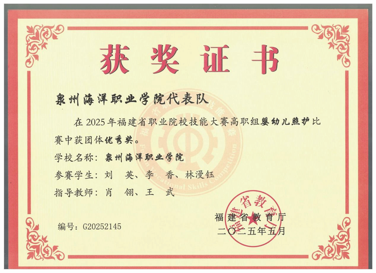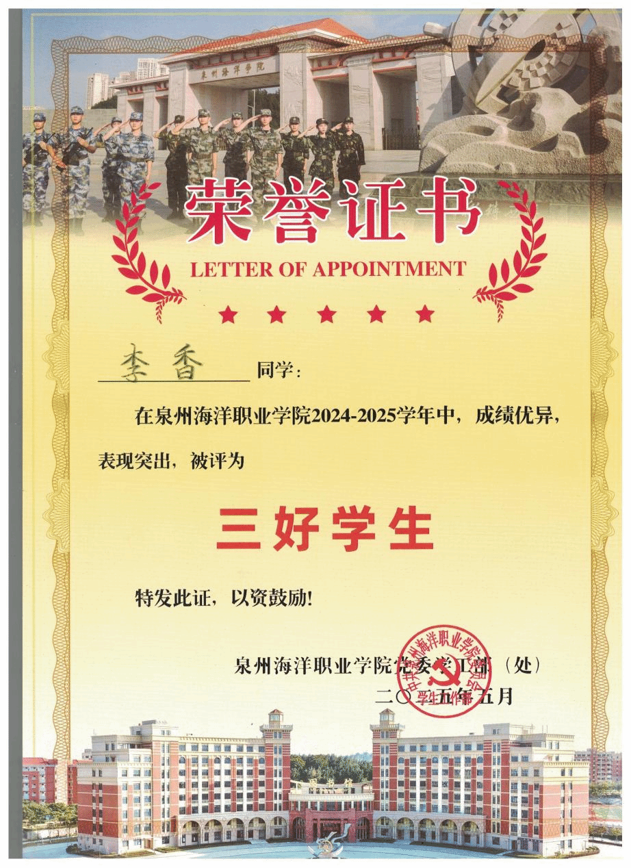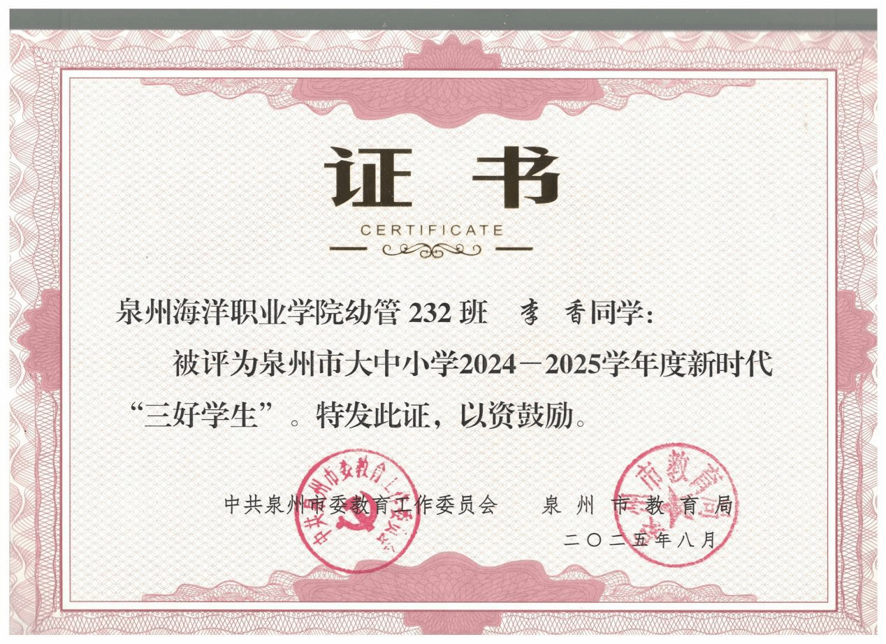 李香,女,中共预备党员,健康休闲学院婴幼儿托育服务与管理232班副班长,兼任院团委组织部第二负责人。2024—2025学年专业成绩排名1/131,综合测评成绩排名1/131,曾获全国艺术大赛“特金奖”、省级展演“优秀指导教师奖”、泉州市“三好学生”、泉州海洋职业学院“三好学生”“技能比武大赛一等奖”等。曾获高级育婴员证书、红十字救护员证书、计算机一级等级证书。志愿服务时长299小时。