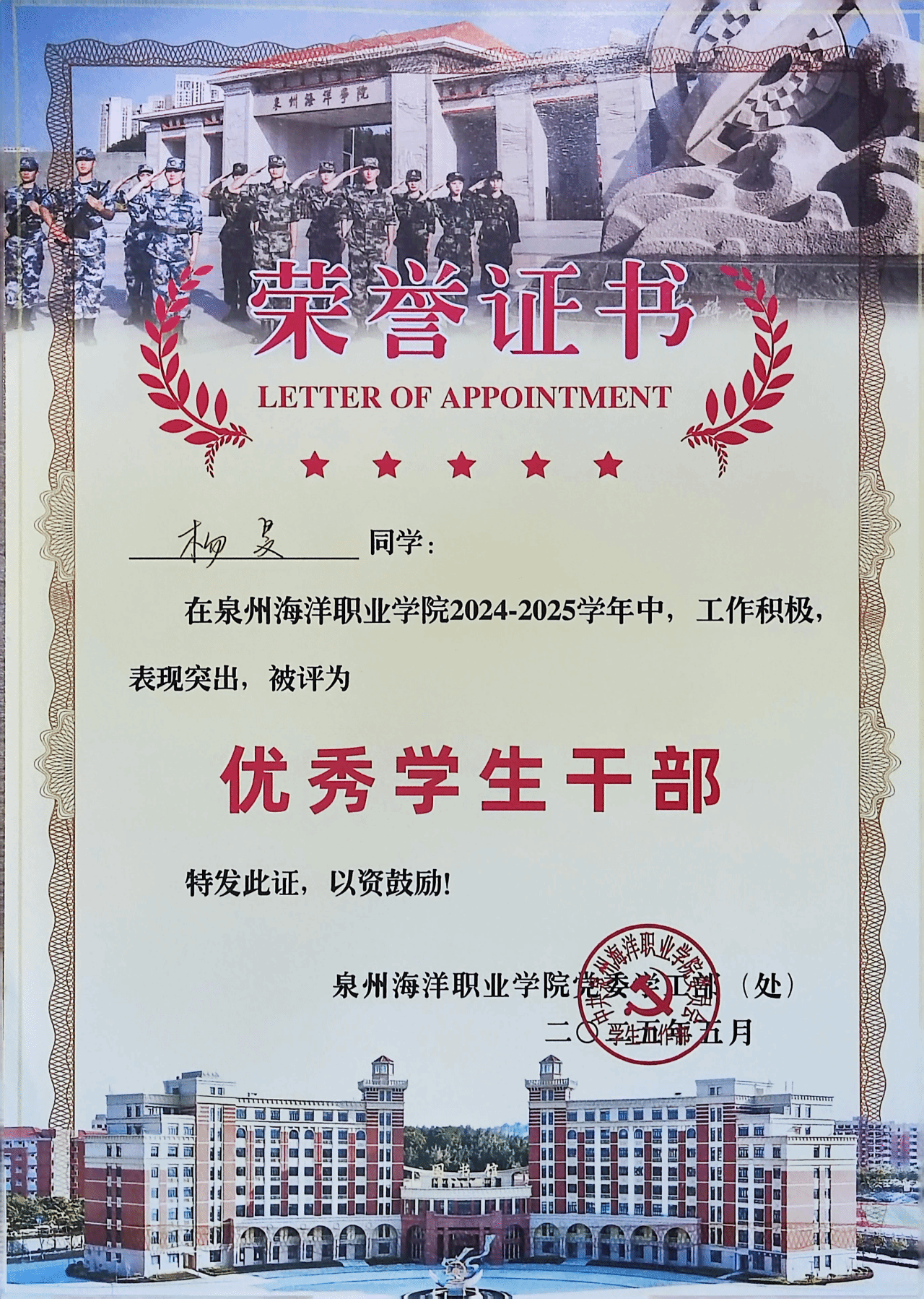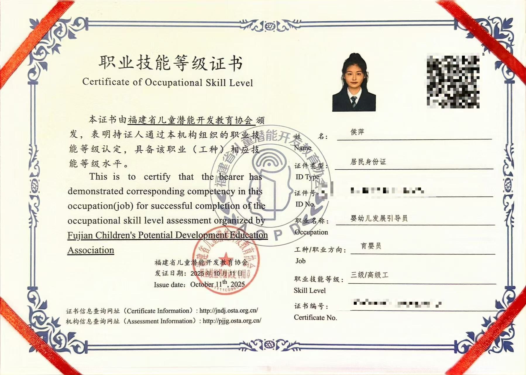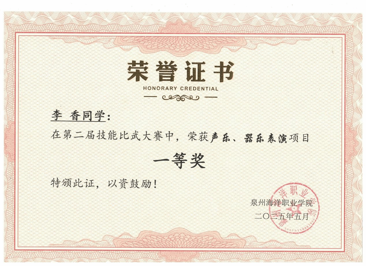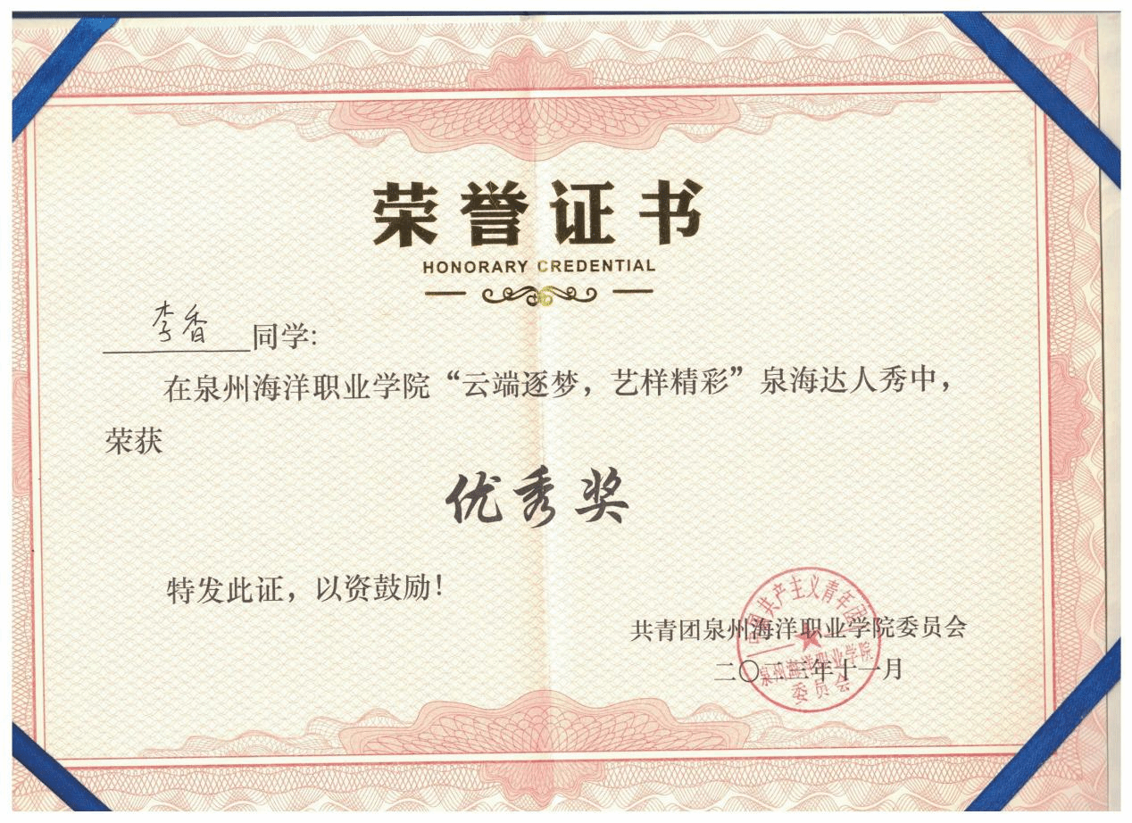 李香,女,中共预备党员,健康休闲学院婴幼儿托育服务与管理232班副班长,兼任院团委组织部第二负责人。2024—2025学年专业成绩排名1/131,综合测评成绩排名1/131,曾获全国艺术大赛“特金奖”、省级展演“优秀指导教师奖”、泉州市“三好学生”、泉州海洋职业学院“三好学生”“技能比武大赛一等奖”等。曾获高级育婴员证书、红十字救护员证书、计算机一级等级证书。志愿服务时长299小时。