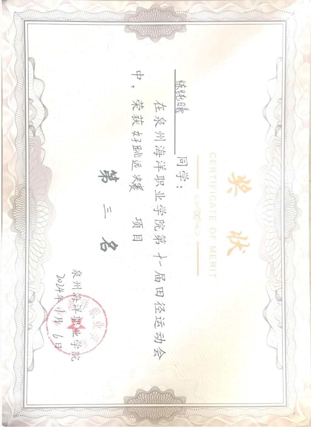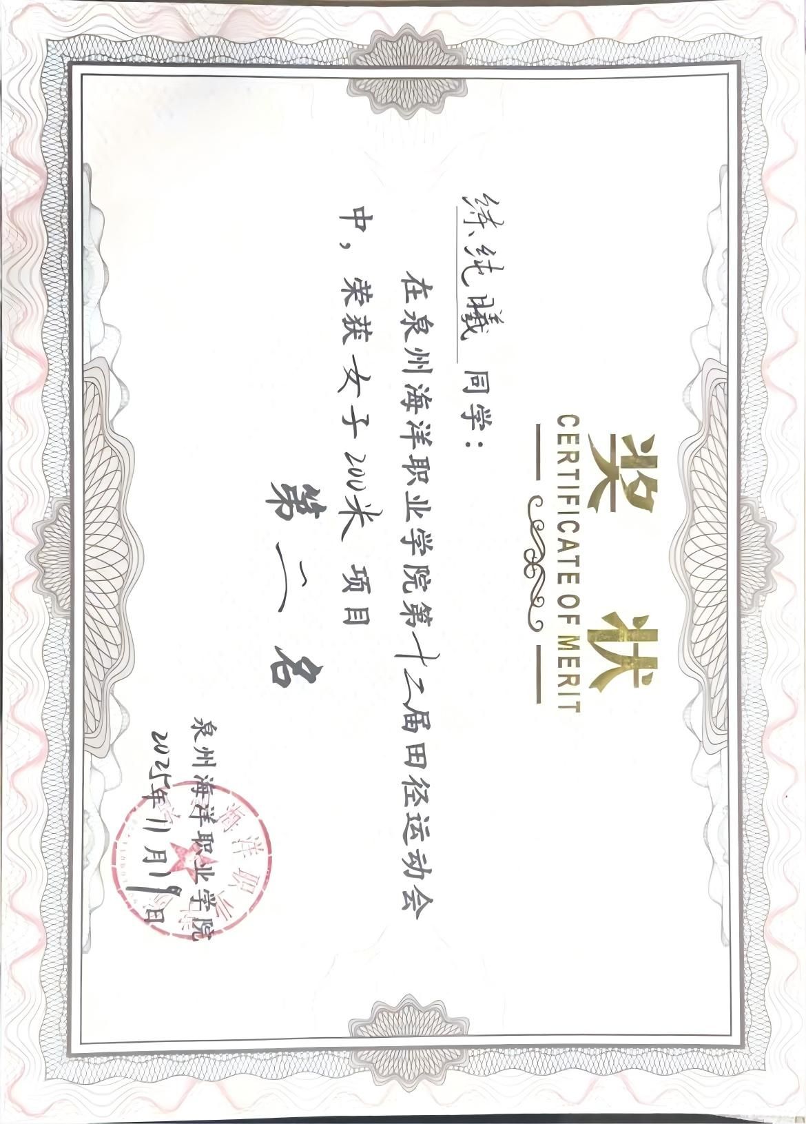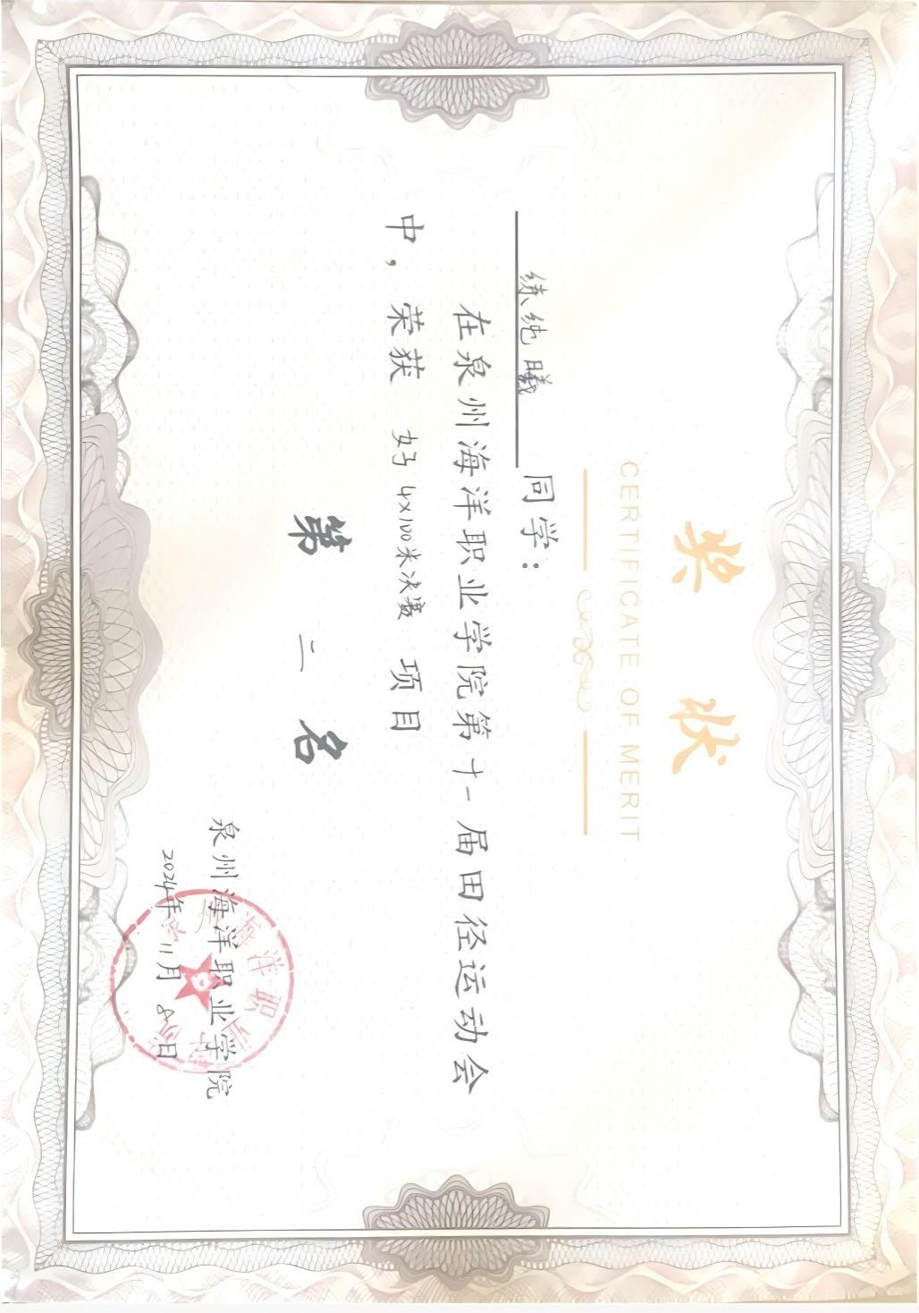 黄庆丽,女,共青团员,2024-2025学年专业成绩排名5/156,综合测评成绩排名3/156,曾获泉州海洋职业学院“优秀共青团员”“优秀学生标兵”“福建省优秀志愿者”“女子1500米第二名”“校运会女子4×400第一名”等奖项。志愿服务时长共361小时。