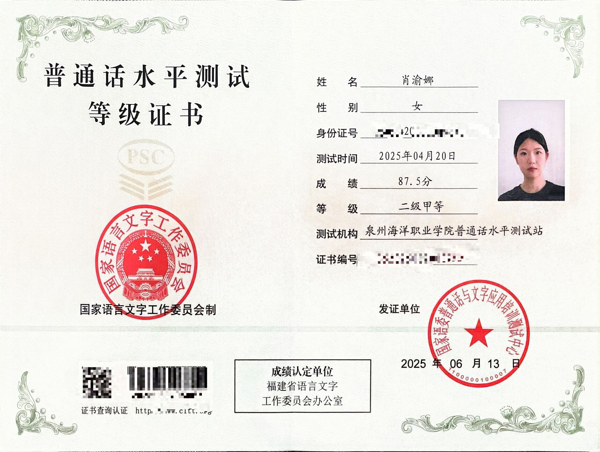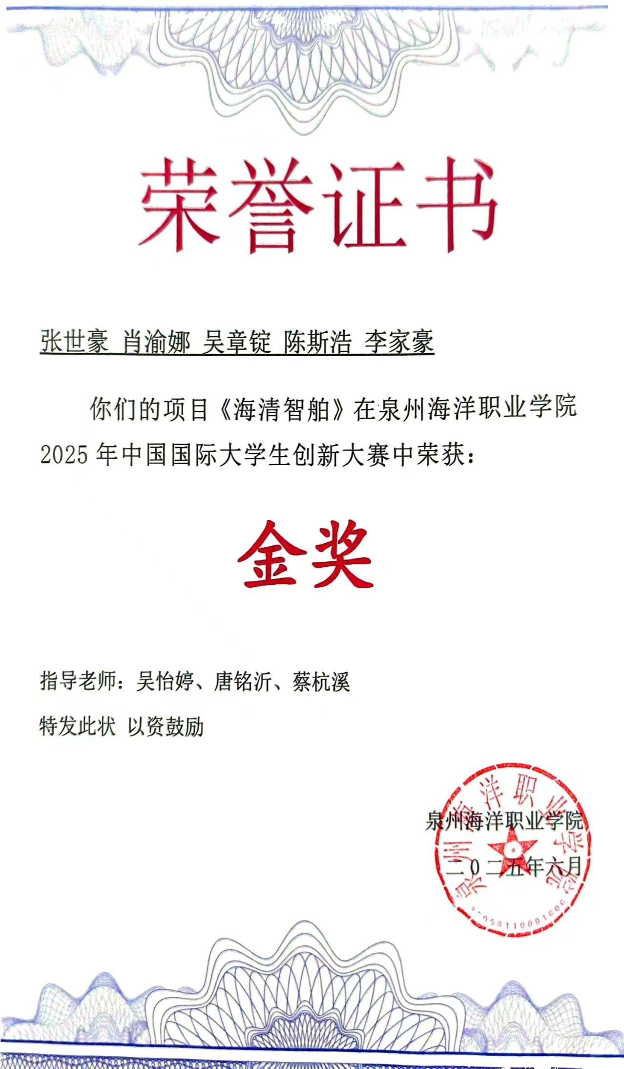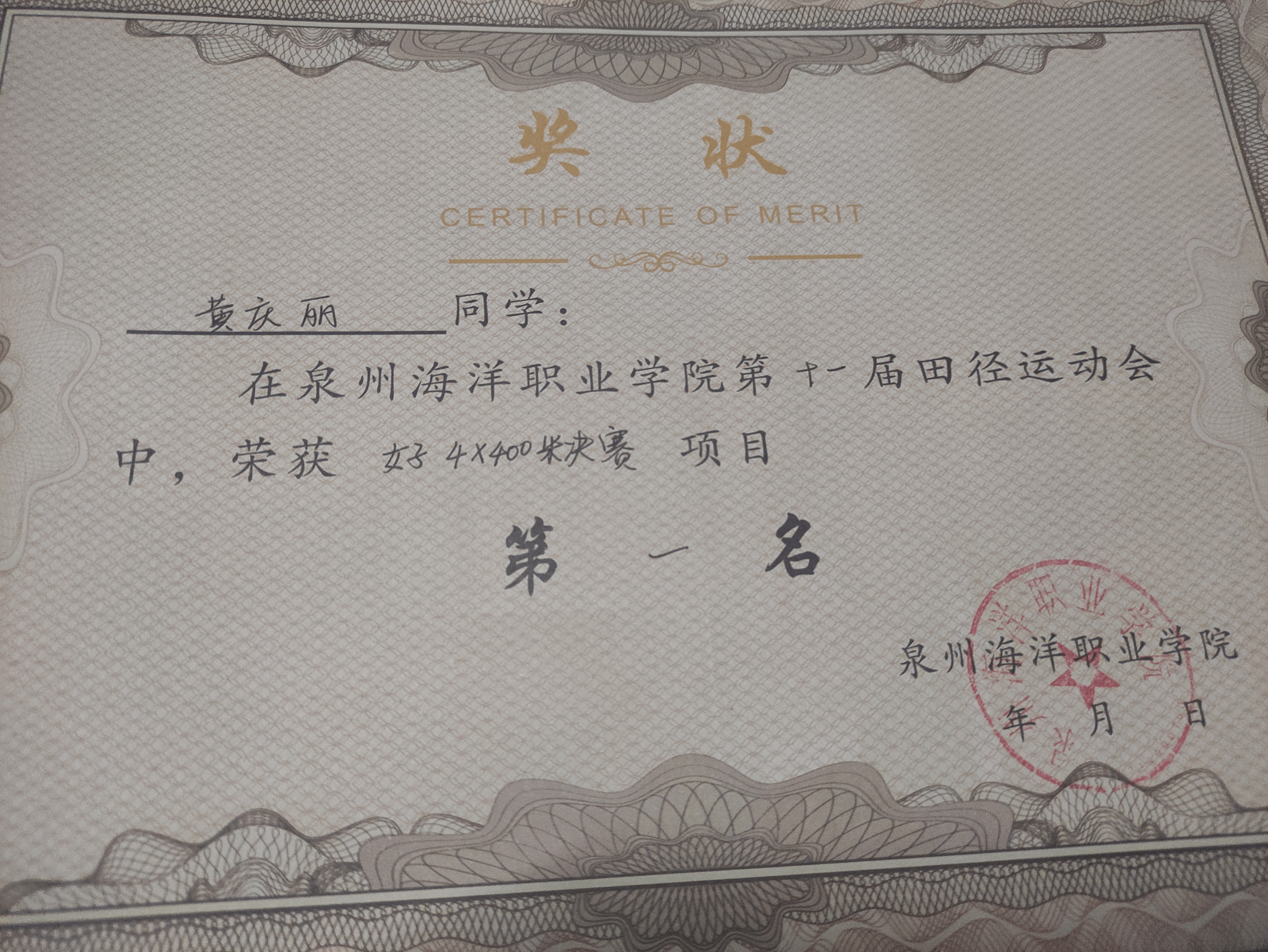 黄庆丽,女,共青团员,2024-2025学年专业成绩排名5/156,综合测评成绩排名3/156,曾获泉州海洋职业学院“优秀共青团员”“优秀学生标兵”“福建省优秀志愿者”“女子1500米第二名”“校运会女子4×400第一名”等奖项。志愿服务时长共361小时。