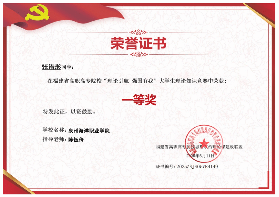 张语彤,女,共青团员,健康休闲学院护理2402班学生,现担任院心理辅导站学生站长。2024—2025学年专业成绩排名3/590,综合测评成绩排名3/590,曾获泉州海洋职业学院“优秀学生干部”、福建省高职高专院校“理论引航 强国有我”大学生理论知识竞赛一等奖、石狮市第七届校园心理情景剧大赛三等奖、泉州海洋职业学院第四届校园心理剧大赛决赛二等奖等荣誉奖项。持有普通话水平测试二甲等级证书、计算机一级等级证书。志愿服务时长422.33小时。