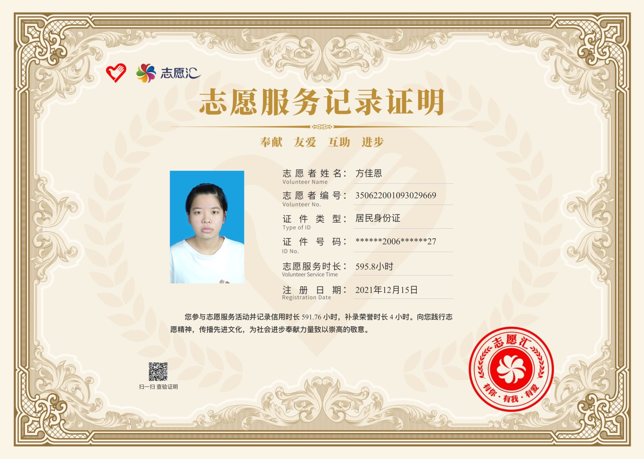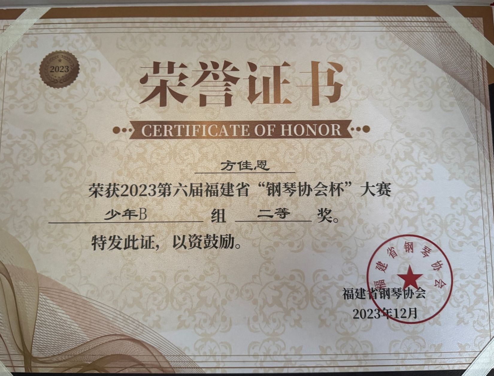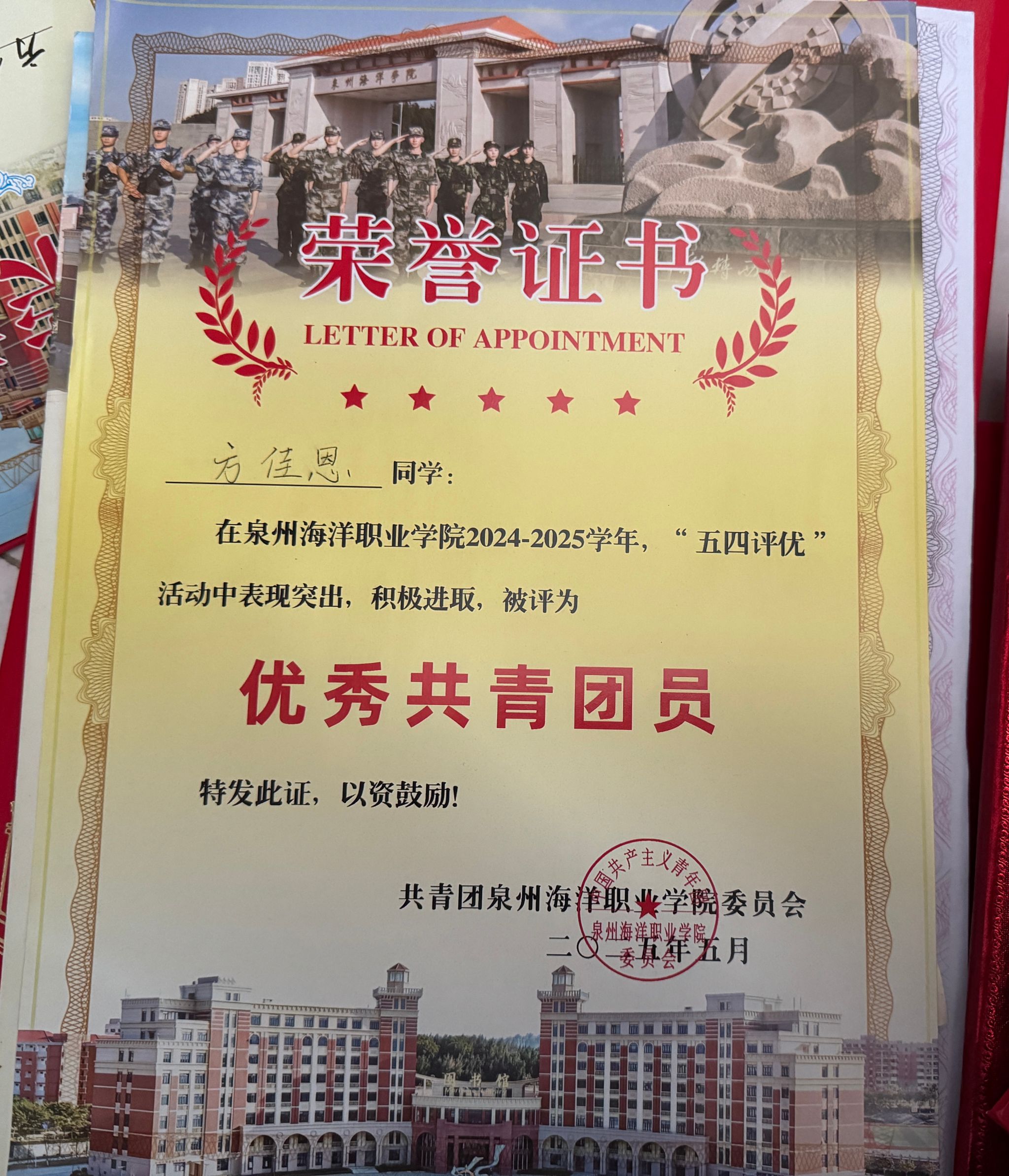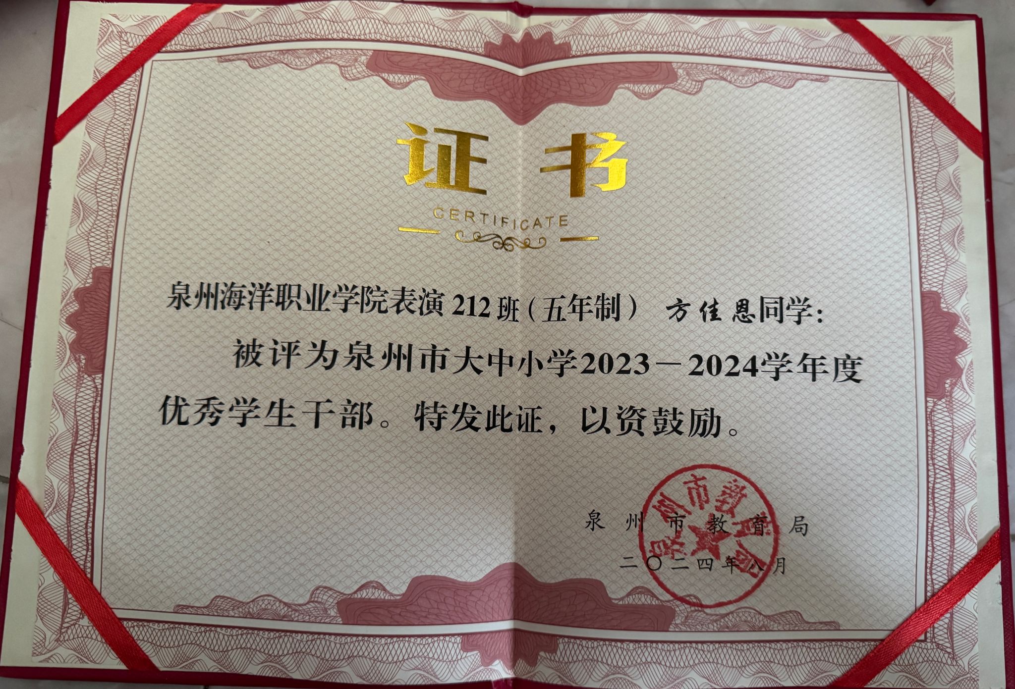 方佳恩,女,共青团员,健康休闲学院表演212班(五年制)班长。2024—2025学年专业成绩排名1/87,综合测评成绩排名1/87。曾获泉州海洋职业学院英语协会“优秀社员”“优秀学生干部”“优秀学生标兵”“最美志愿者”“资助优秀志愿者”等荣誉称号。曾获福建省钢琴协会杯二等奖、莫斯科国际音乐节·友谊之桥中国区总预选三等奖。志愿服务时长595小时。