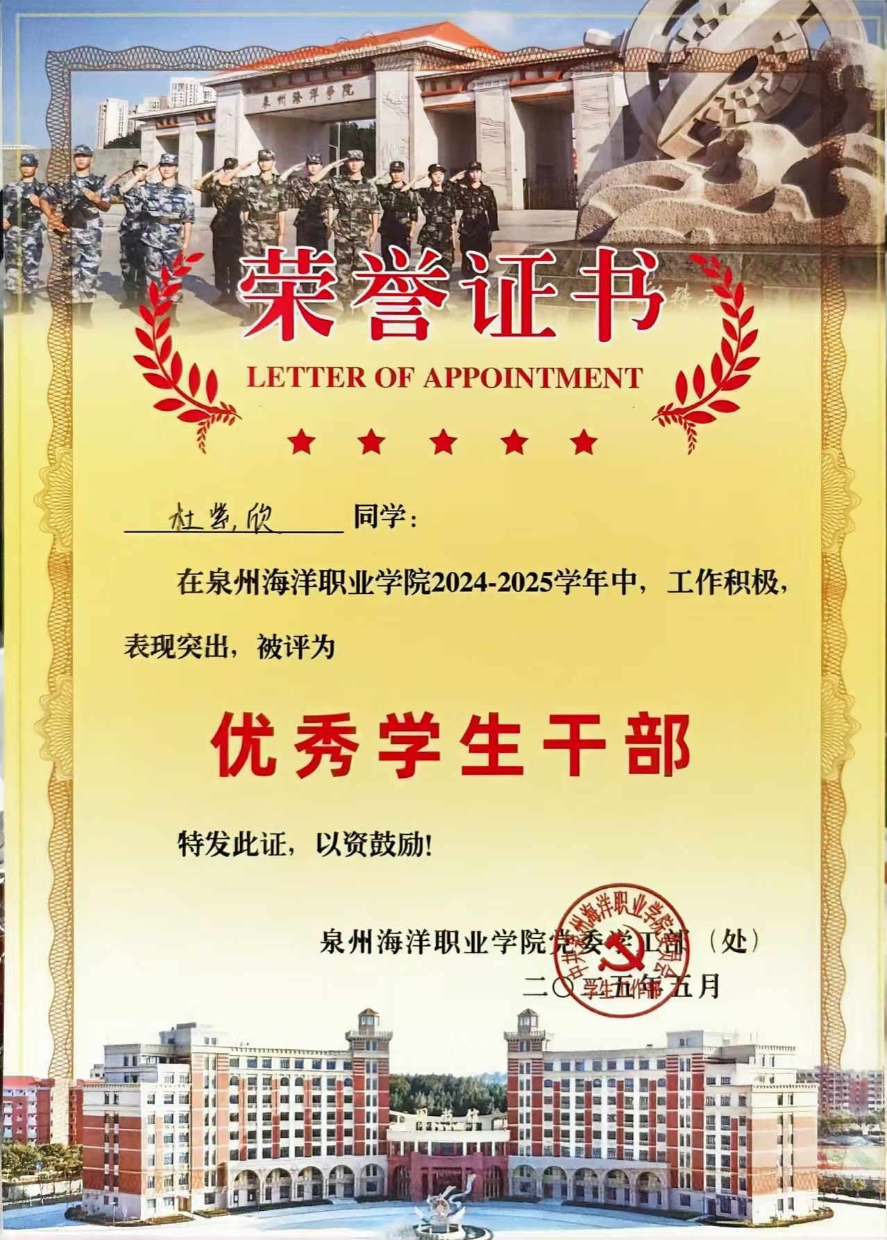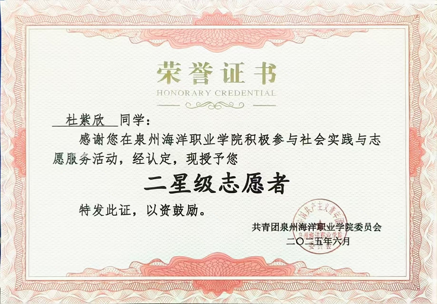 杜紫欣,女,共青团员,健康休闲学院护理2307班学习委员,曾担任校红十字会应急医疗管理中心第一负责人。2024—2025学年专业成绩排名5/530,综合测评成绩排名2/530人。曾荣获泉州海洋职业学“优秀学生干部”“二星级志愿者”等荣誉。持有计算机一级等级证书和红十字救护员证。志愿服务时长达347小时。