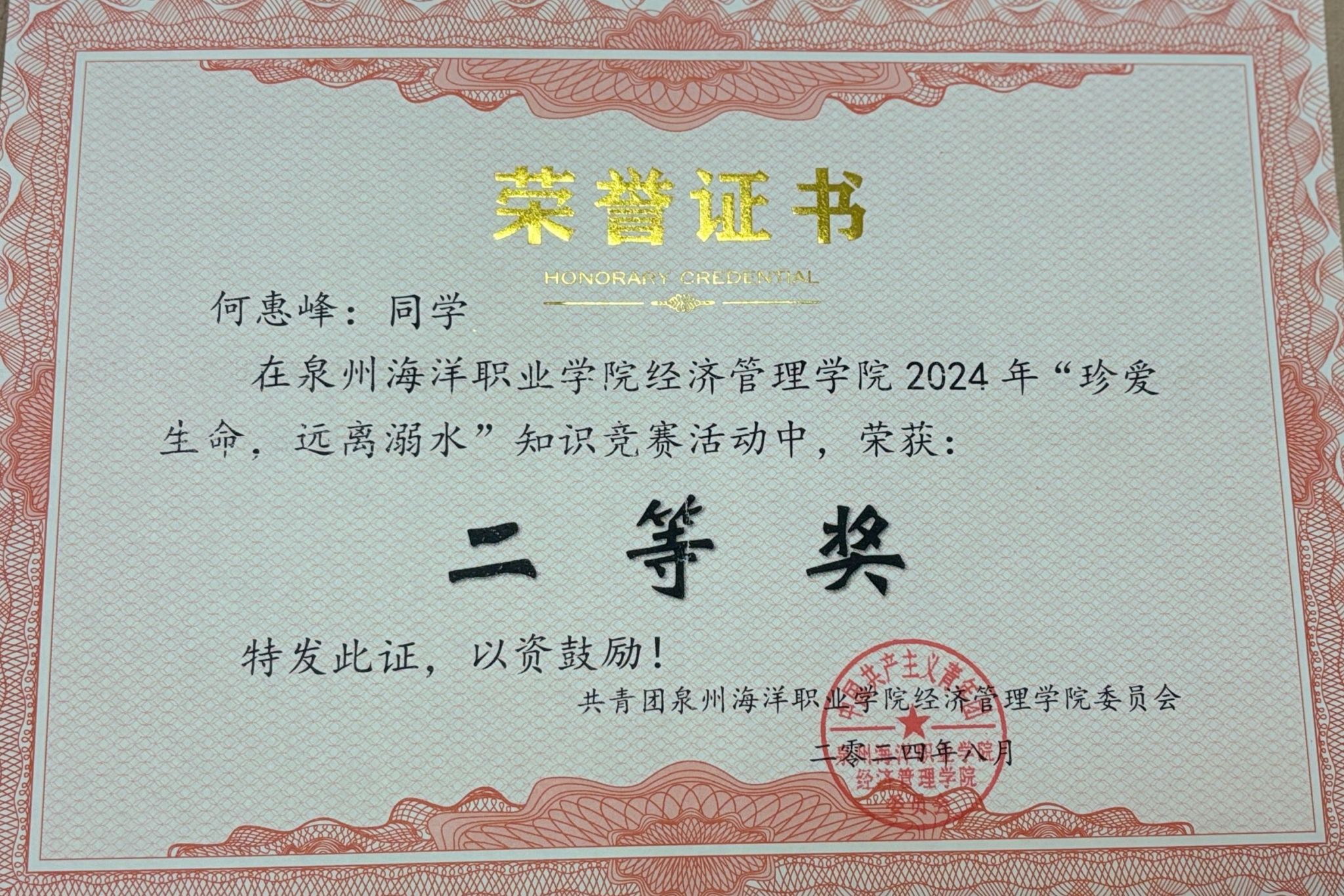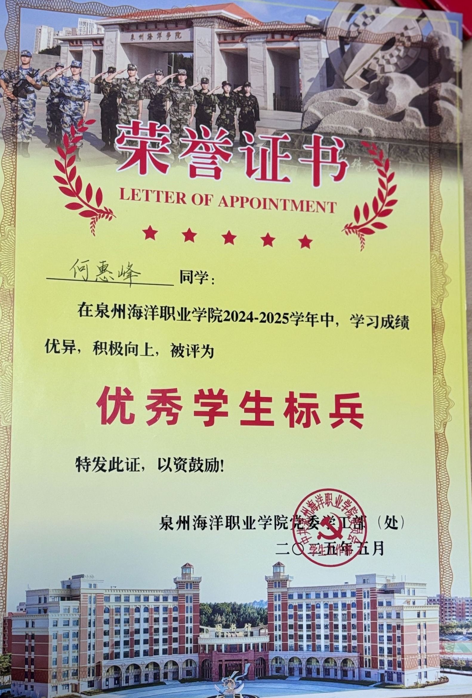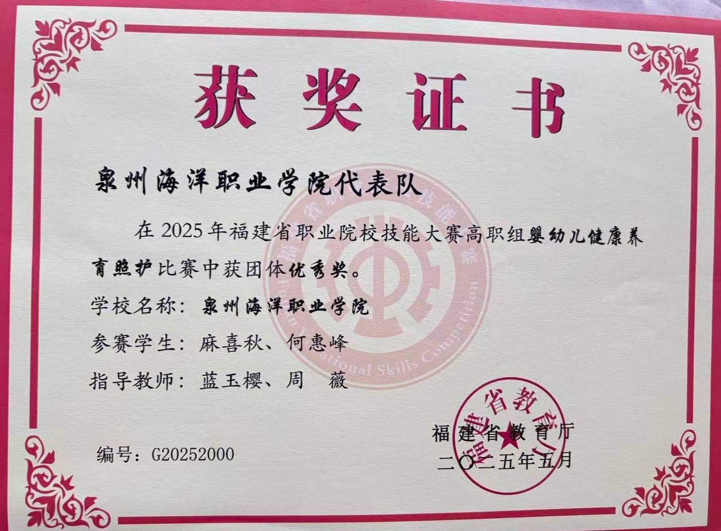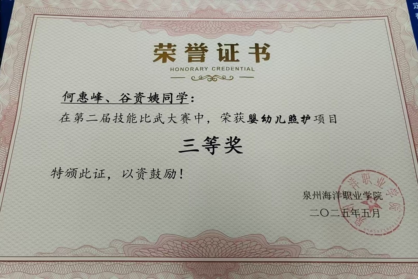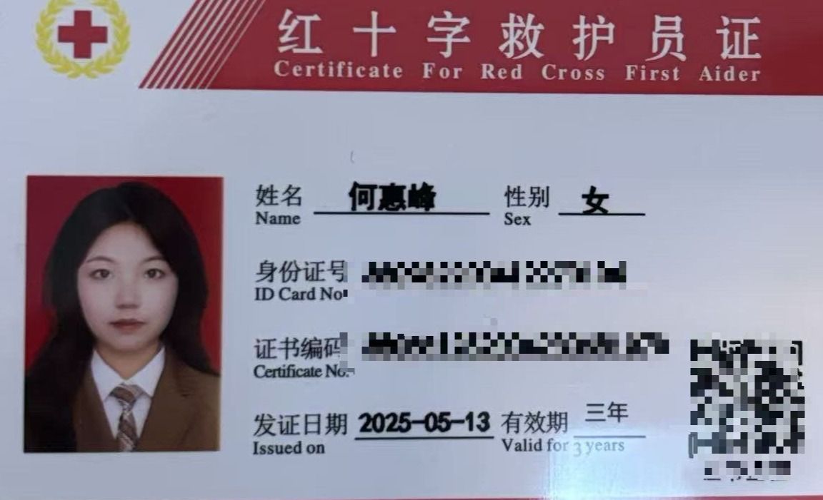何惠峰,女,共青团员,健康休闲学院护理2307班学生。2024—2025学年专业成绩17/530,综合测评成绩排名5/530。曾获福建省职业院校技能大赛高职组婴幼儿健康养育照护团体优秀奖、泉州海洋职业学院第二届技能比武大赛婴幼儿照护项目三等奖、护理技能项目三等奖、2024—2025学年“优秀学生标兵”等荣誉。持有红十字救护员证、养老护理员证、计算机一级等级等证书。志愿服务时长达100小时。