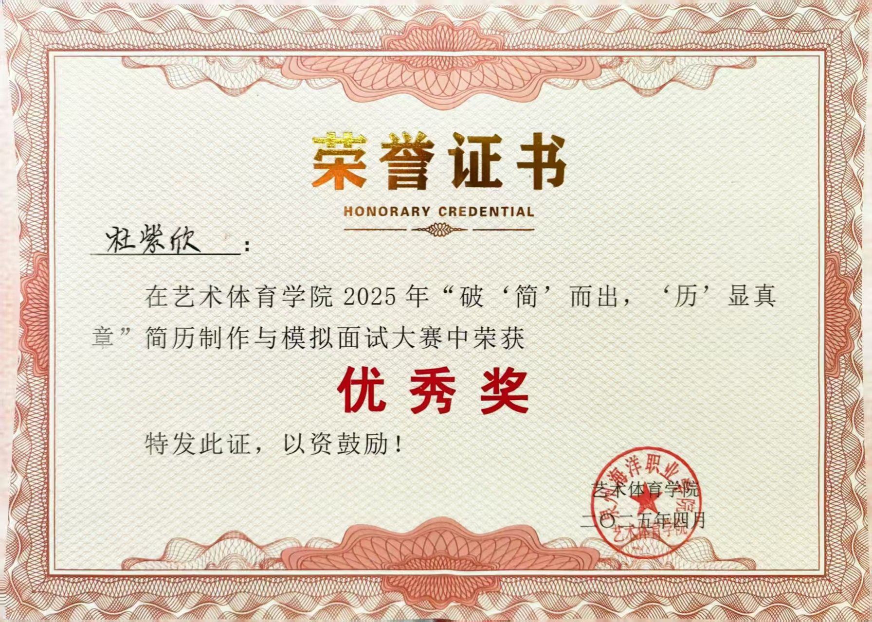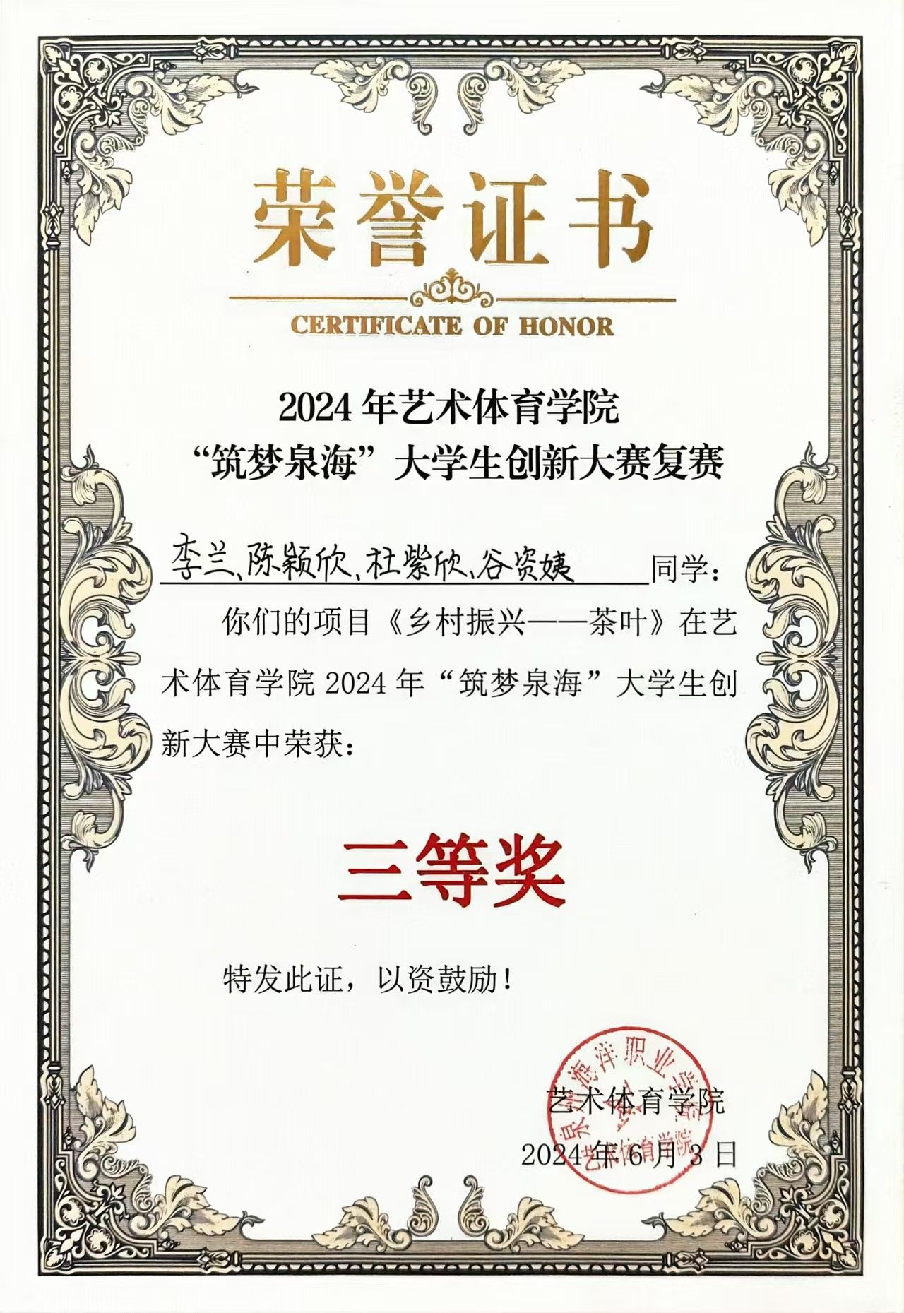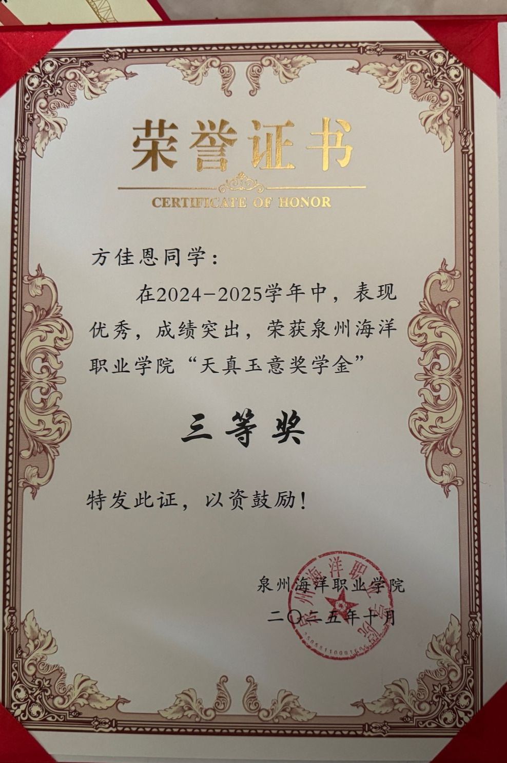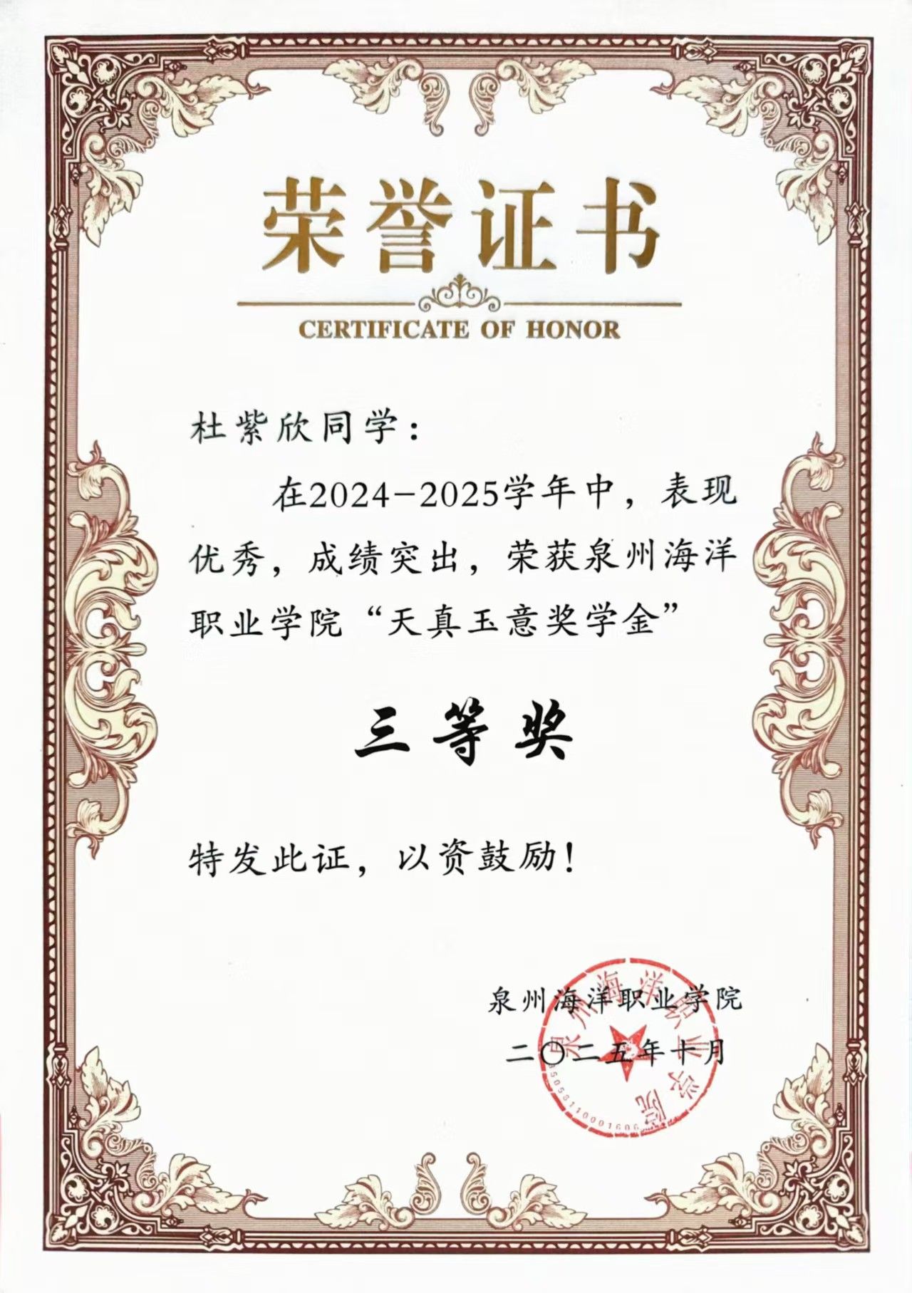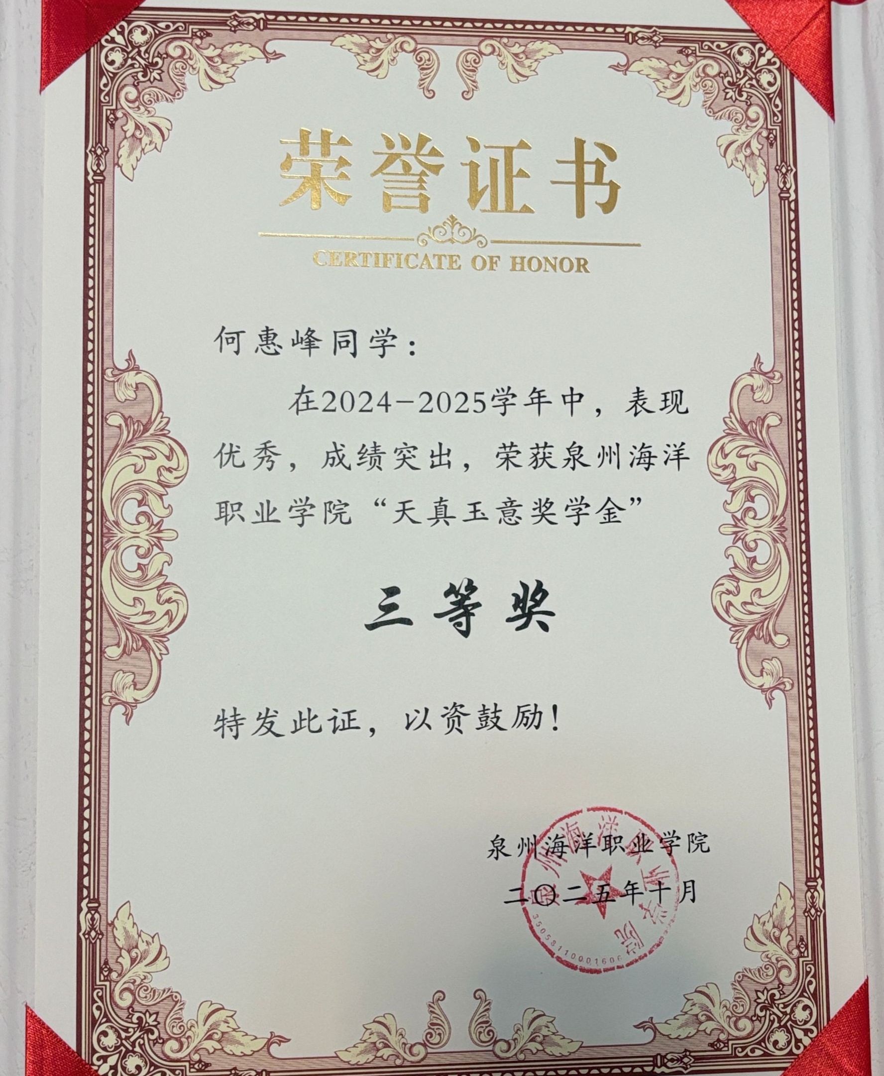 天真玉意奖学金三等奖