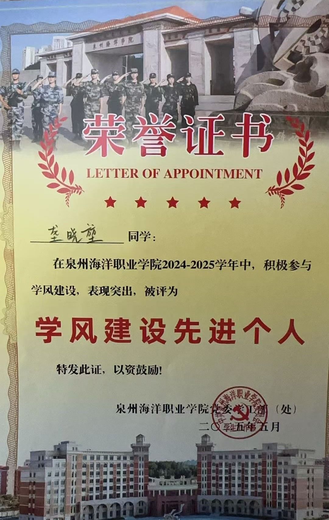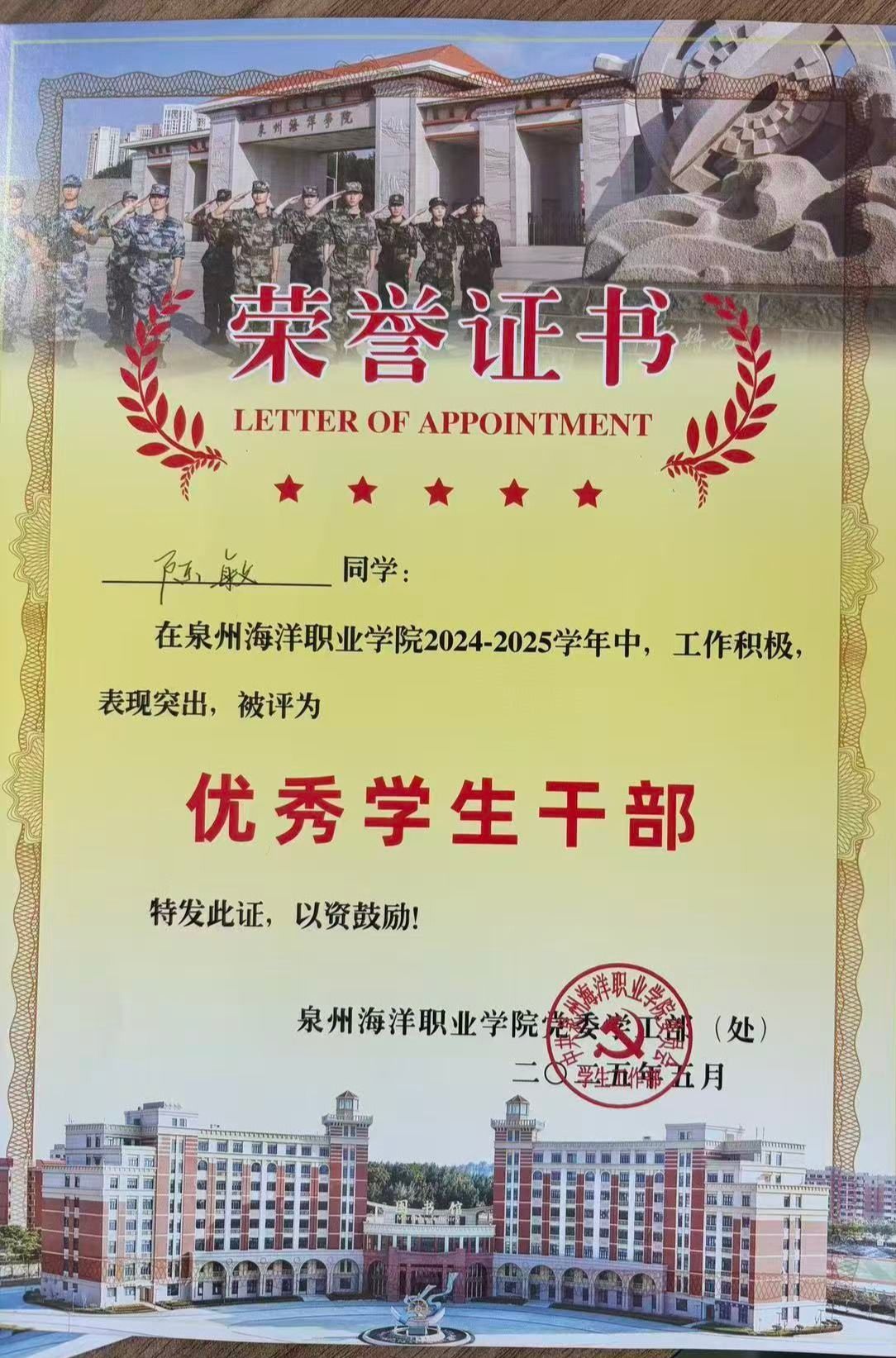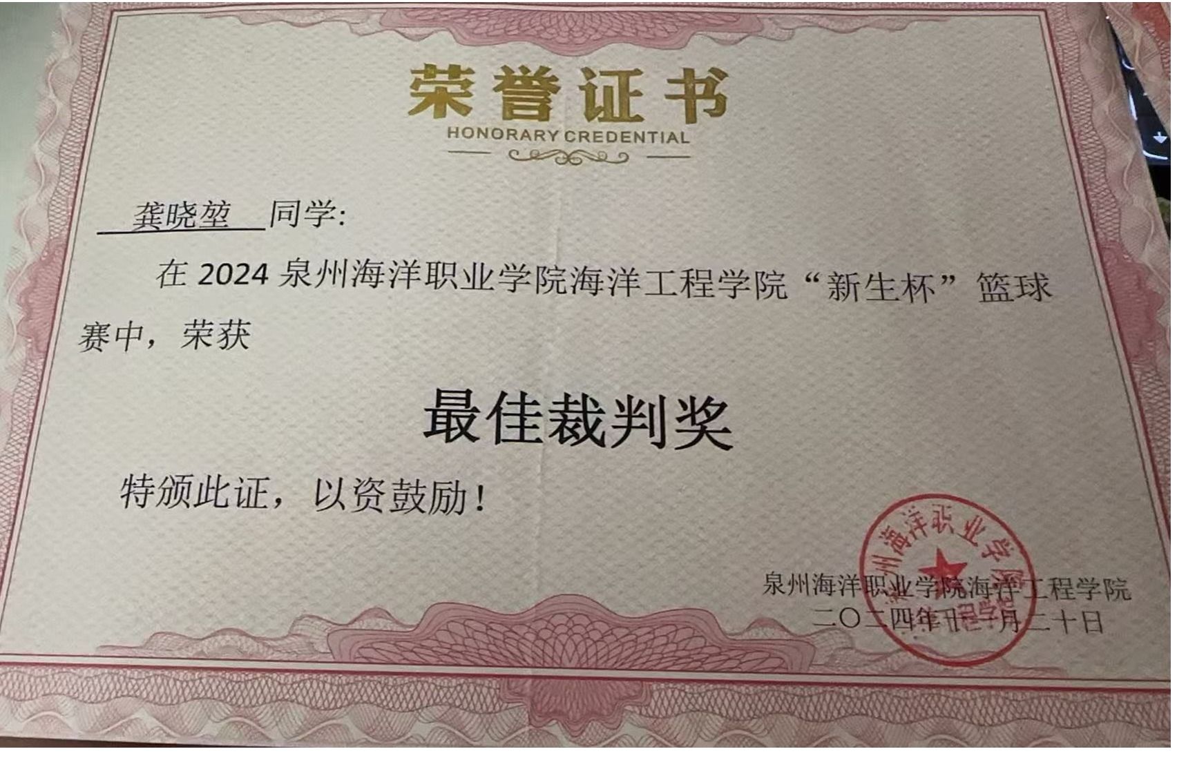 龚晓堃,男,共青团员,健康休闲学院社体212(五年制)班副班长、校篮球社社长。2024—2025学年专业成绩排名4/67,综合测评成绩排名1/67。曾获泉州海洋职业“三好学生”“学风建设个人”“最佳裁判”等荣誉称号。志愿服务时长114小时。